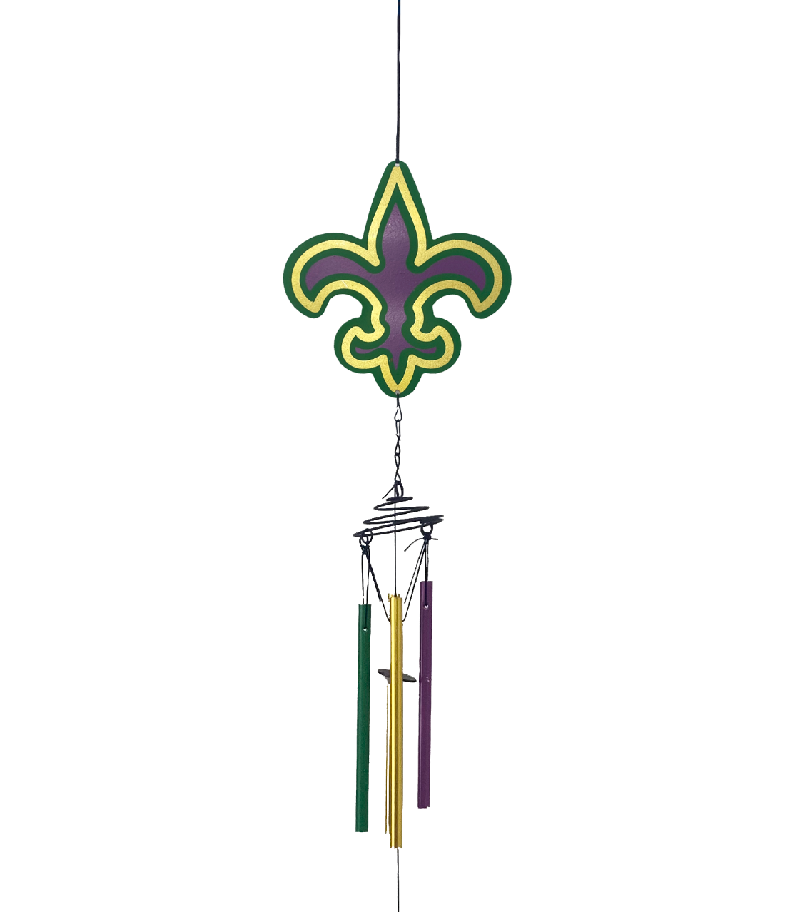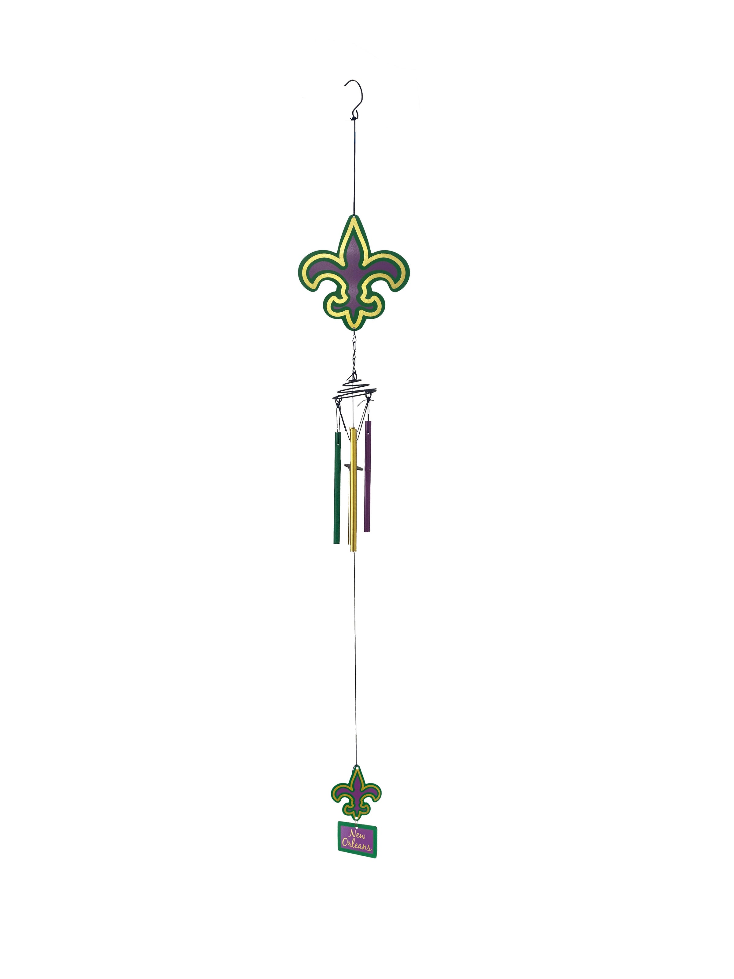 Make a statement with this beautiful and unique purple, green, and gold Fleur de Lis wind chime! Hang it up and watch it sway in the wind, adding a festive touch to any outdoor space.