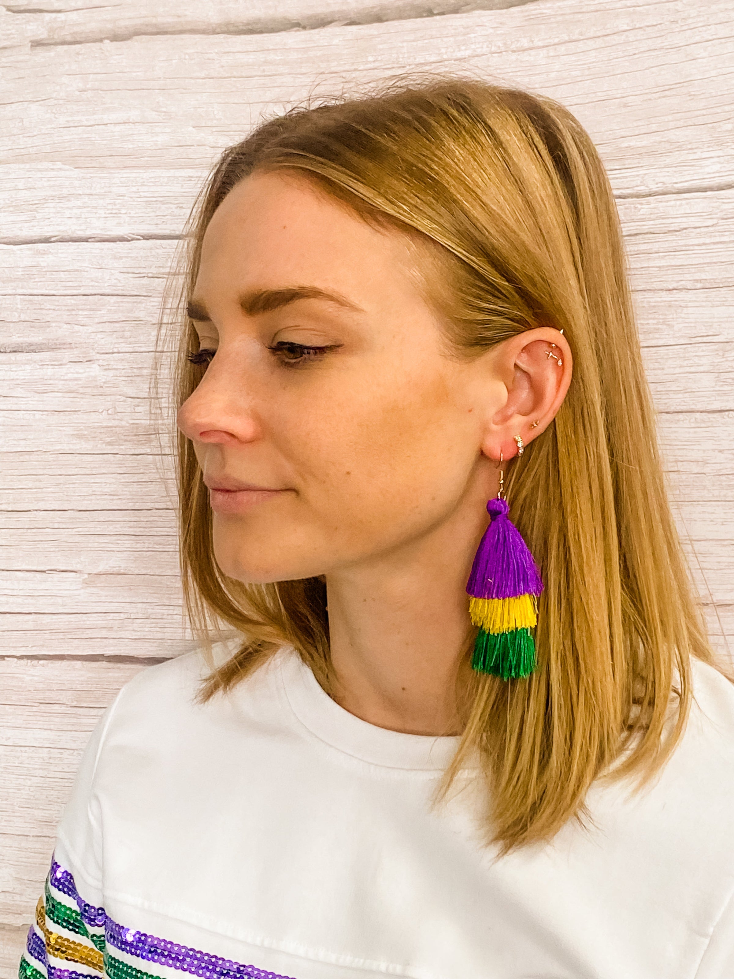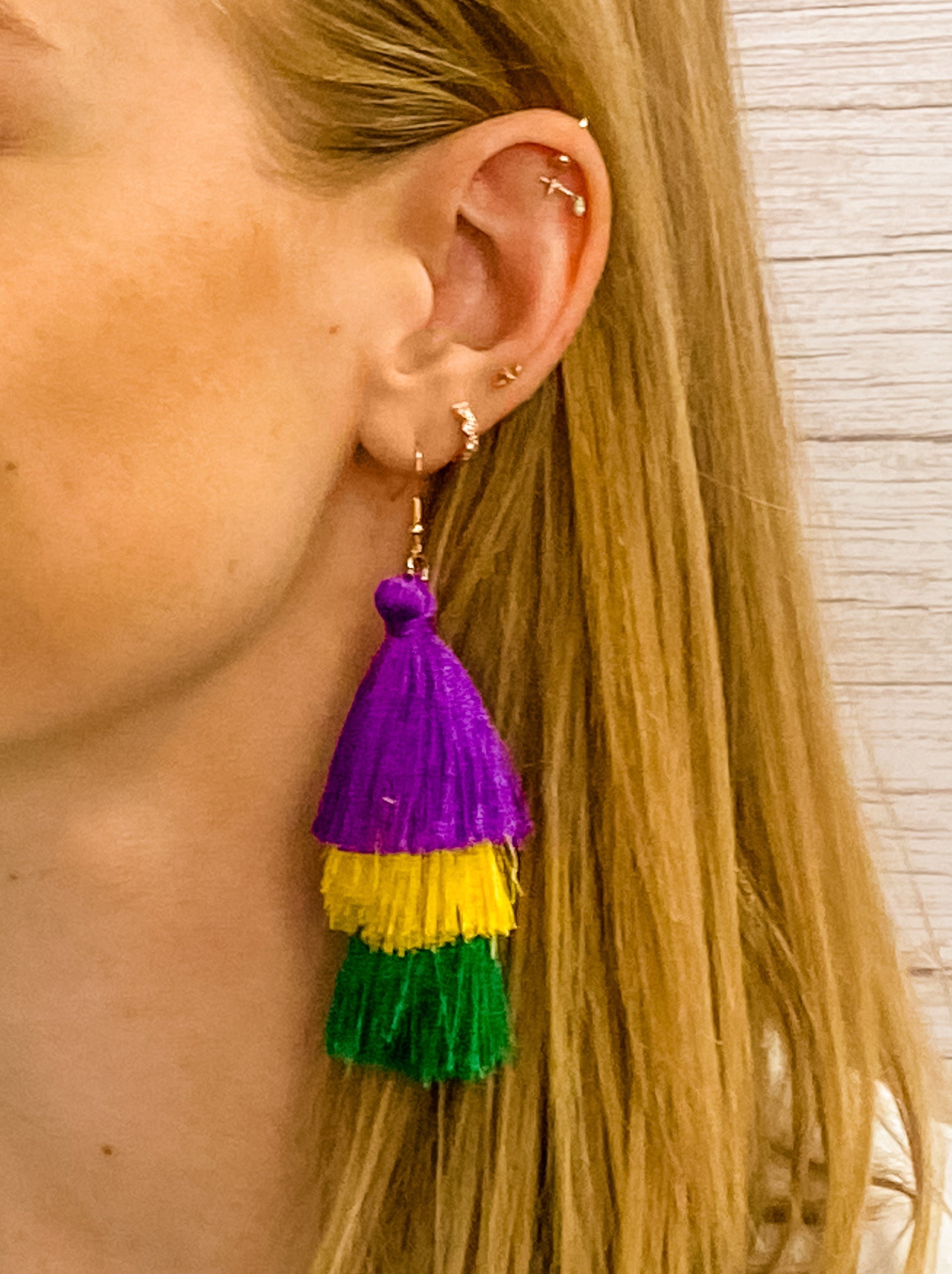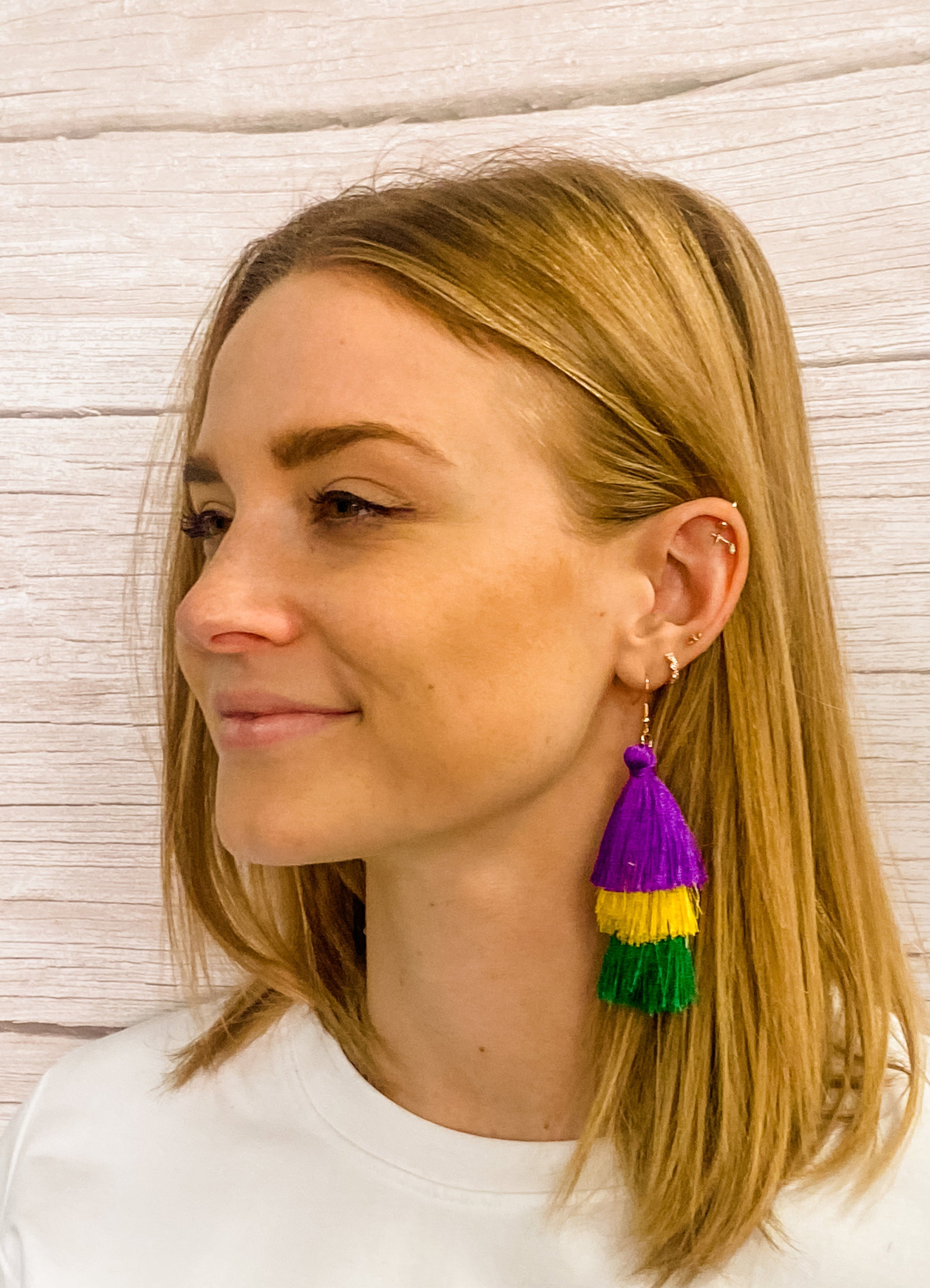 These stylish purple, green and gold tassel earrings are the perfect finishing touch for all your Mardi Gras looks this season!