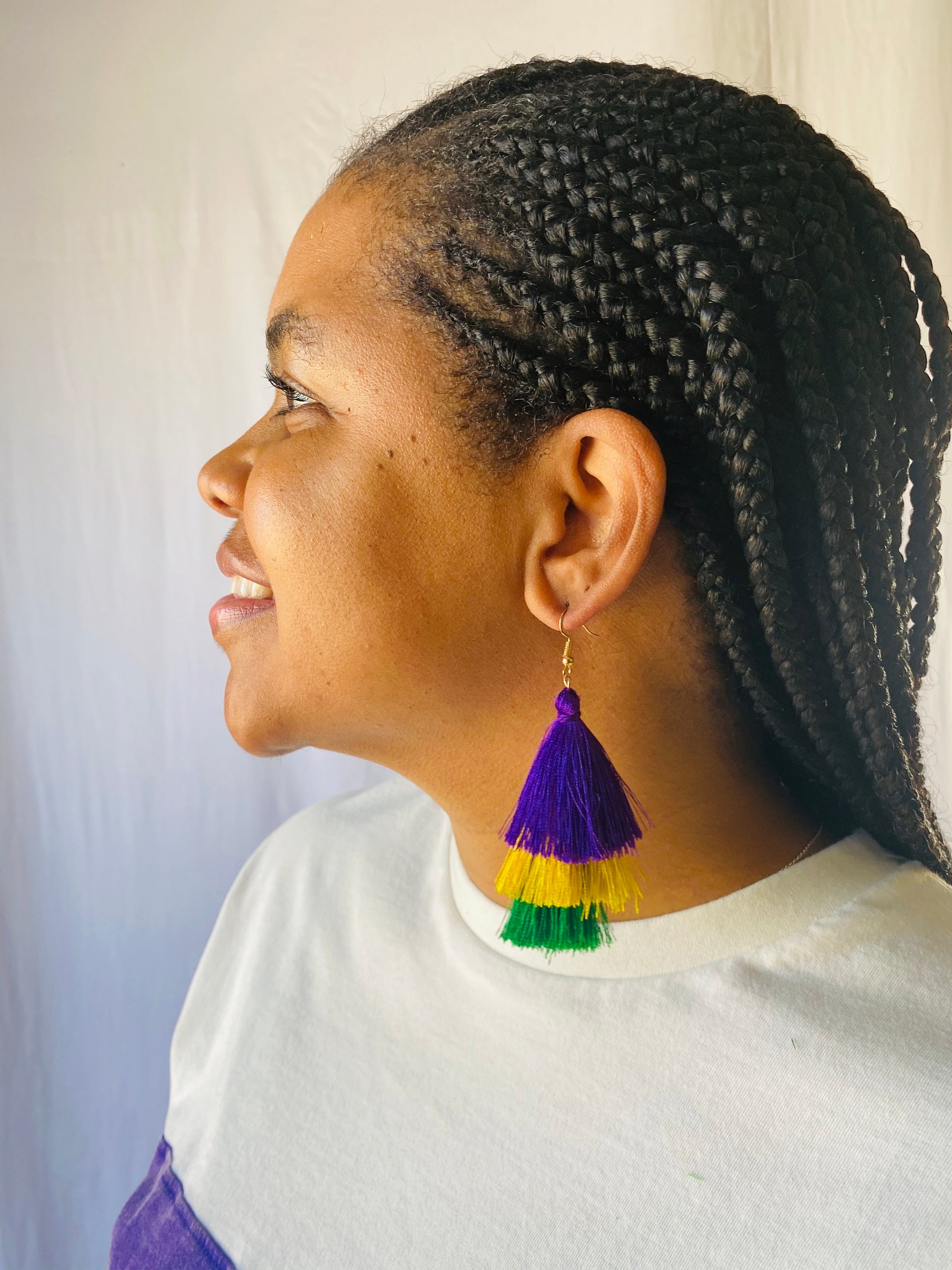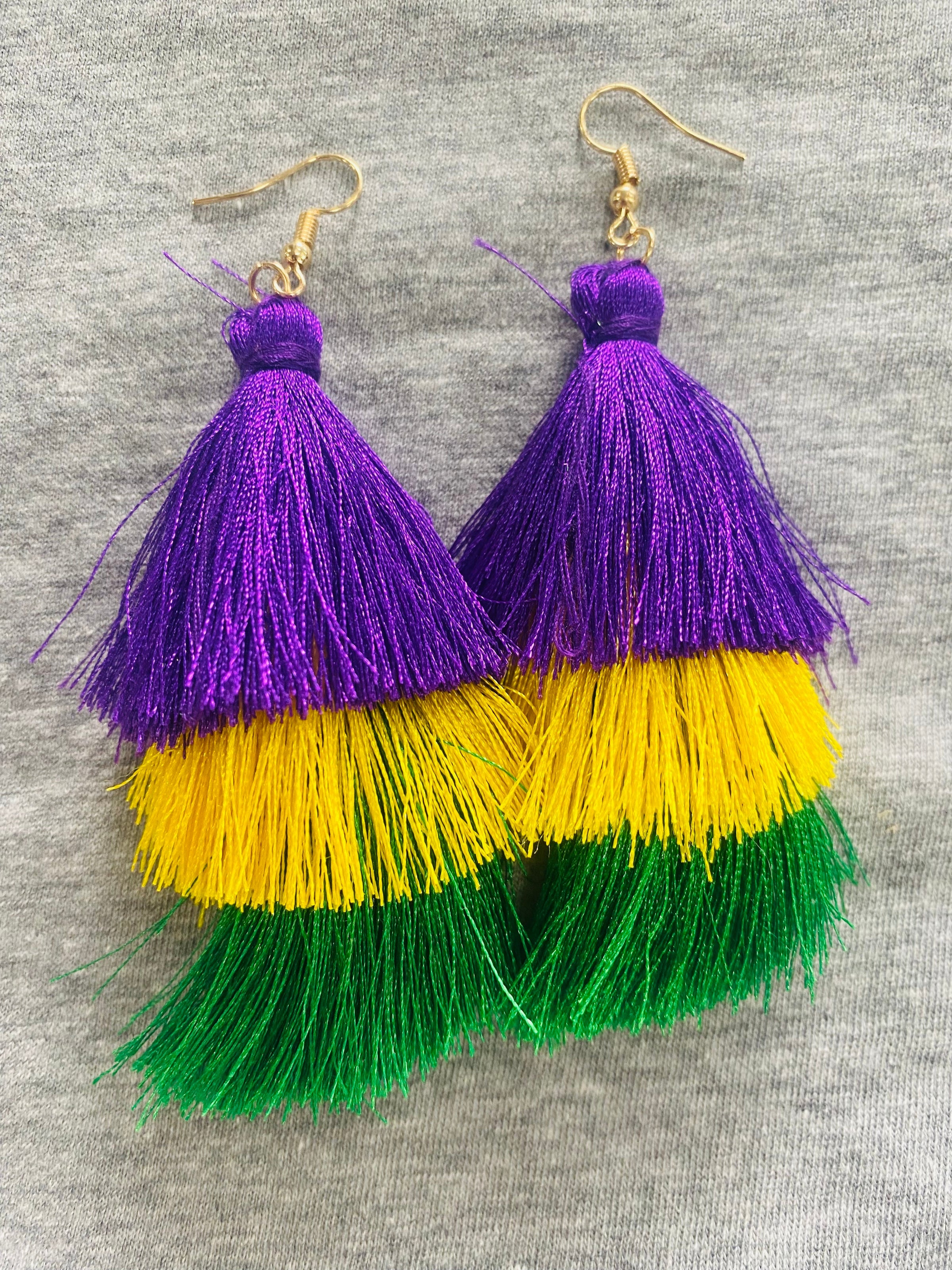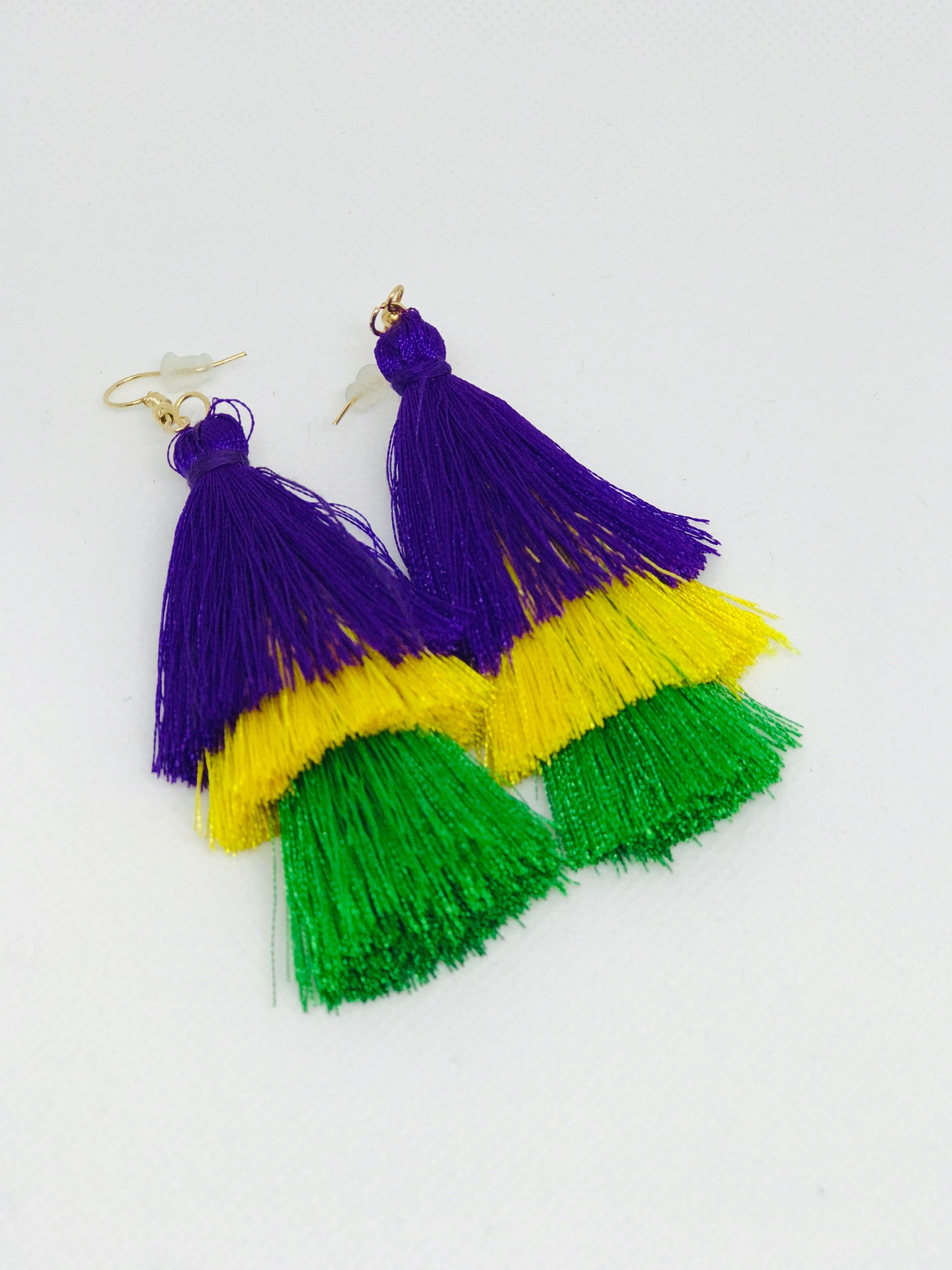 These stylish purple, green and gold tassel earrings are the perfect finishing touch for all your Mardi Gras looks this season!