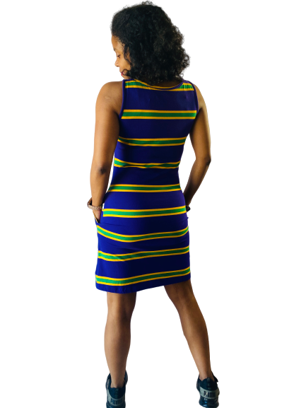 Celebrate Mardi Gras with this stylish purple tank top dress with purple, green and gold small infinity stripes. This dress features green and gold stripes. Small lines of green and gold are around the edge of the pockets.