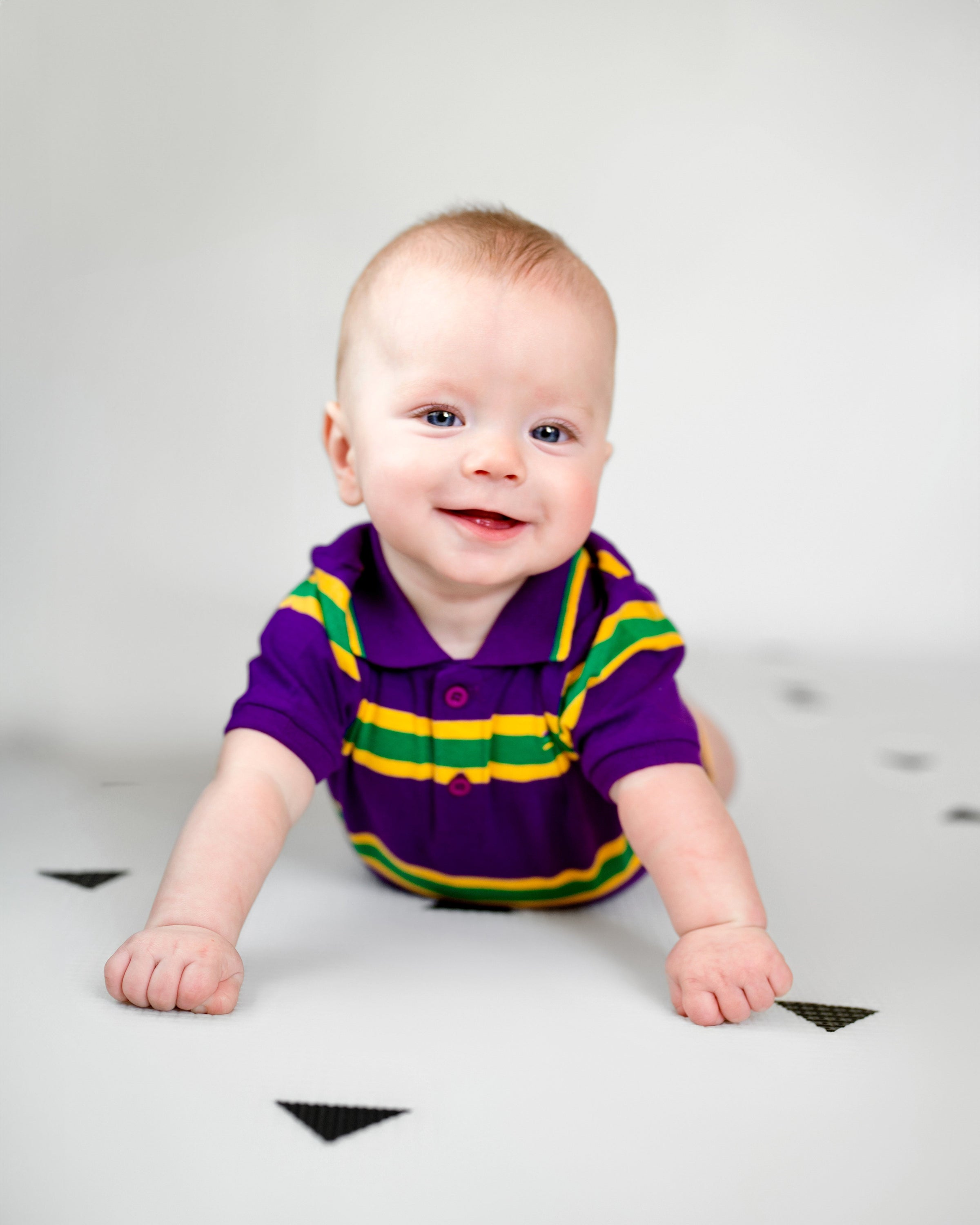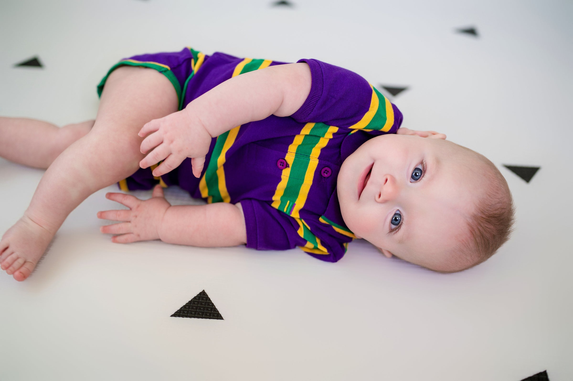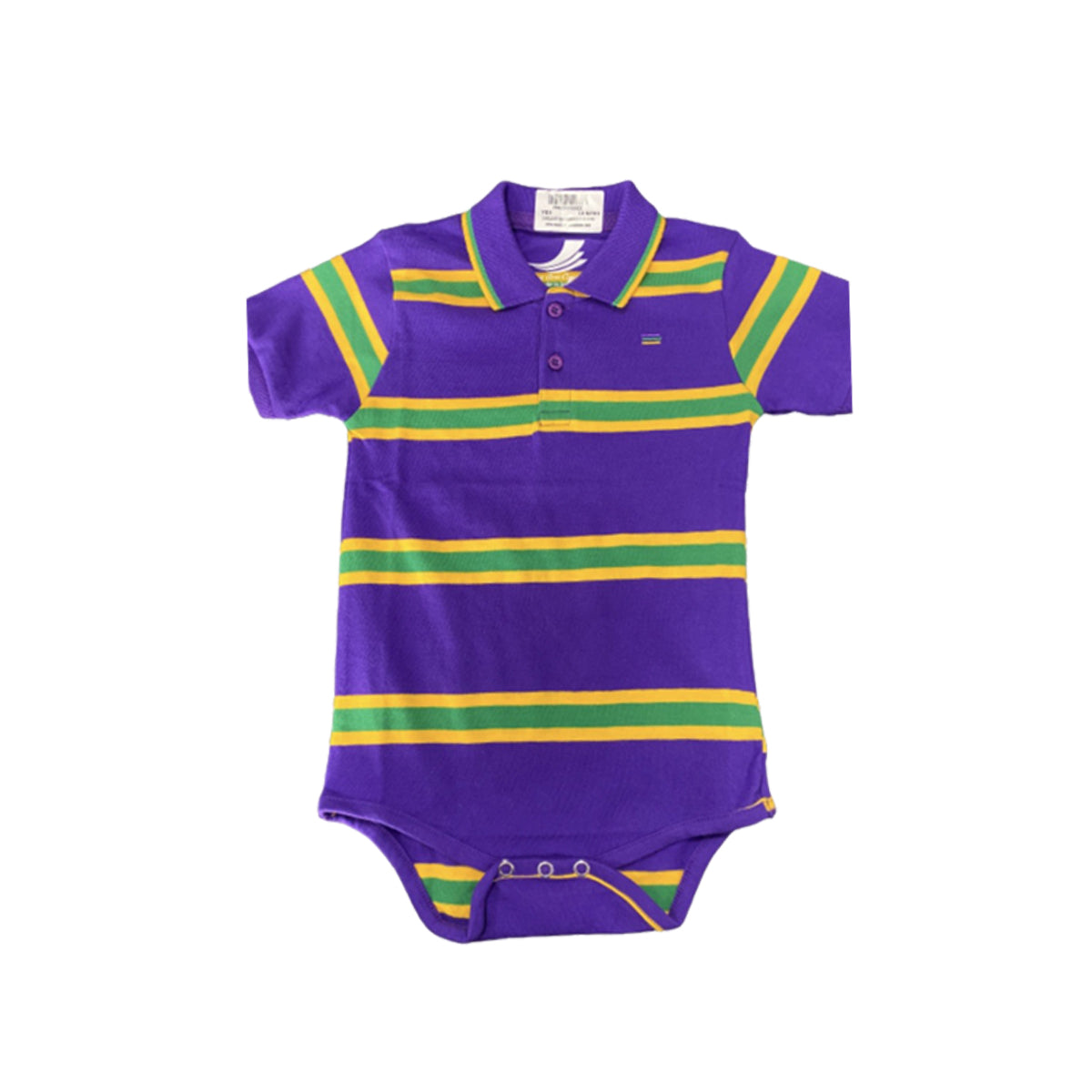 Celebrate Mardi Gras with this stylish purple short sleeved onesie with green and gold stripes. Three snaps close the bottom.