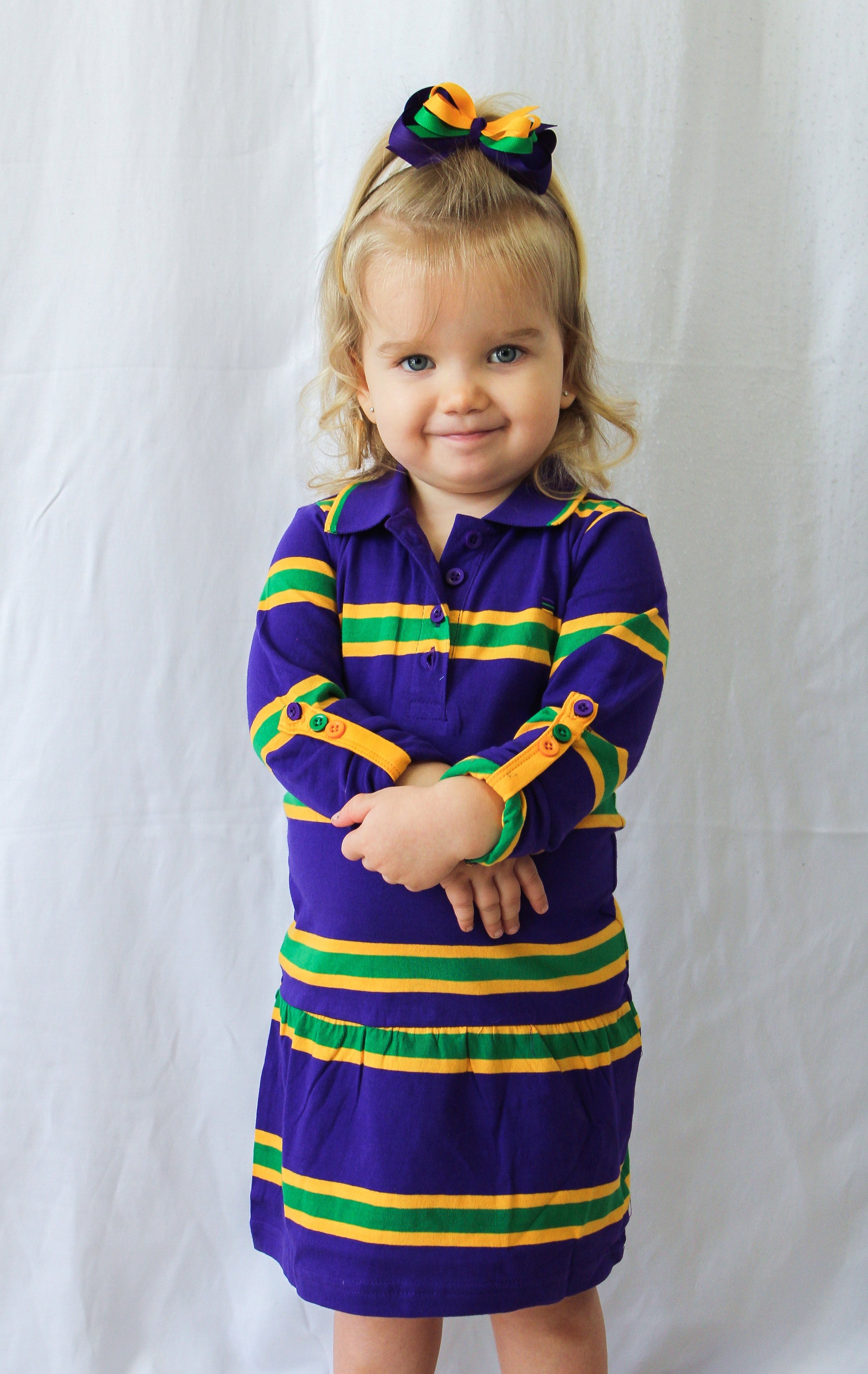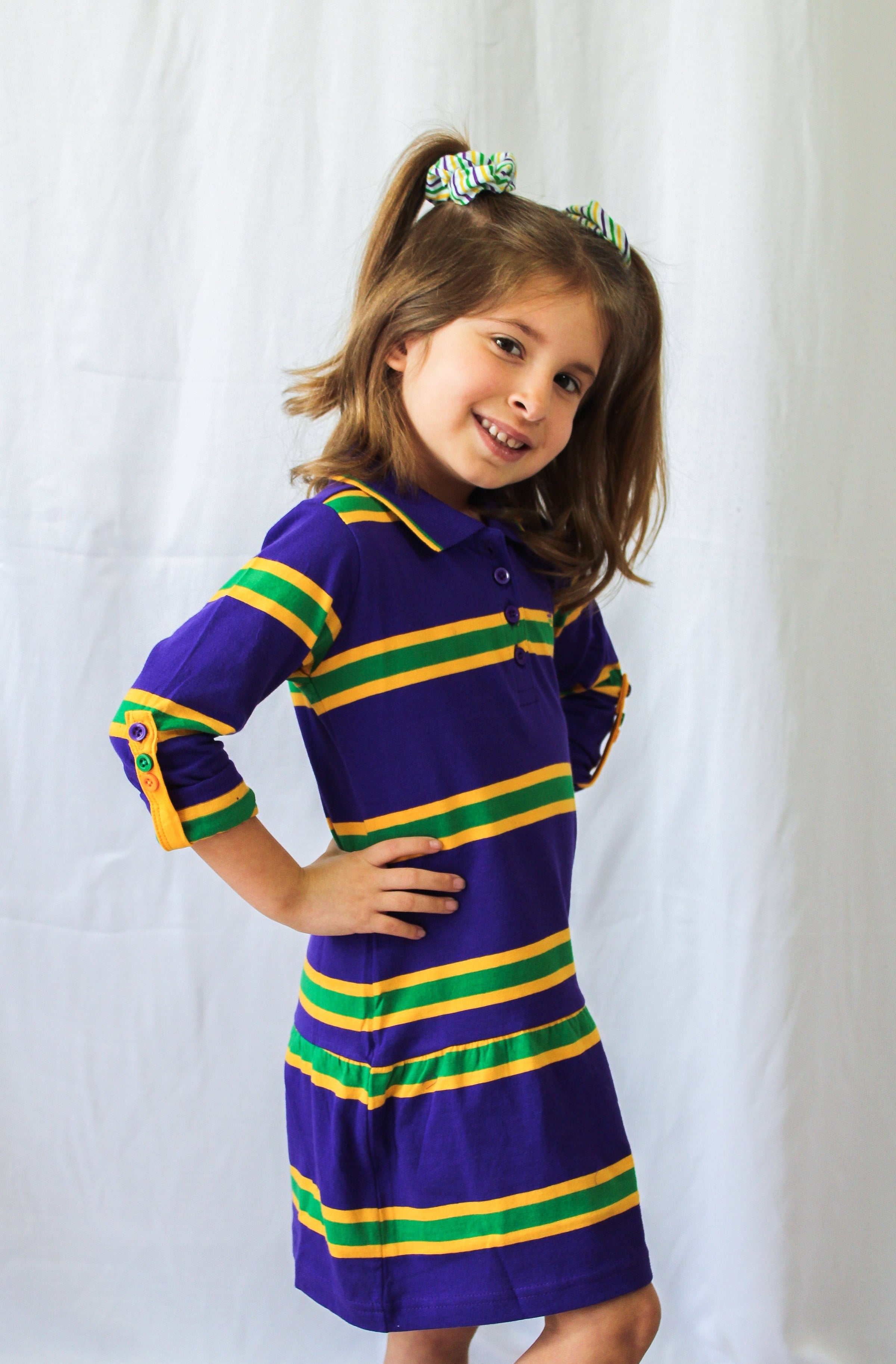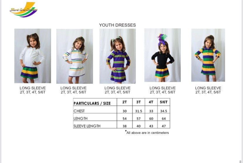 Celebrate Mardi Gras with this stylish purple long sleeved dress with green and gold stripes. This dress features small lines of green and gold are around the edge of the collar.
