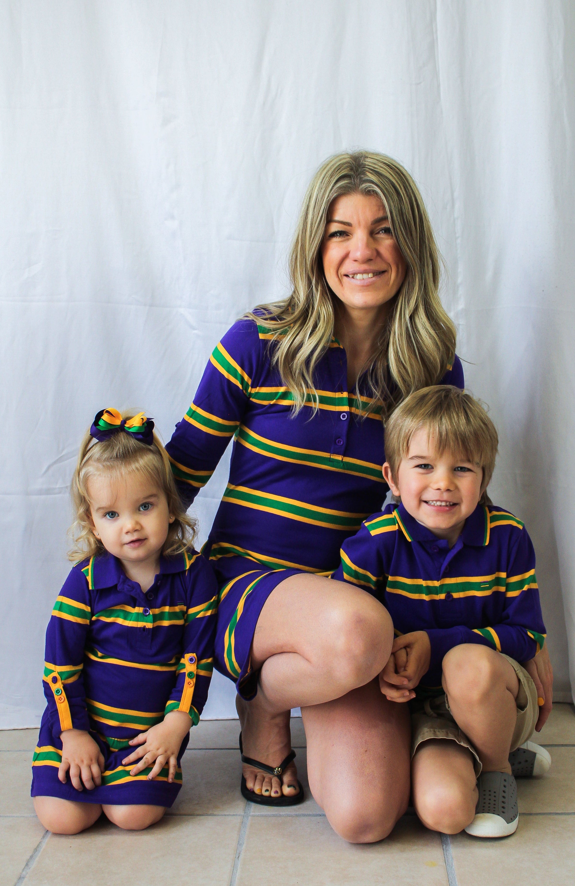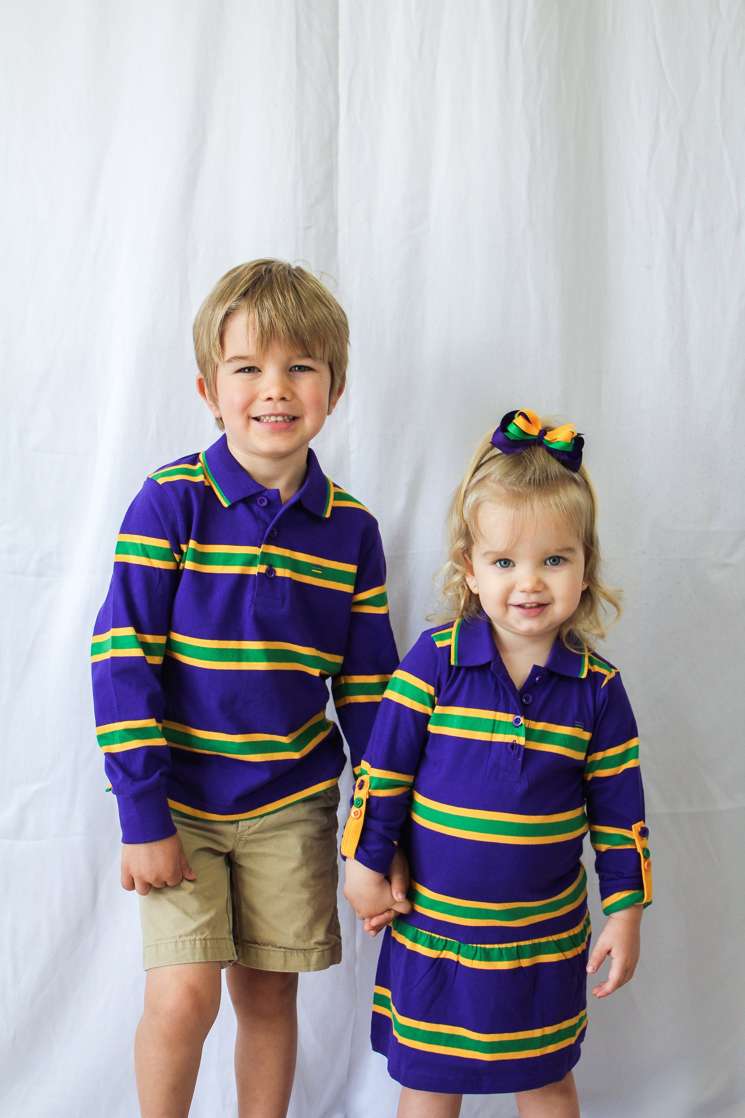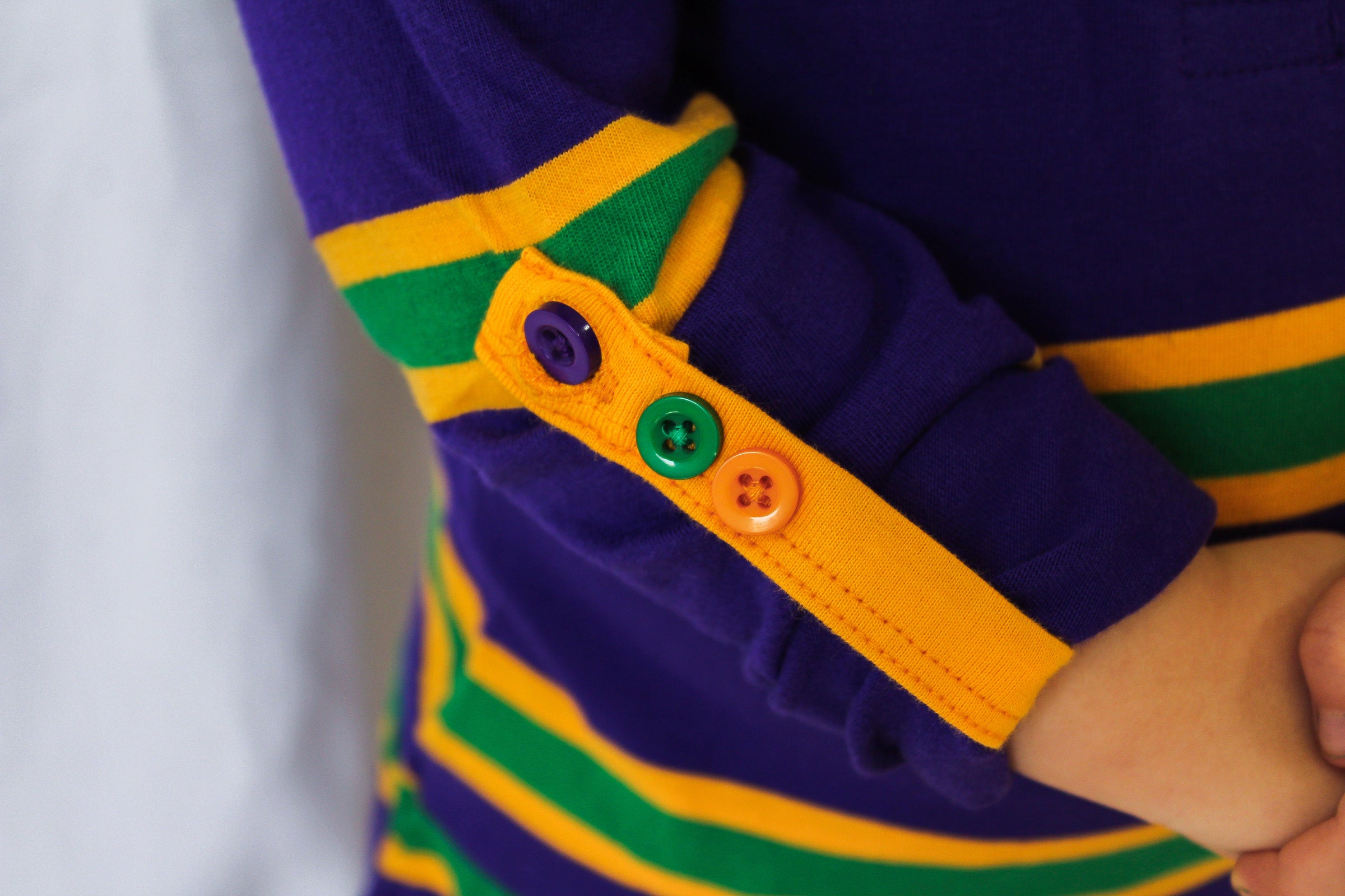 Celebrate Mardi Gras with this stylish purple long sleeved dress with green and gold stripes. This dress features small lines of green and gold are around the edge of the collar.