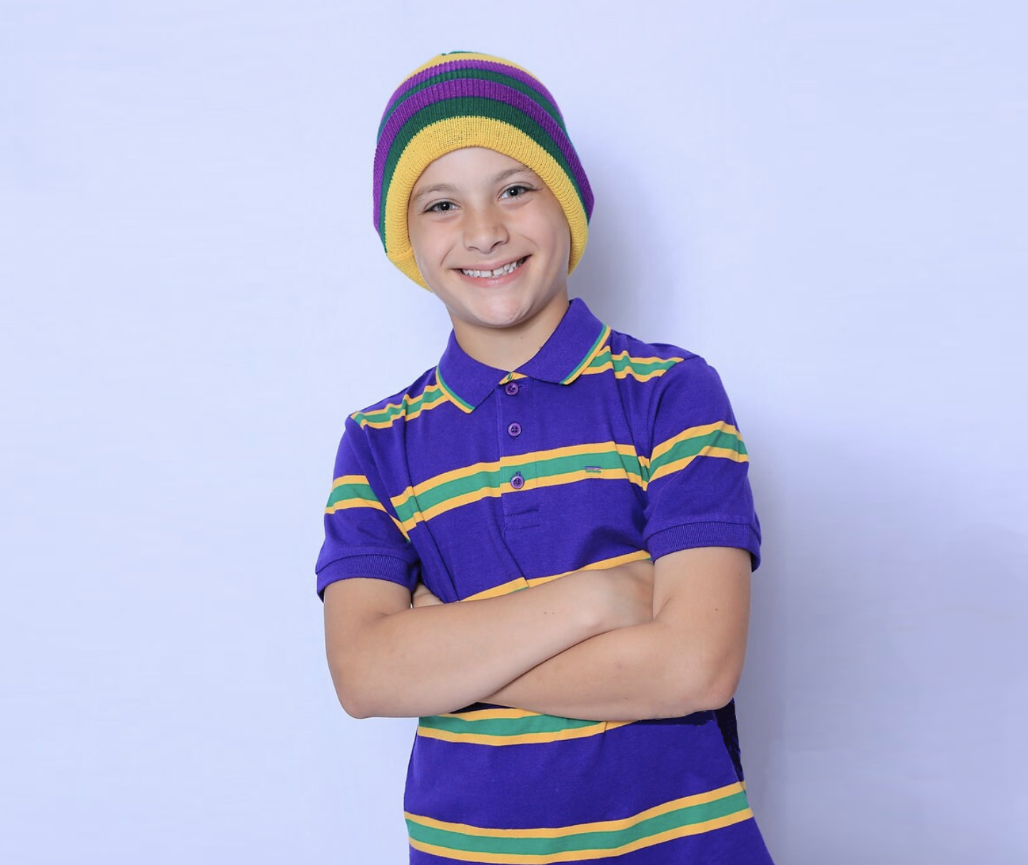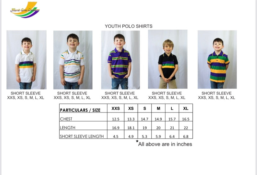 Celebrate Mardi Gras with this stylish kids purple short sleeved with purple stripes and smaller gold and green stripes. This shirt features thin purple, green and gold solid stripes. A purple collar is etched with smaller green and gold lines.