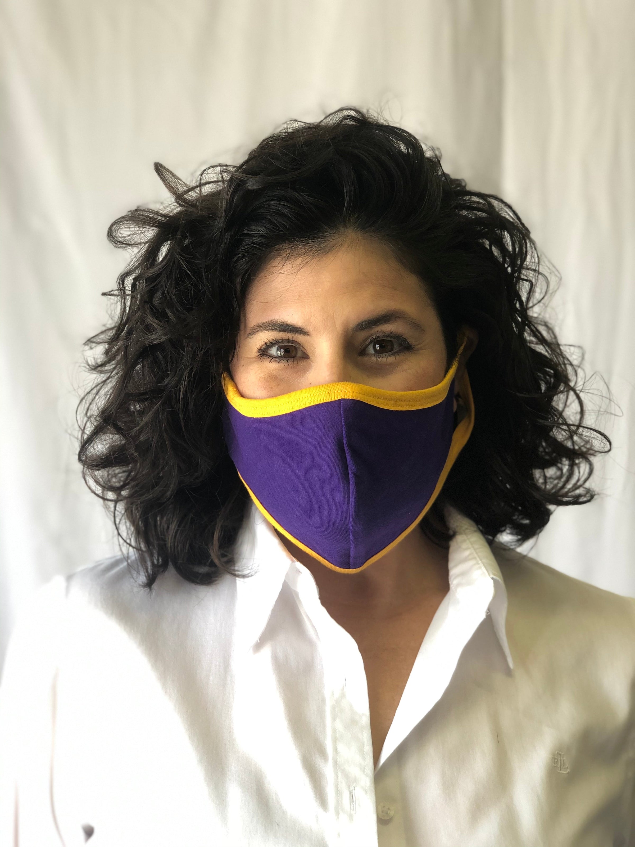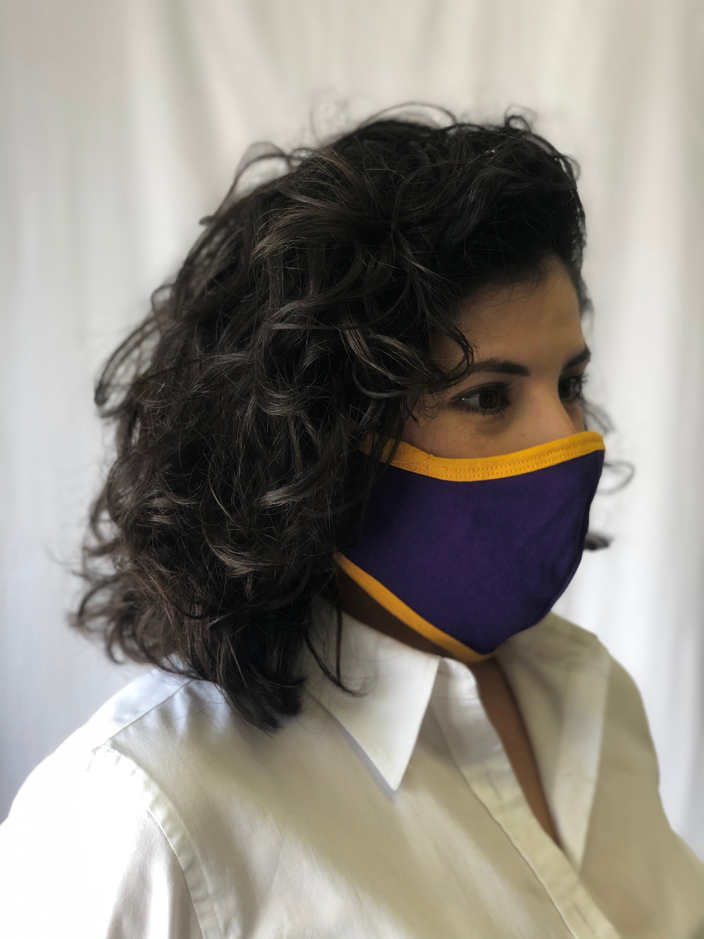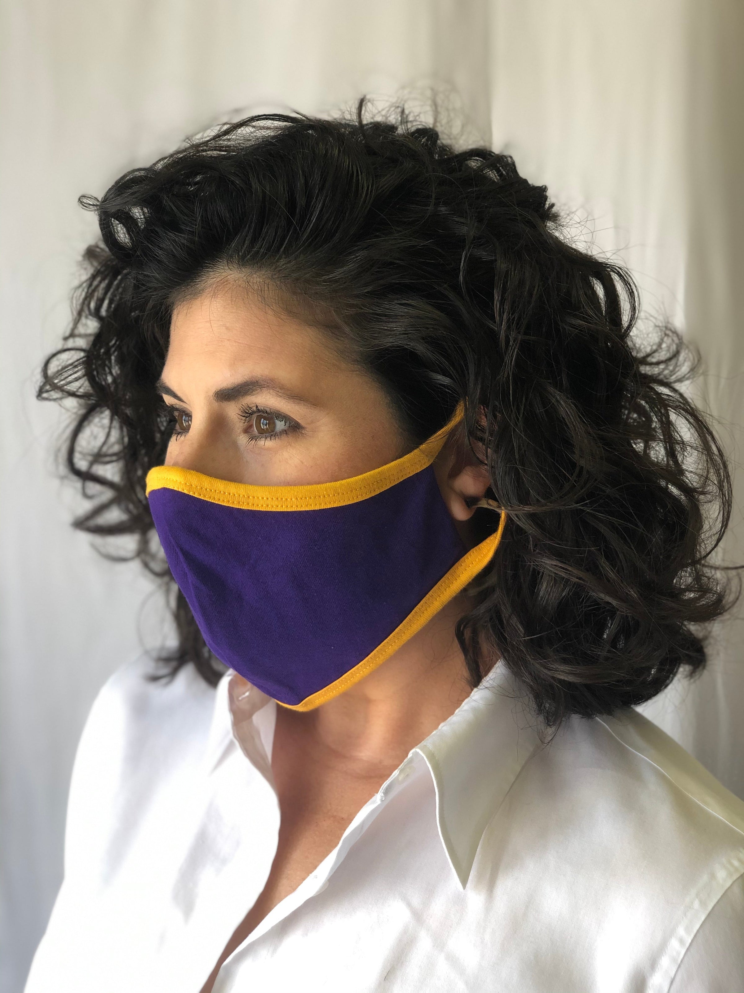 Mask Up in style! This reusable face mask is solid purple with a solid gold border and ear loops. One size fits most.