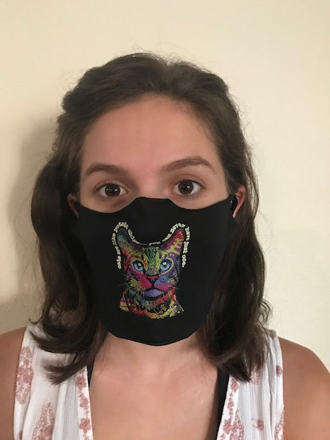 Mask Up in style! This black reusable face mask features a rainbow cat and ear loops. One size fits most.
