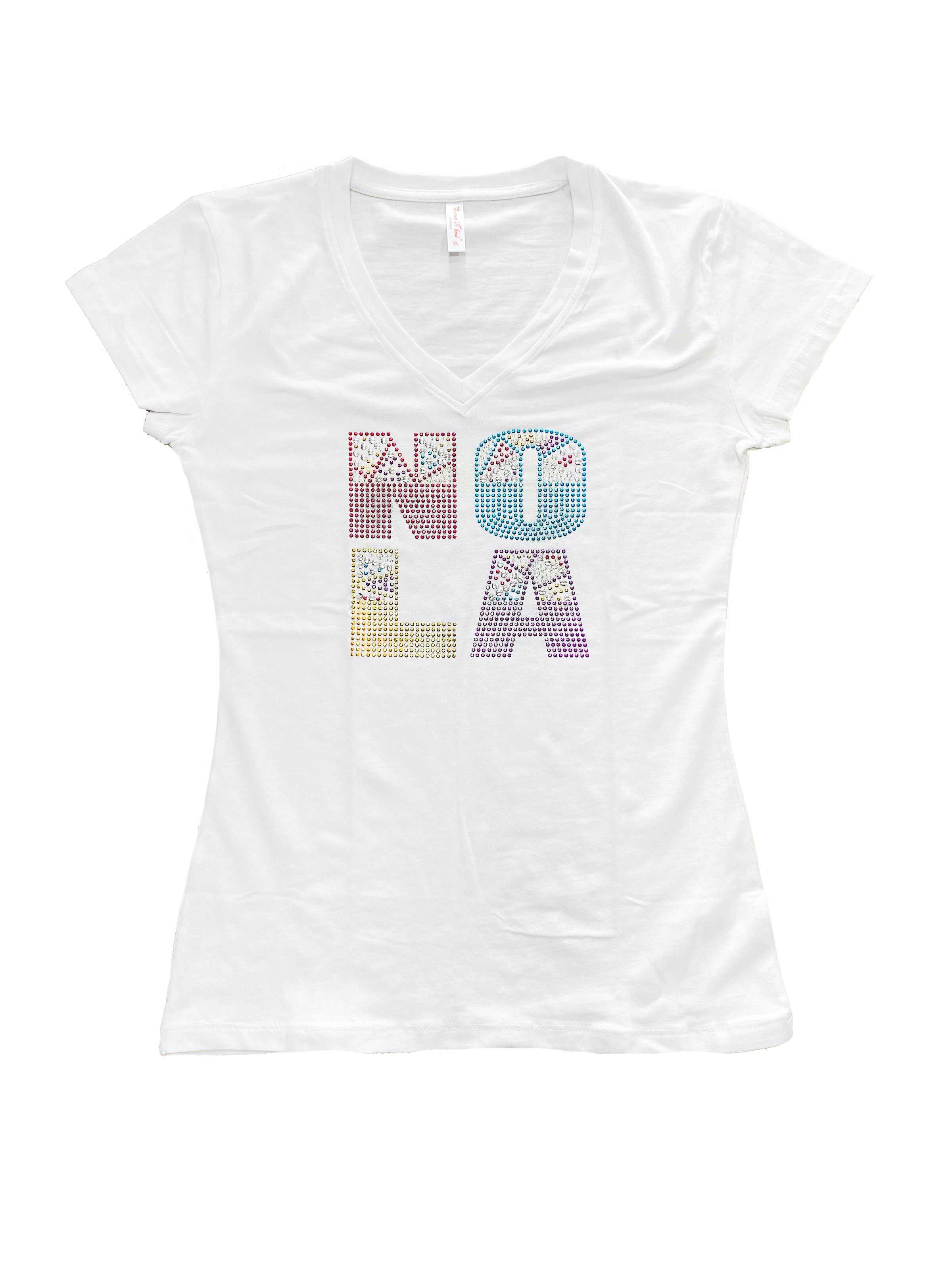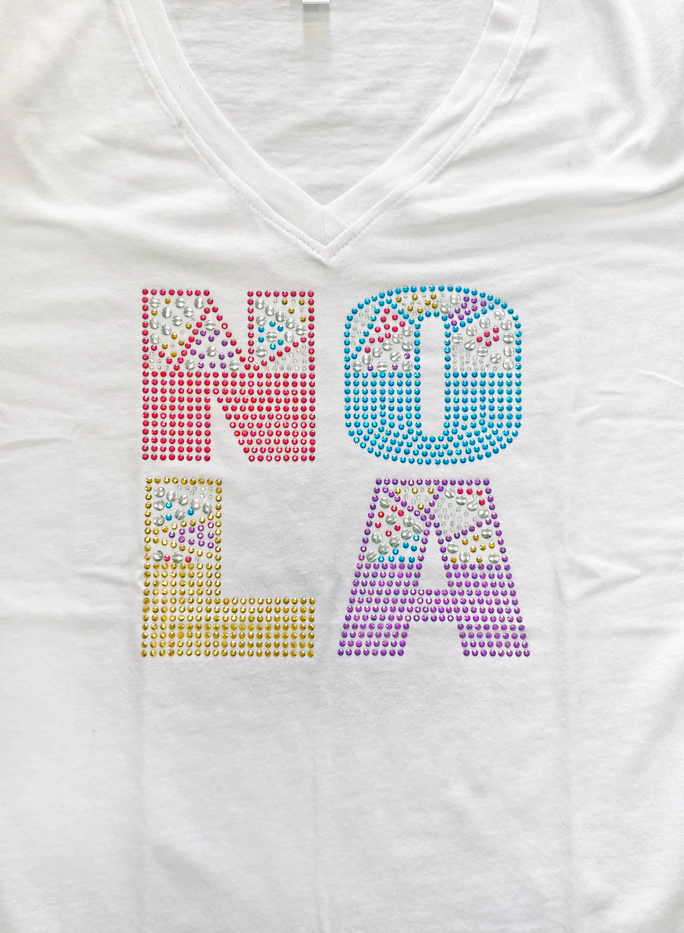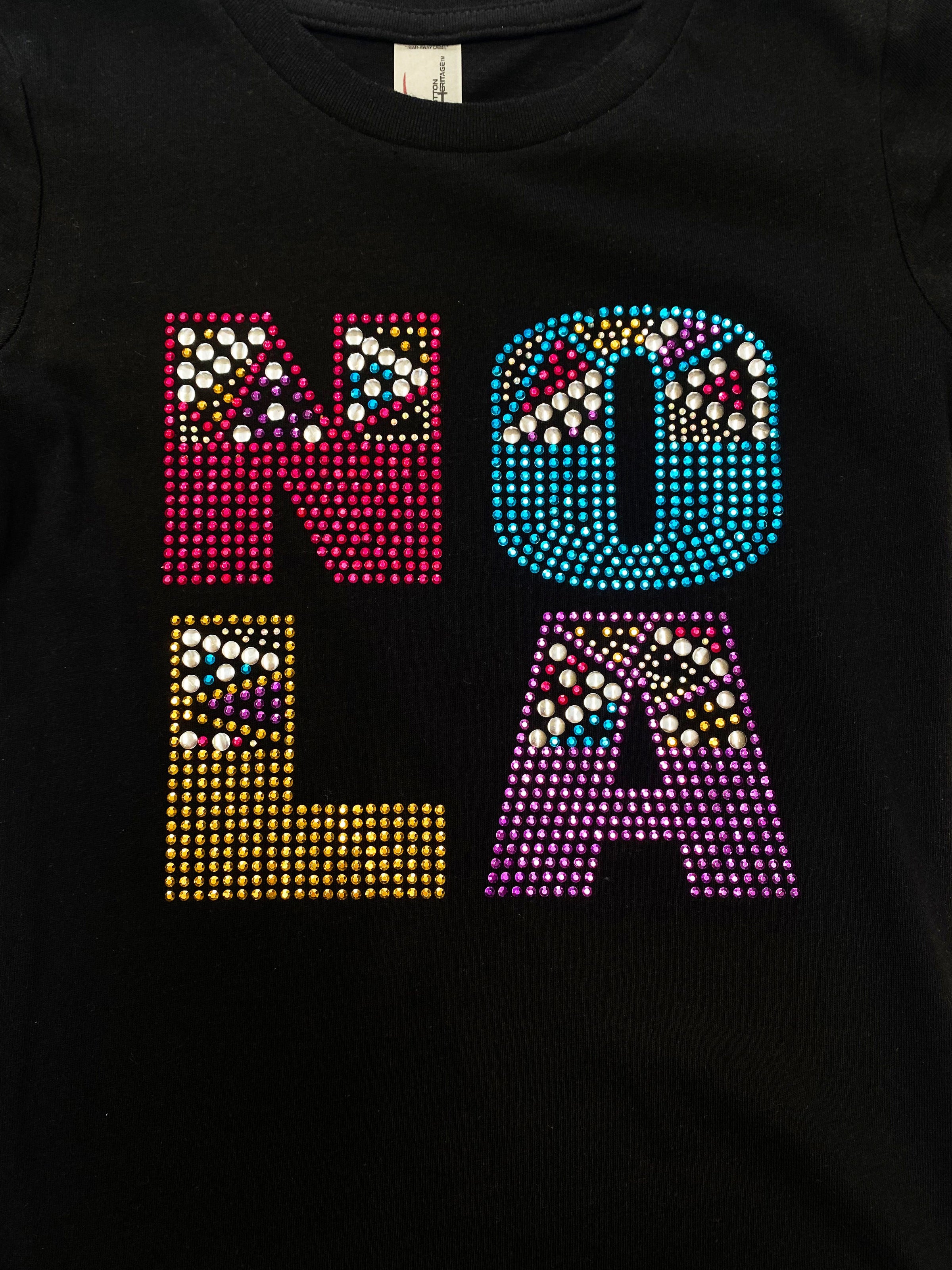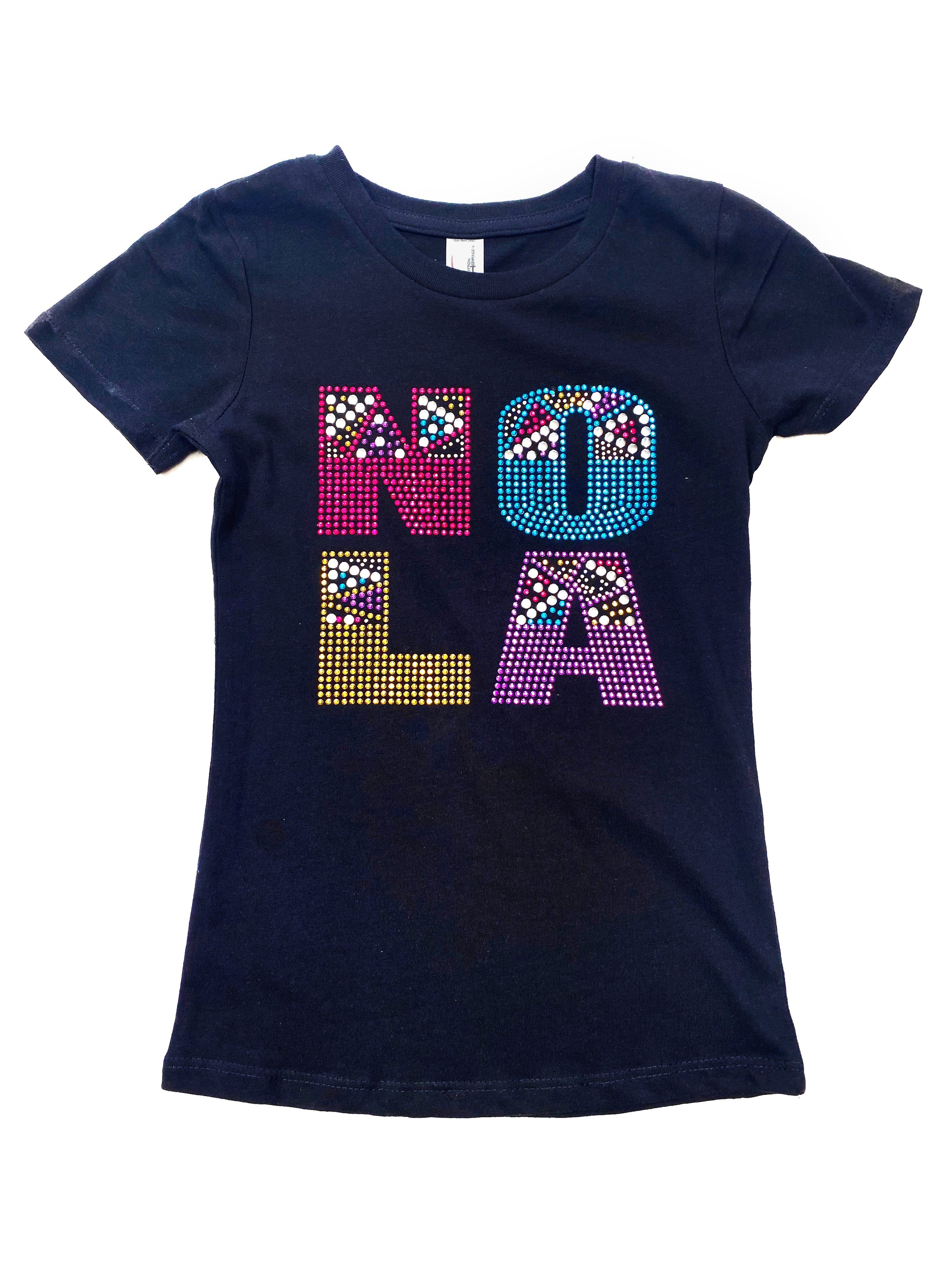 Have your little one shine bright in our Rainbow Rhinestone NOLA Princess Cut Youth T-Shirt. Featuring sparkling rhinestone NOLA letters, this New Orleans inspired tee is sure to make a statement. Perfect for any young fashionista looking to add some glamour to their wardrobe.