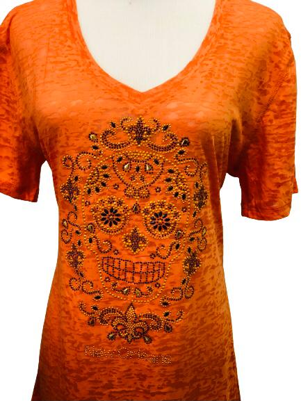 This orange burnout t-shirt features a rhinestone black & gold sugar skull design!
