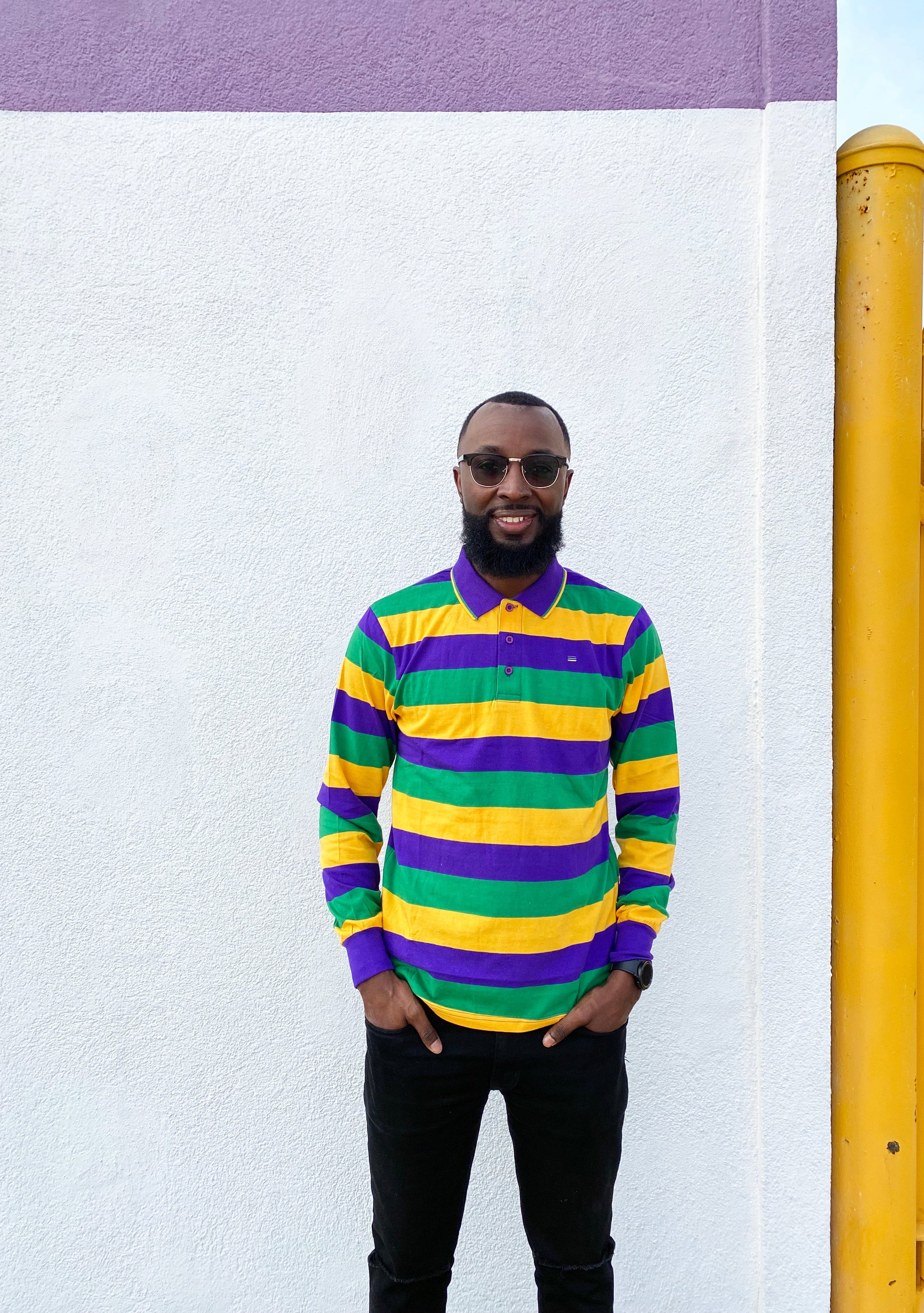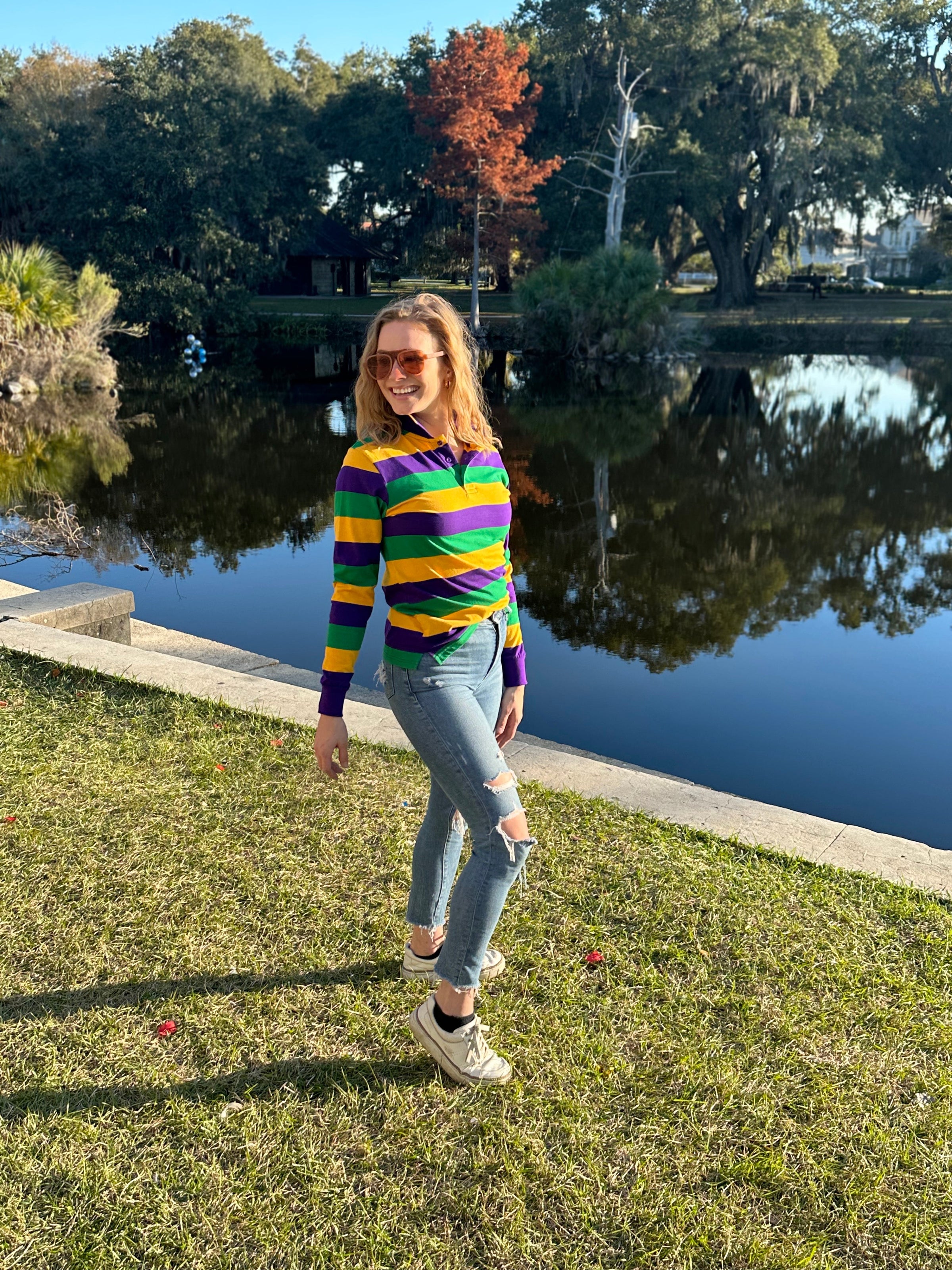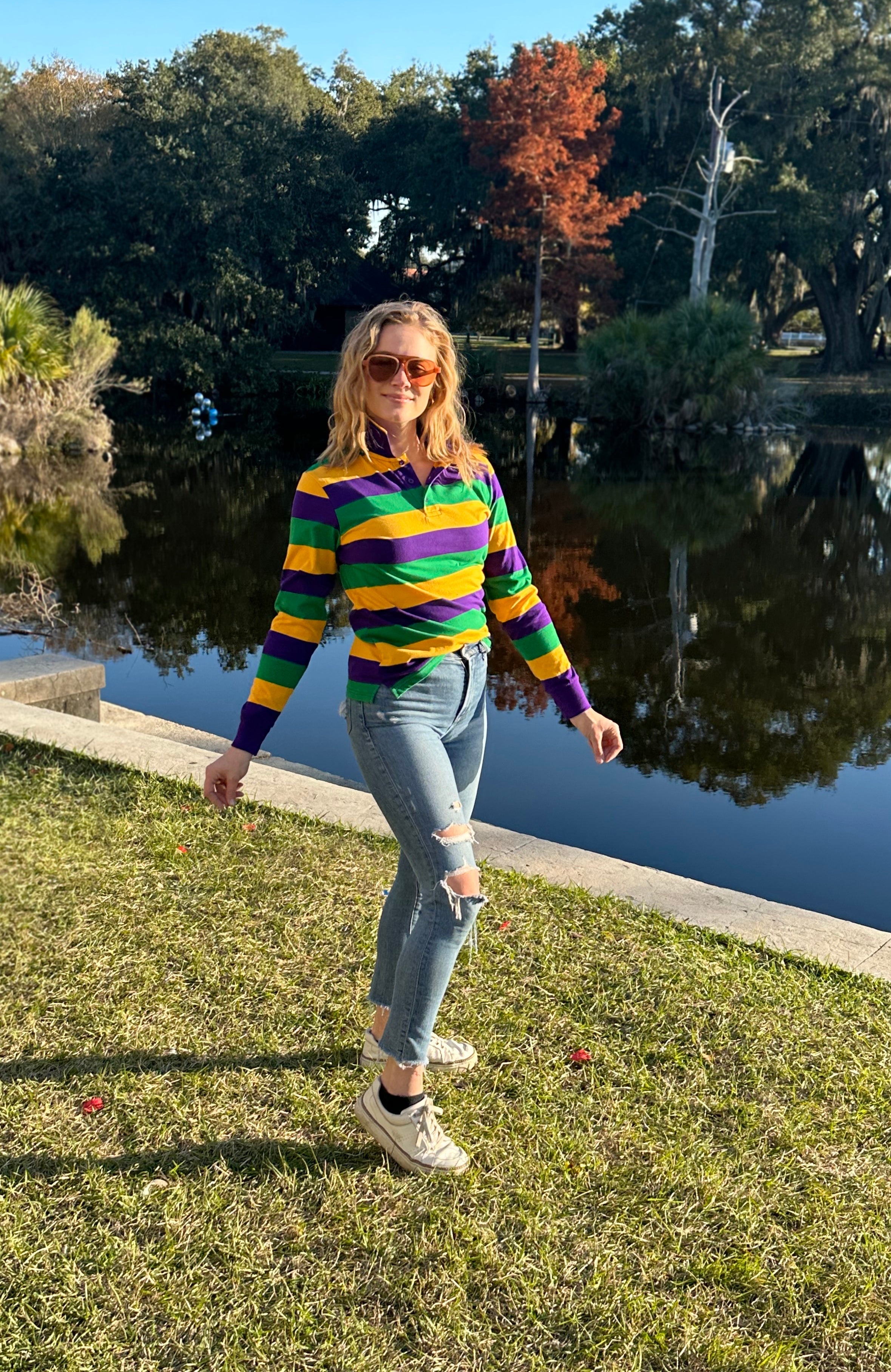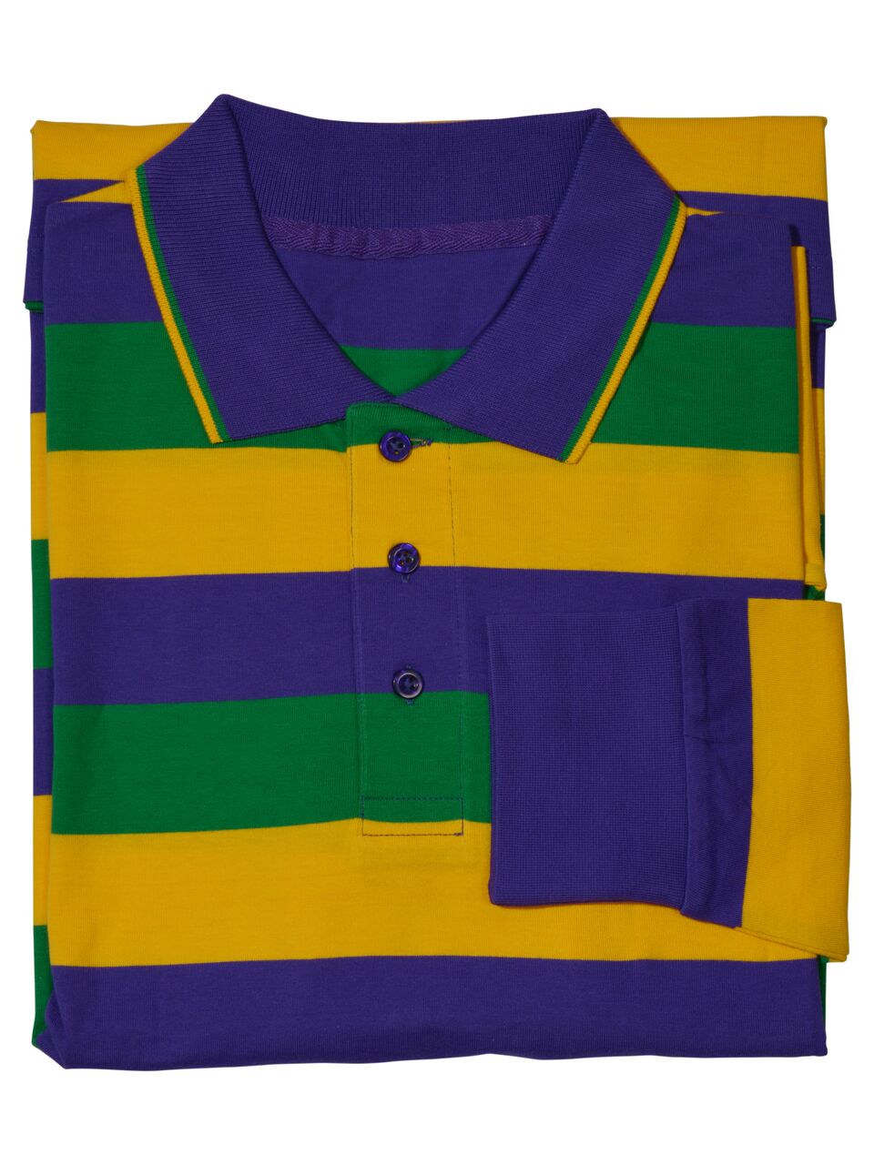 Celebrate Mardi Gras with this stylish long sleeved with purple, green and gold stripe shirt. This shirt features thick purple, green and gold solid stripes alternating across the entire shirt with a solid purple collar.