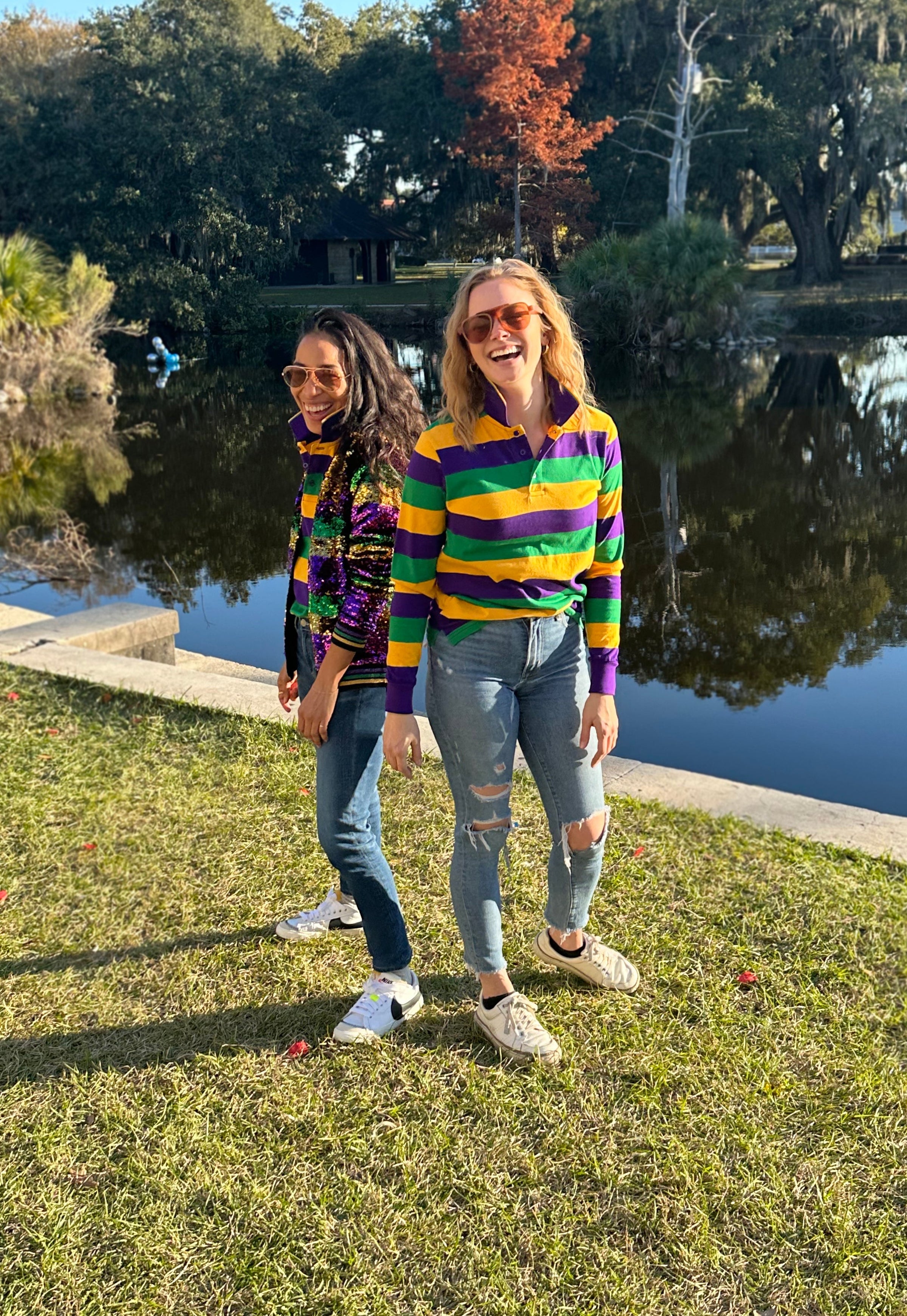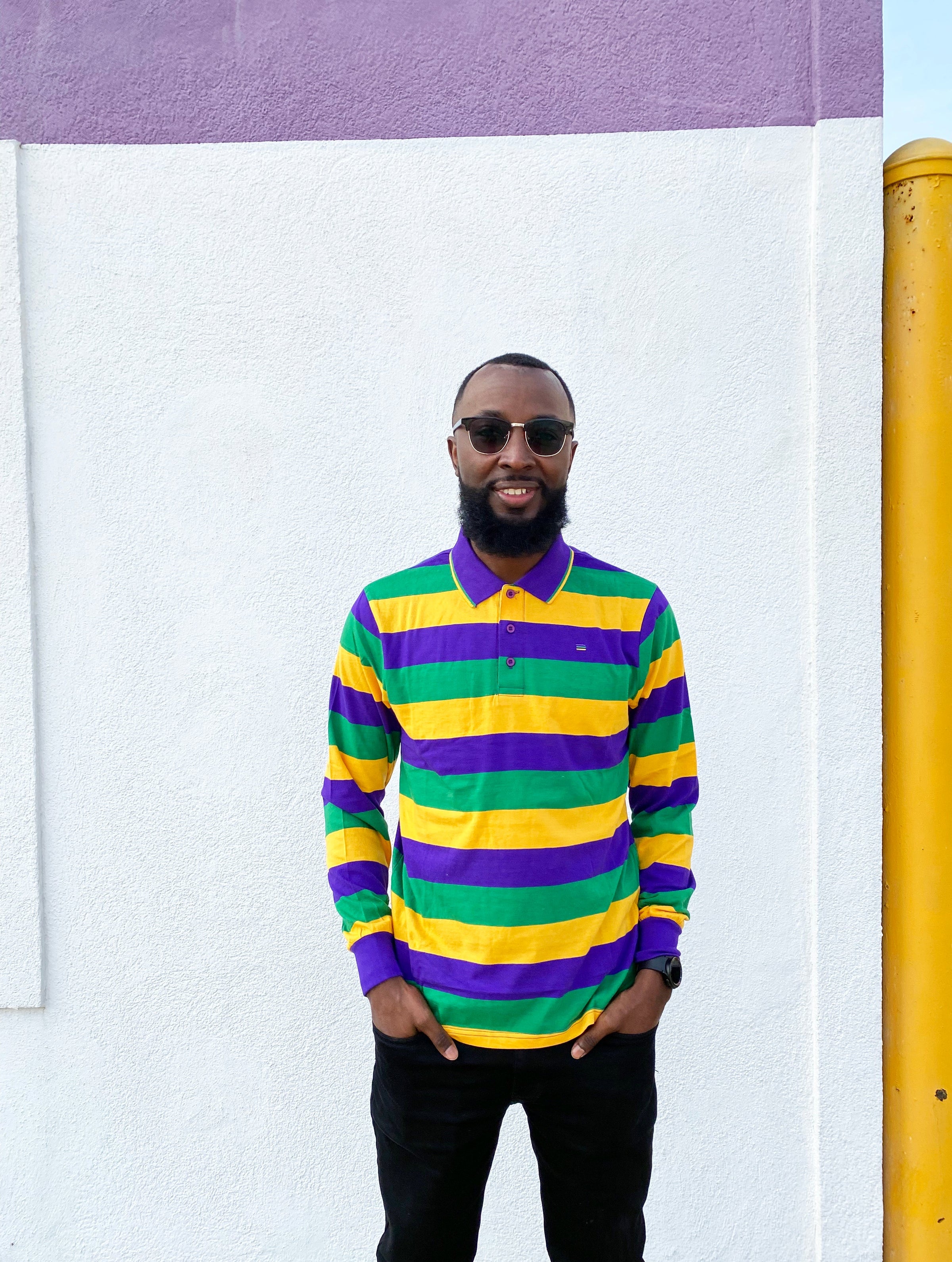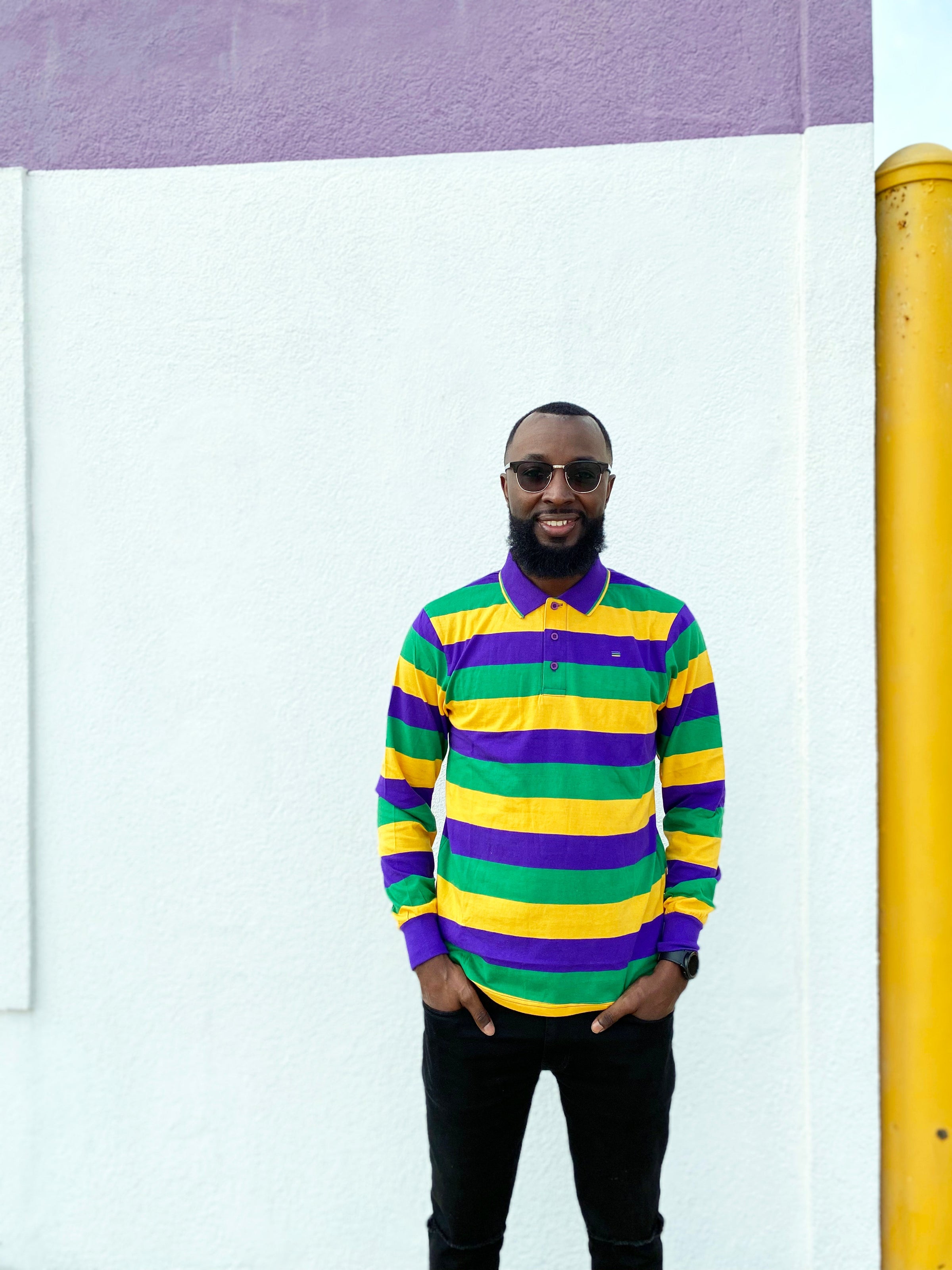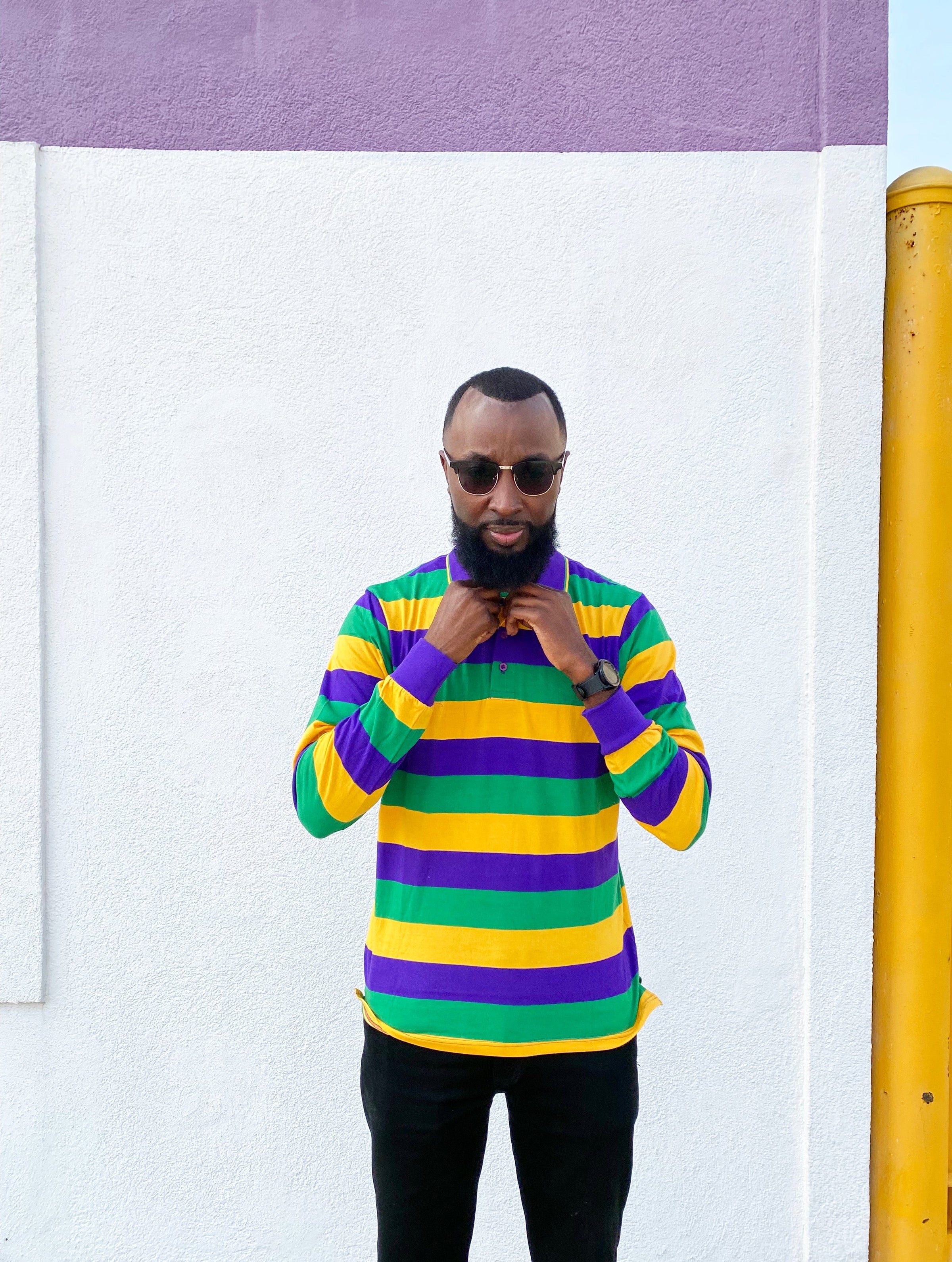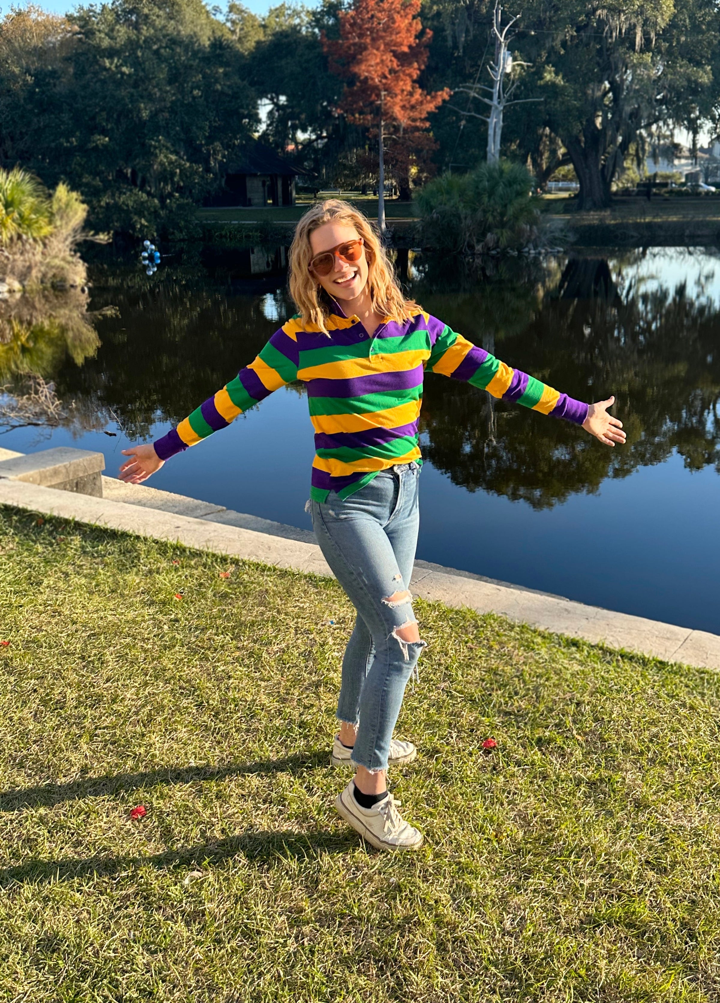 Celebrate Mardi Gras with this stylish long sleeved with purple, green and gold stripe shirt. This shirt features thick purple, green and gold solid stripes alternating across the entire shirt with a solid purple collar.