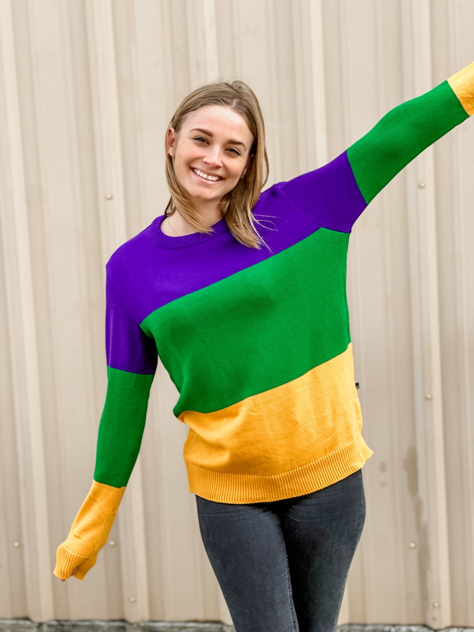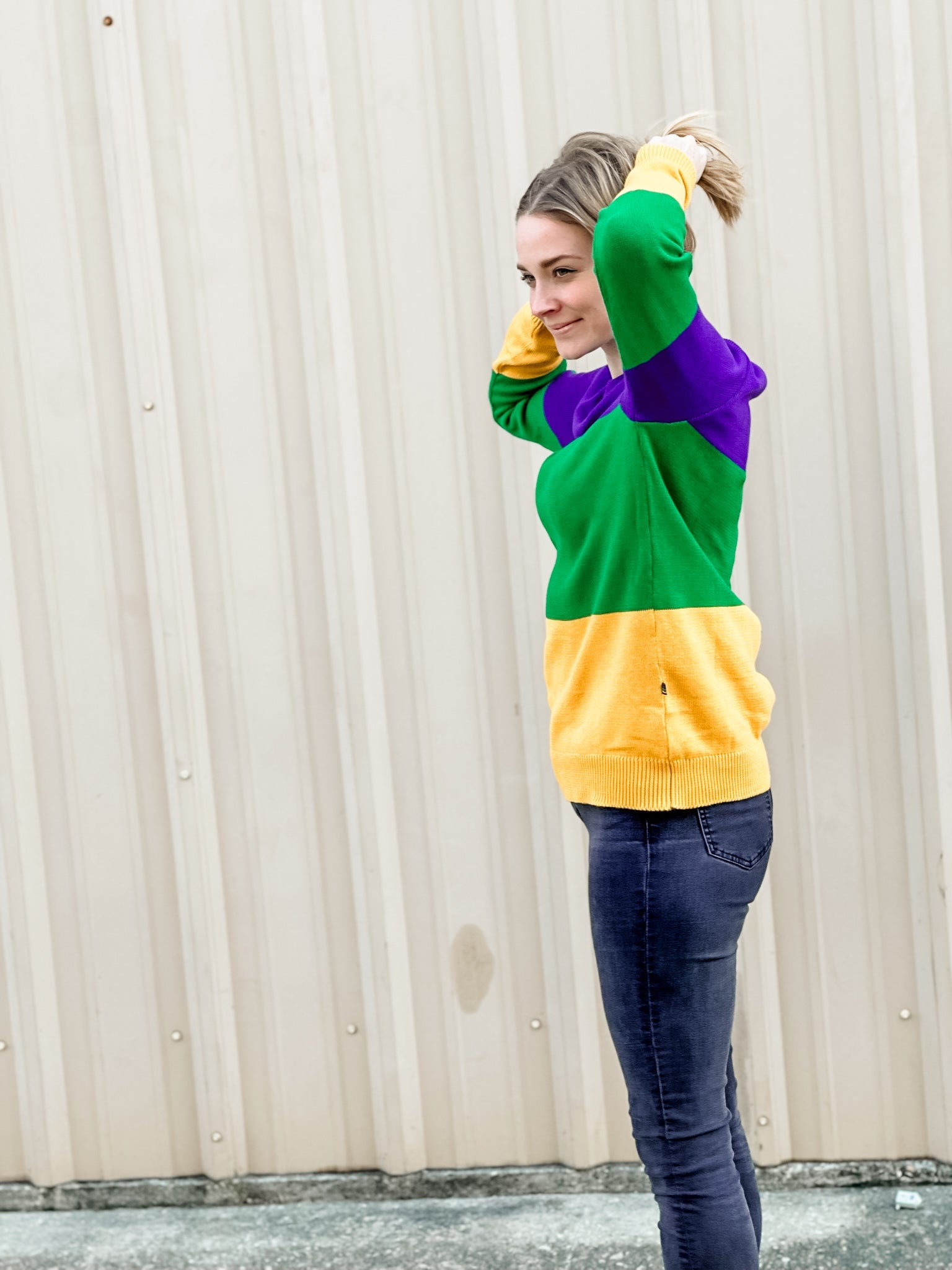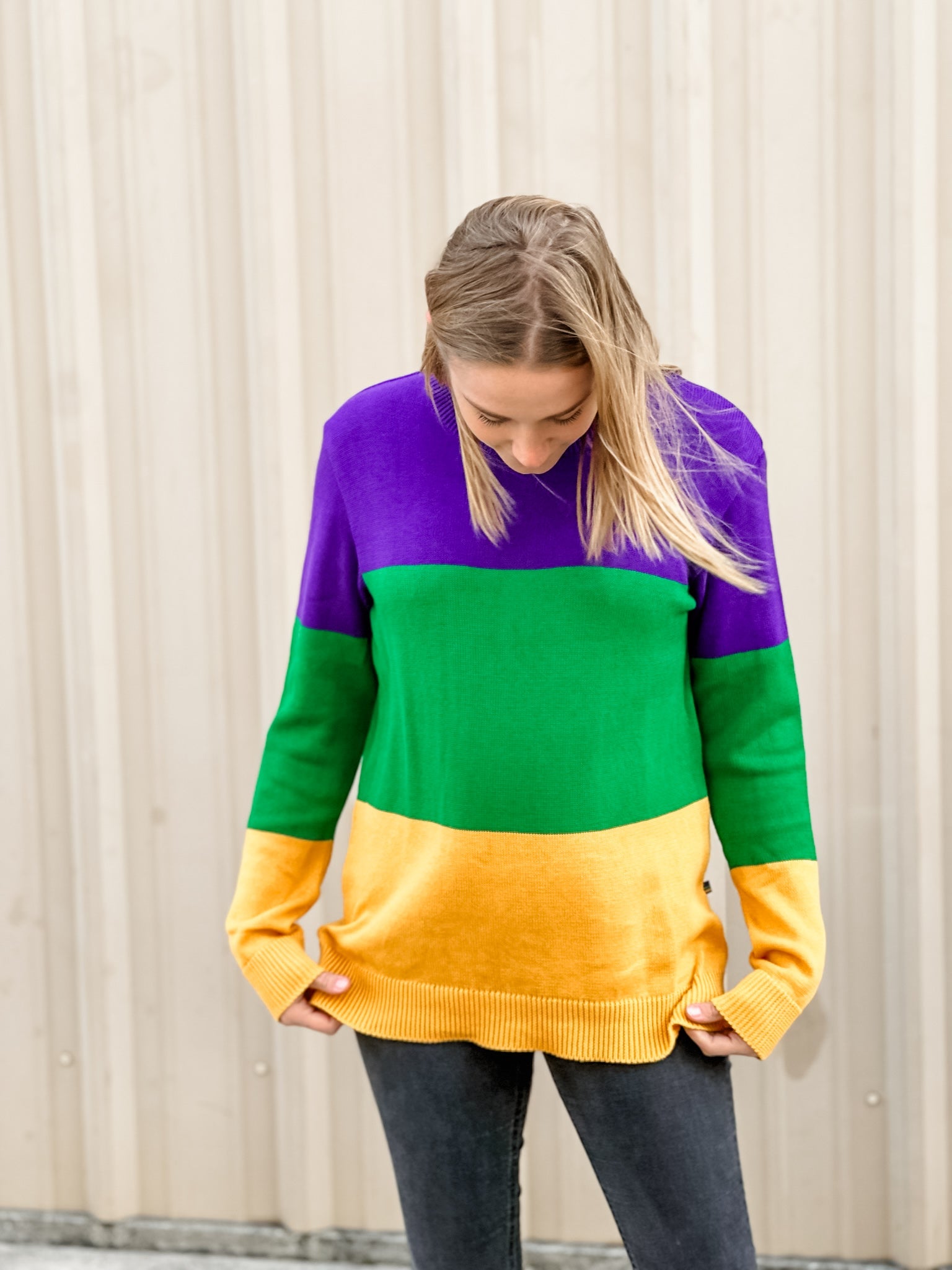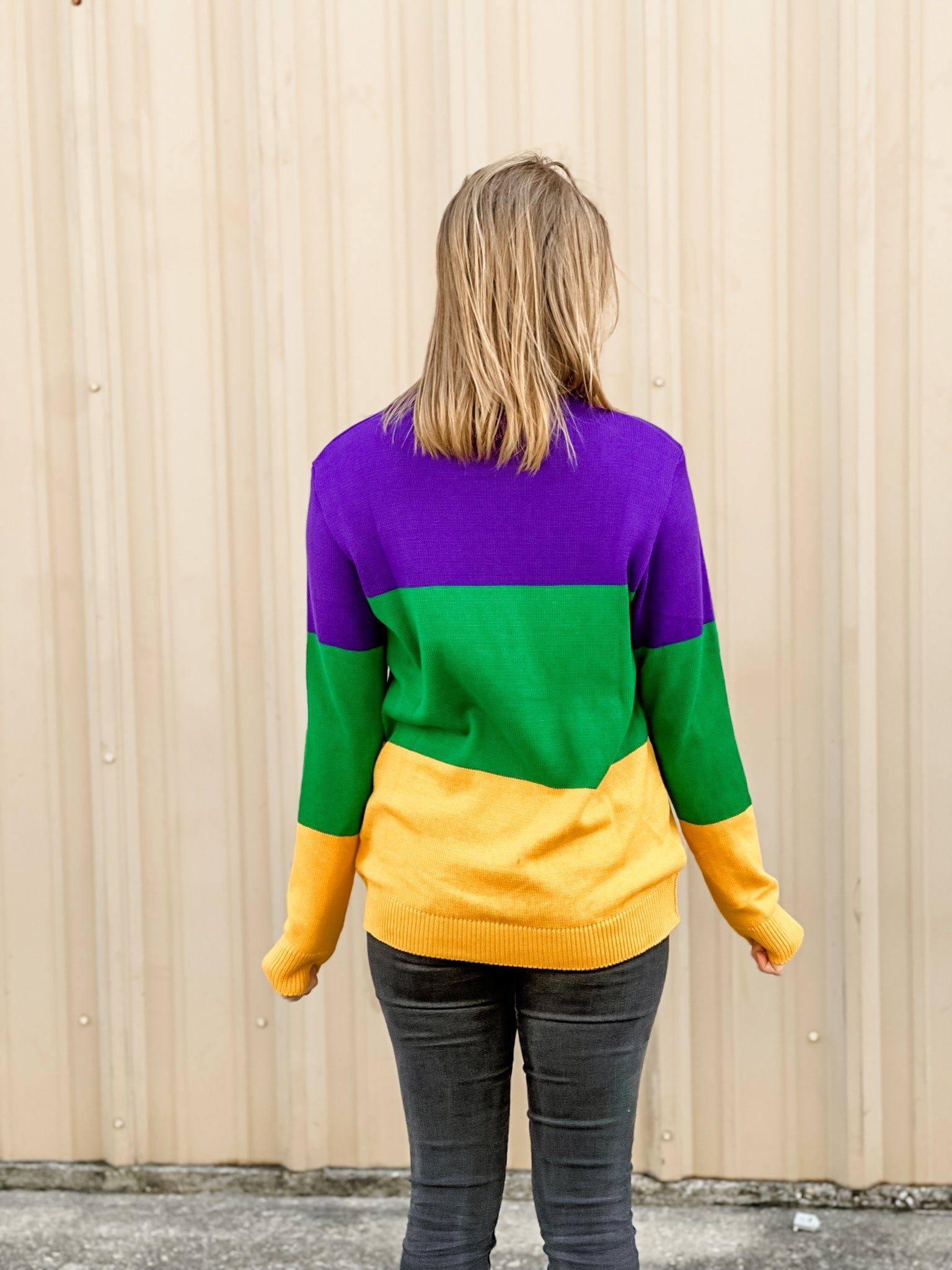 Stay warm and celebrate Mardi Gras in style with this colorful unisex rugby-style pullover sweater! With its striking purple, green, and gold colorblock, its sure to be the life of the party all winter long!
