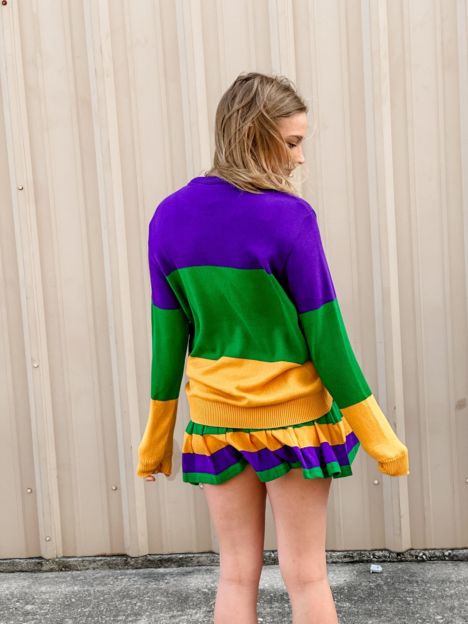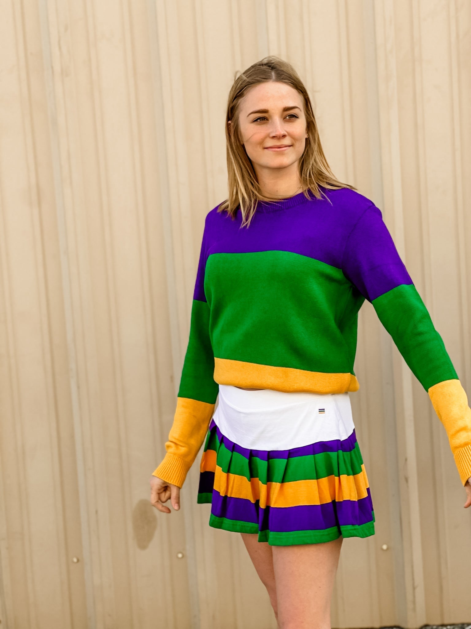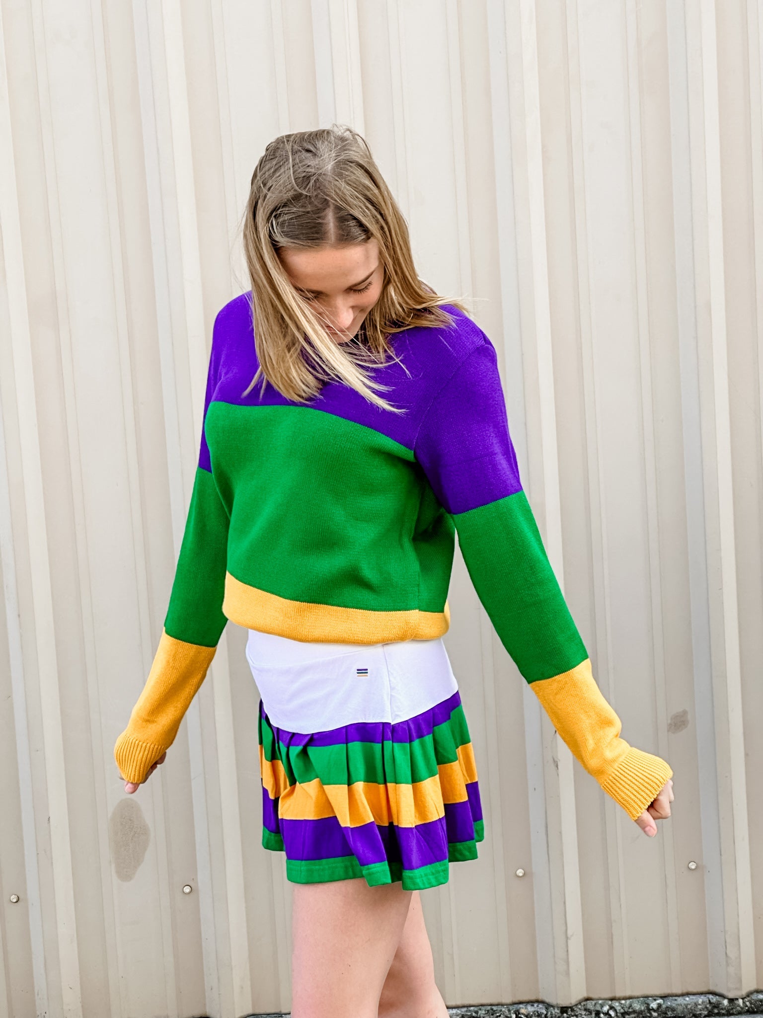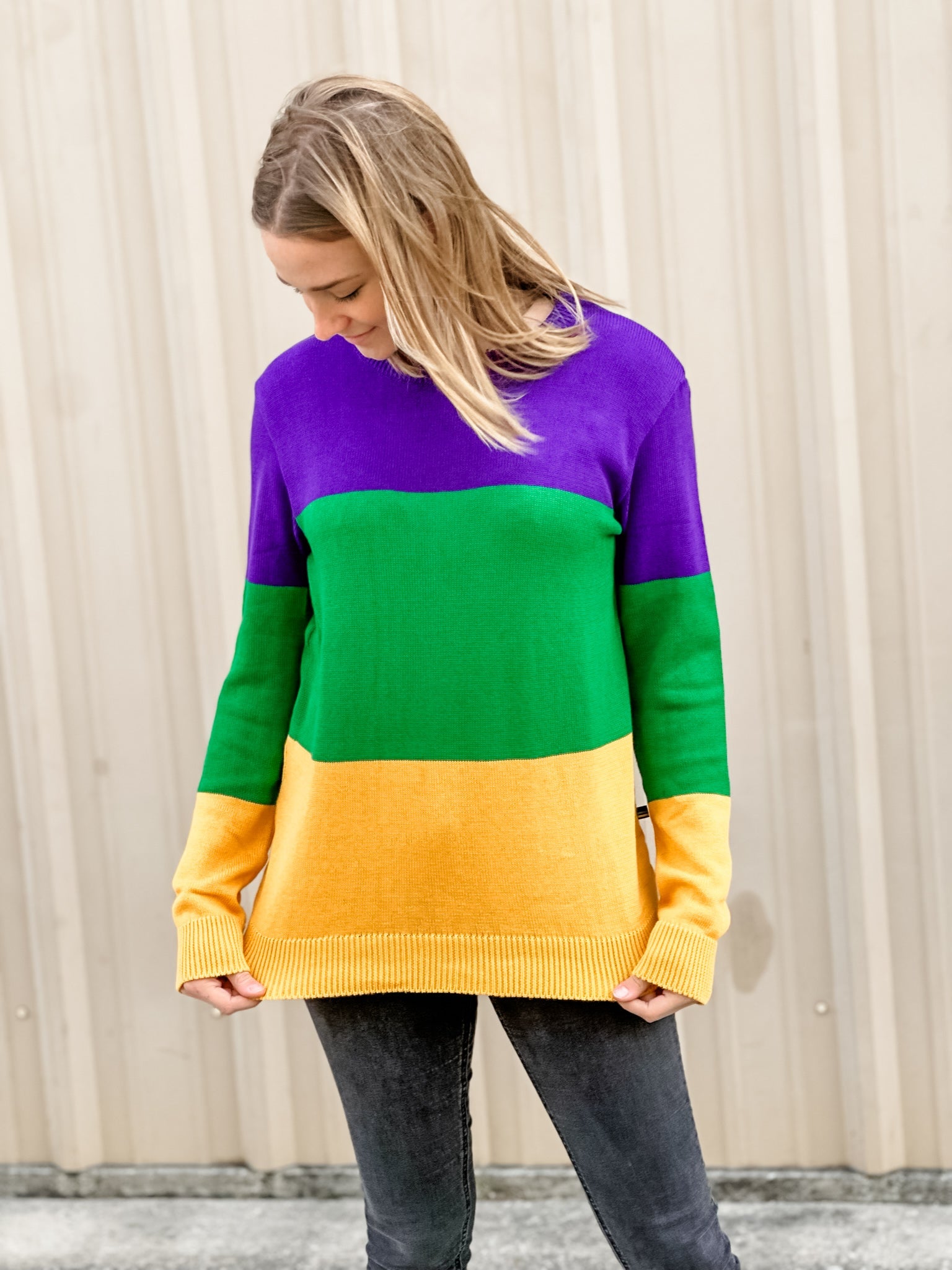 Stay warm and celebrate Mardi Gras in style with this colorful unisex rugby-style pullover sweater! With its striking purple, green, and gold colorblock, its sure to be the life of the party all winter long!