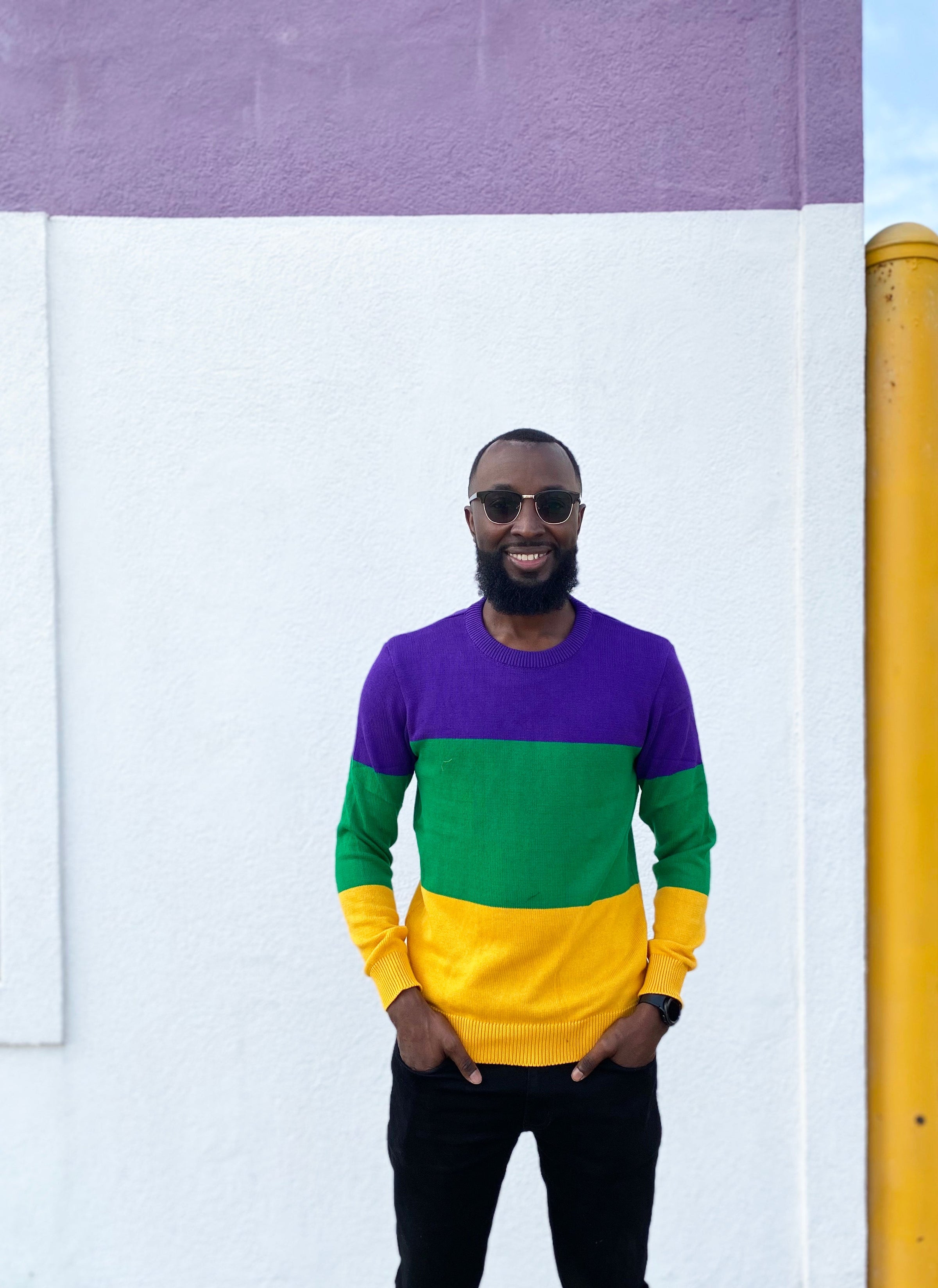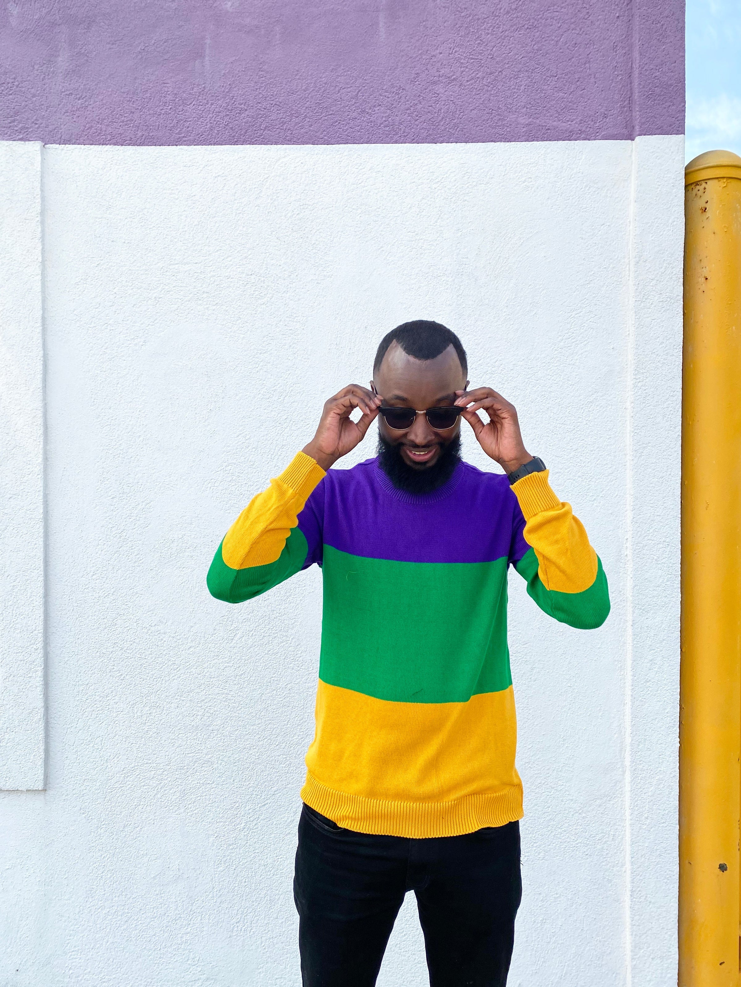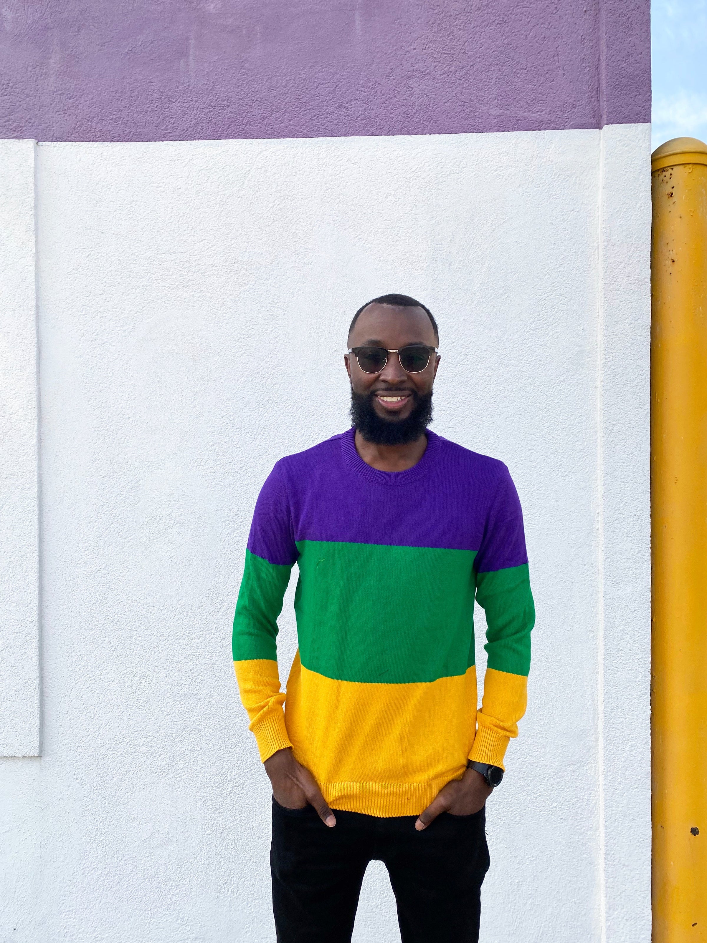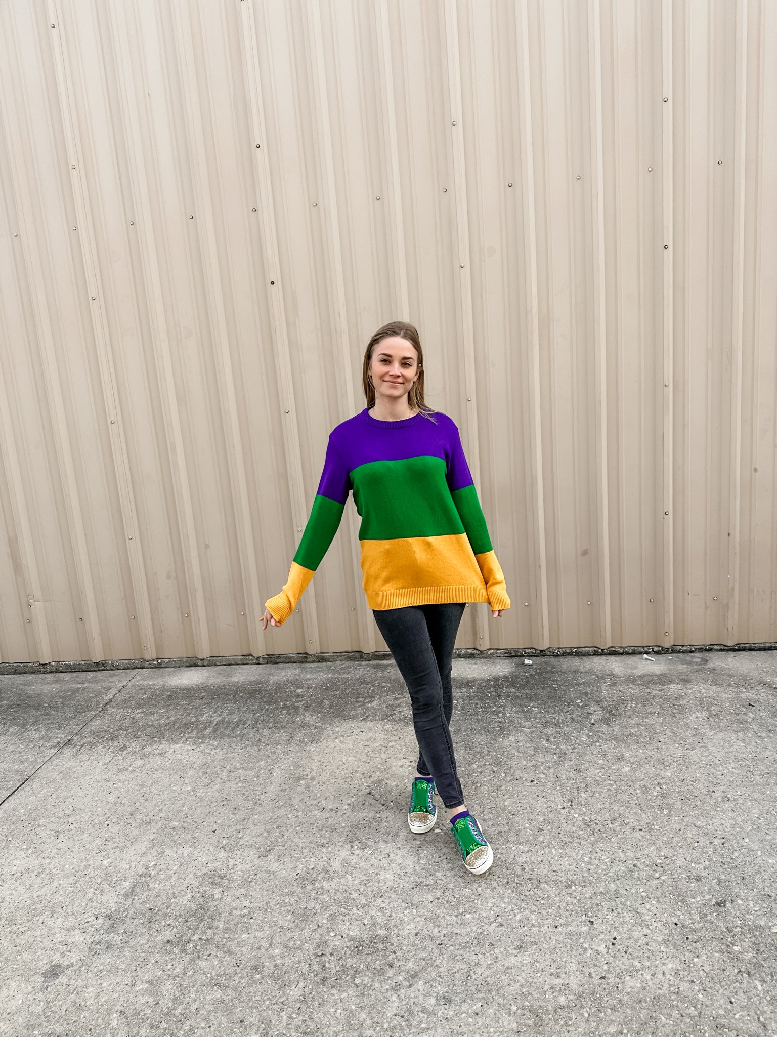 Stay warm and celebrate Mardi Gras in style with this colorful unisex rugby-style pullover sweater! With its striking purple, green, and gold colorblock, its sure to be the life of the party all winter long!
