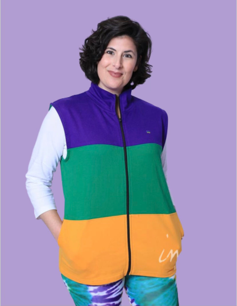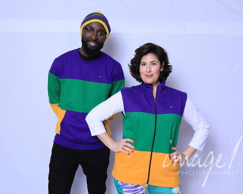 Celebrate Mardi Gras with this stylish unisex colorblock zip up vest! This vest features wide purple, green and gold solid stripes, a high neck, and pockets.