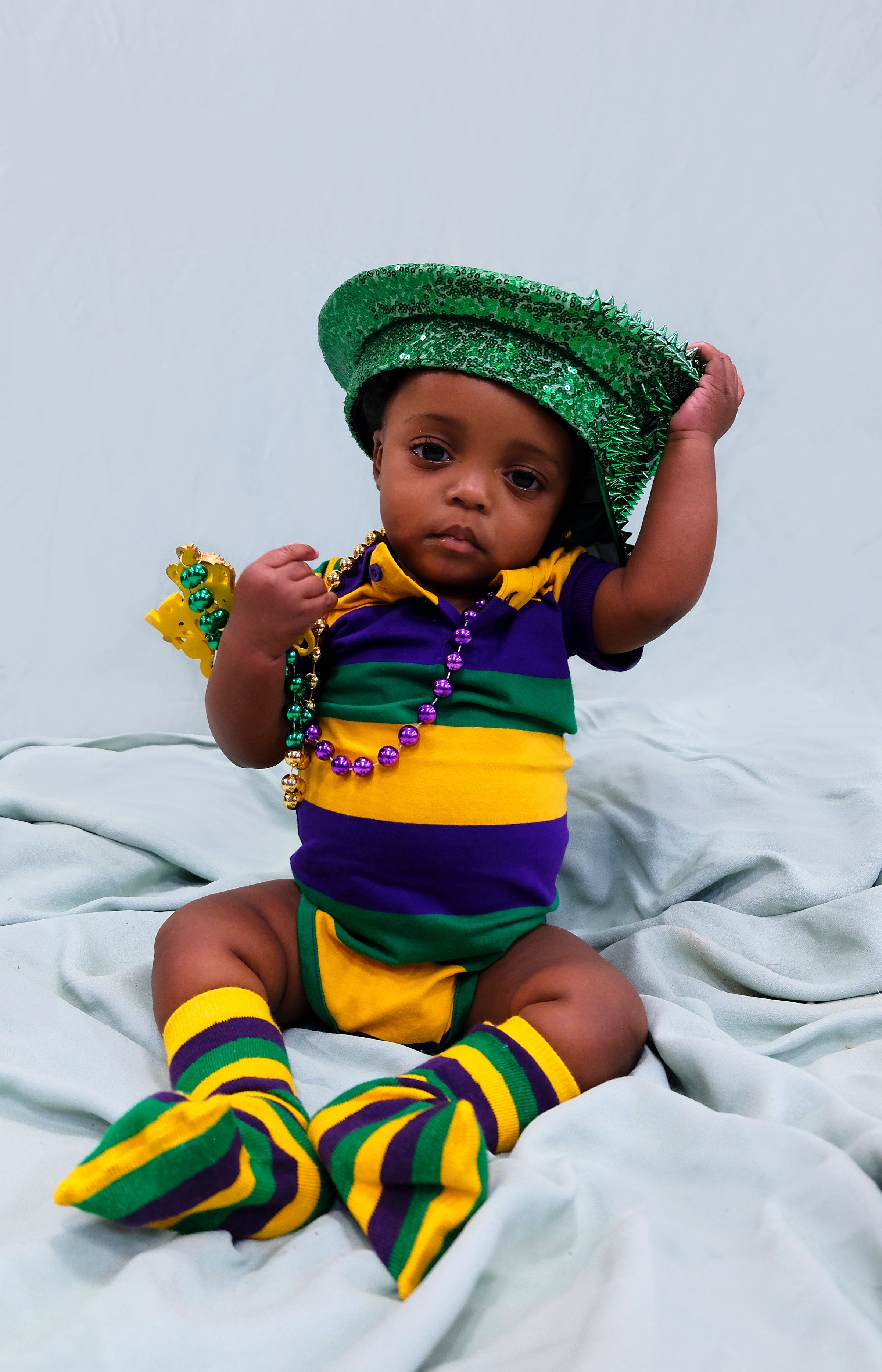 Even the baby can get in on the stylish fun. This onesie features thick purple, green and gold solid stripes alternating across the entire shirt with a solid purple collar. Three snaps for the bottom.