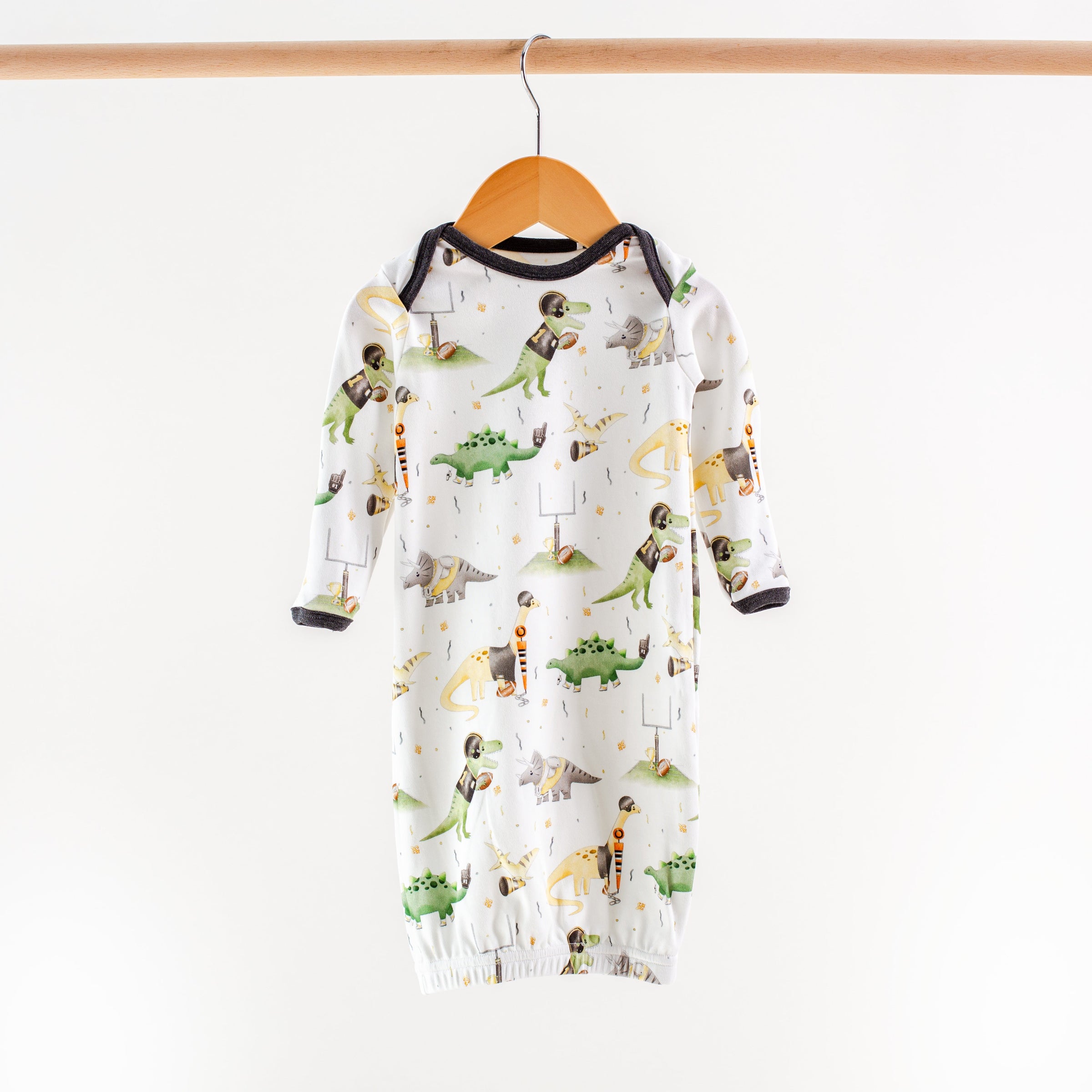 Bring the roar to game day with playful black-and-gold dinosaurs tossing, catching, and charging down the field. This fun football-themed print is perfect for little fans who dream of victory dances and dino-sized plays. Made from ultra-soft, GOTS-certified organic cotton, these breathable pajamas keep your child cozy from kickoff to bedtime. Whether they’re snuggled up for a story or celebrating a Saints win, these PJs combine comfort, team spirit, and prehistoric charm all in one winning look.