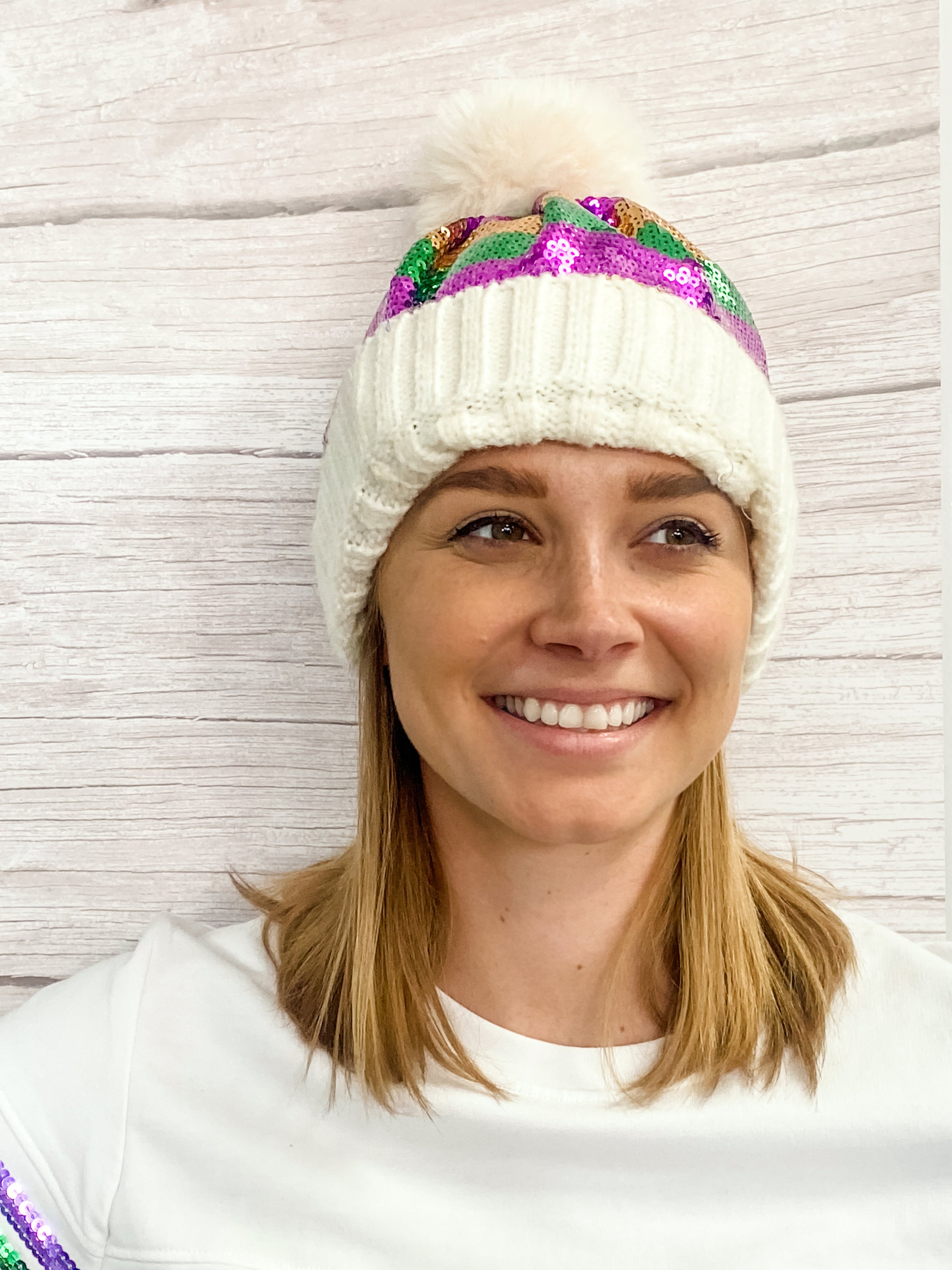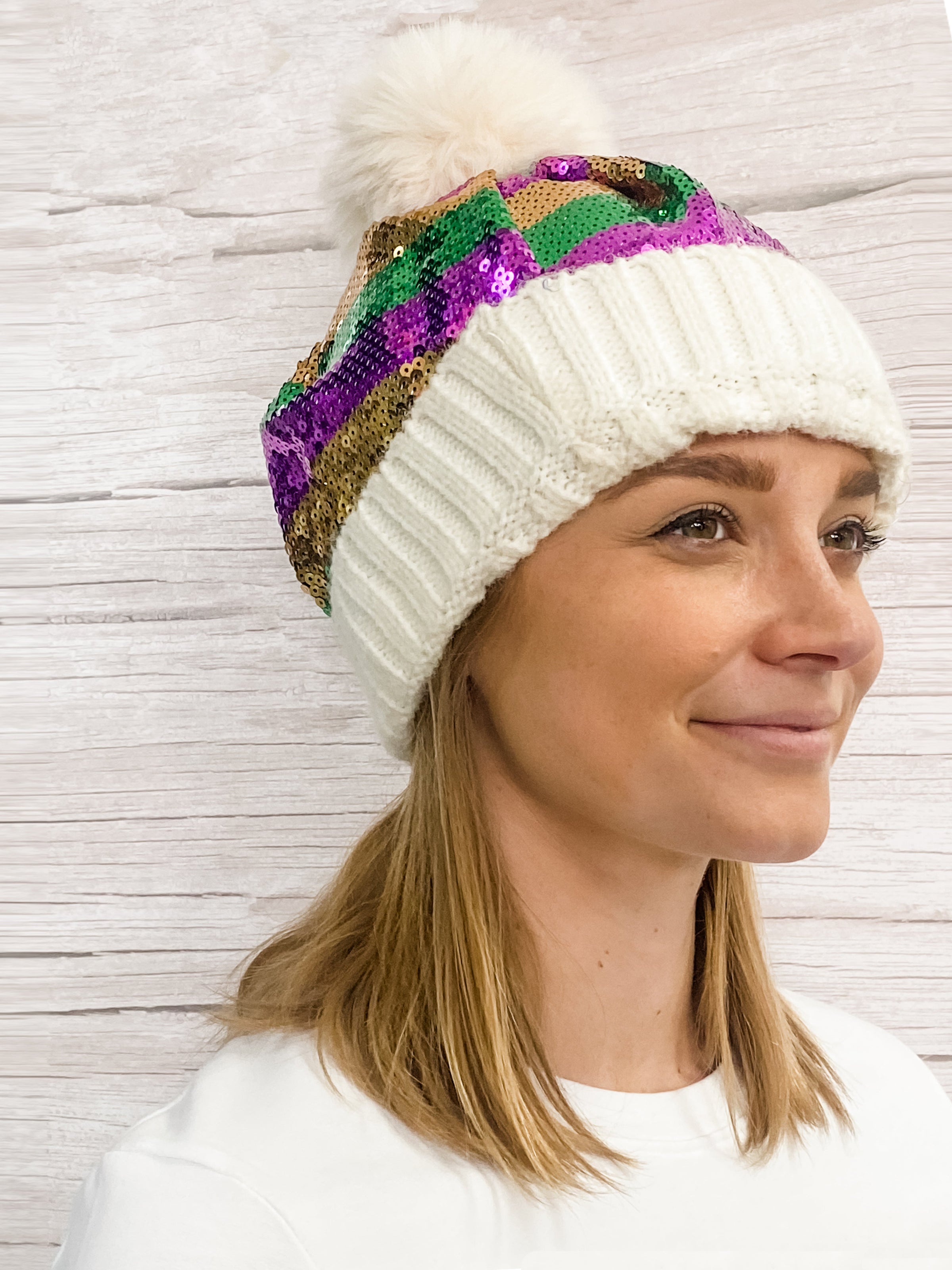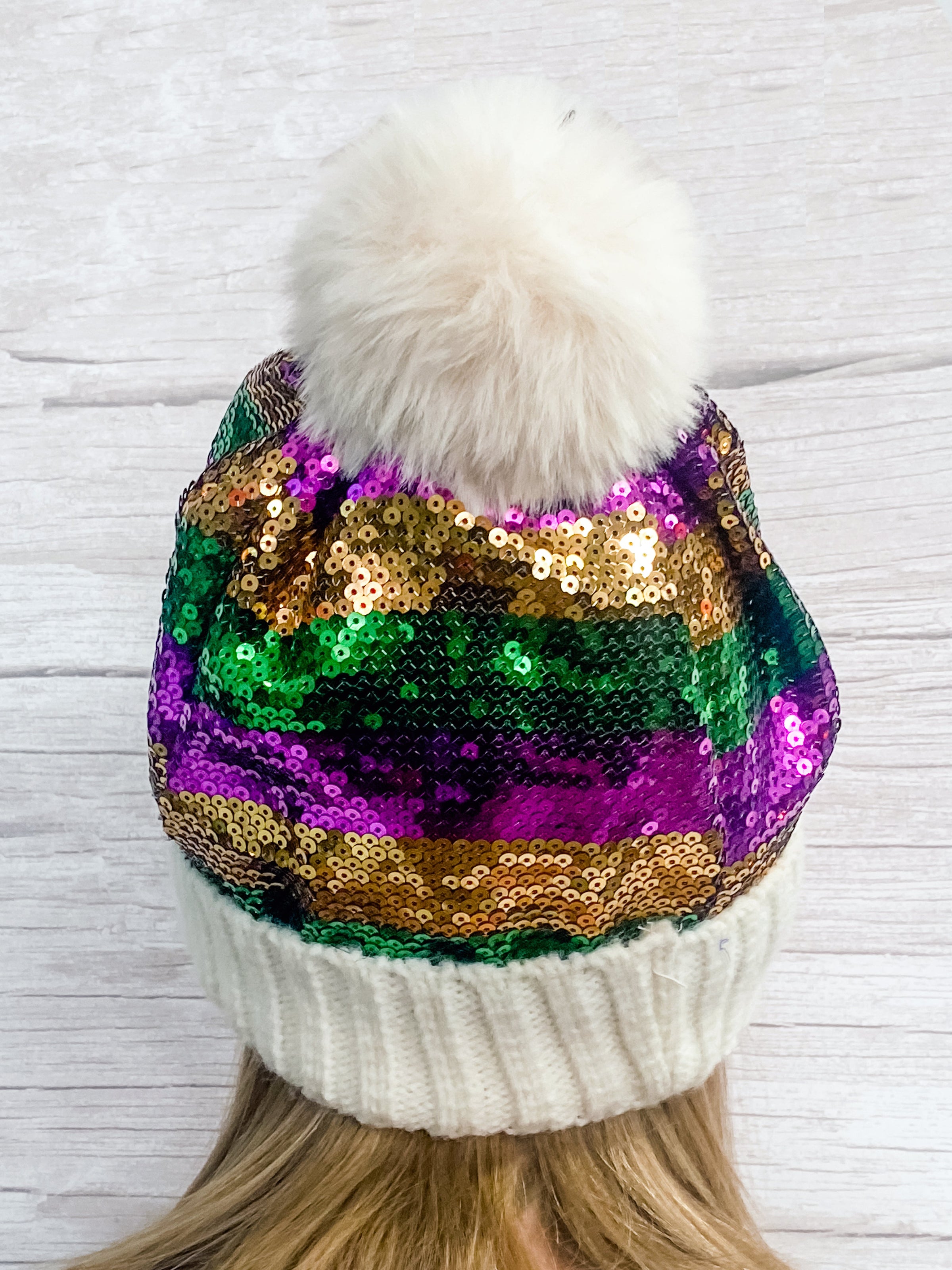 This sequin beanie is the perfect accessory for a cold Mardi Gras. Featuring a classic striped design, colorful pom pom and purple, green and gold sequins, it's a look that will turn heads. Keep warm and look great!