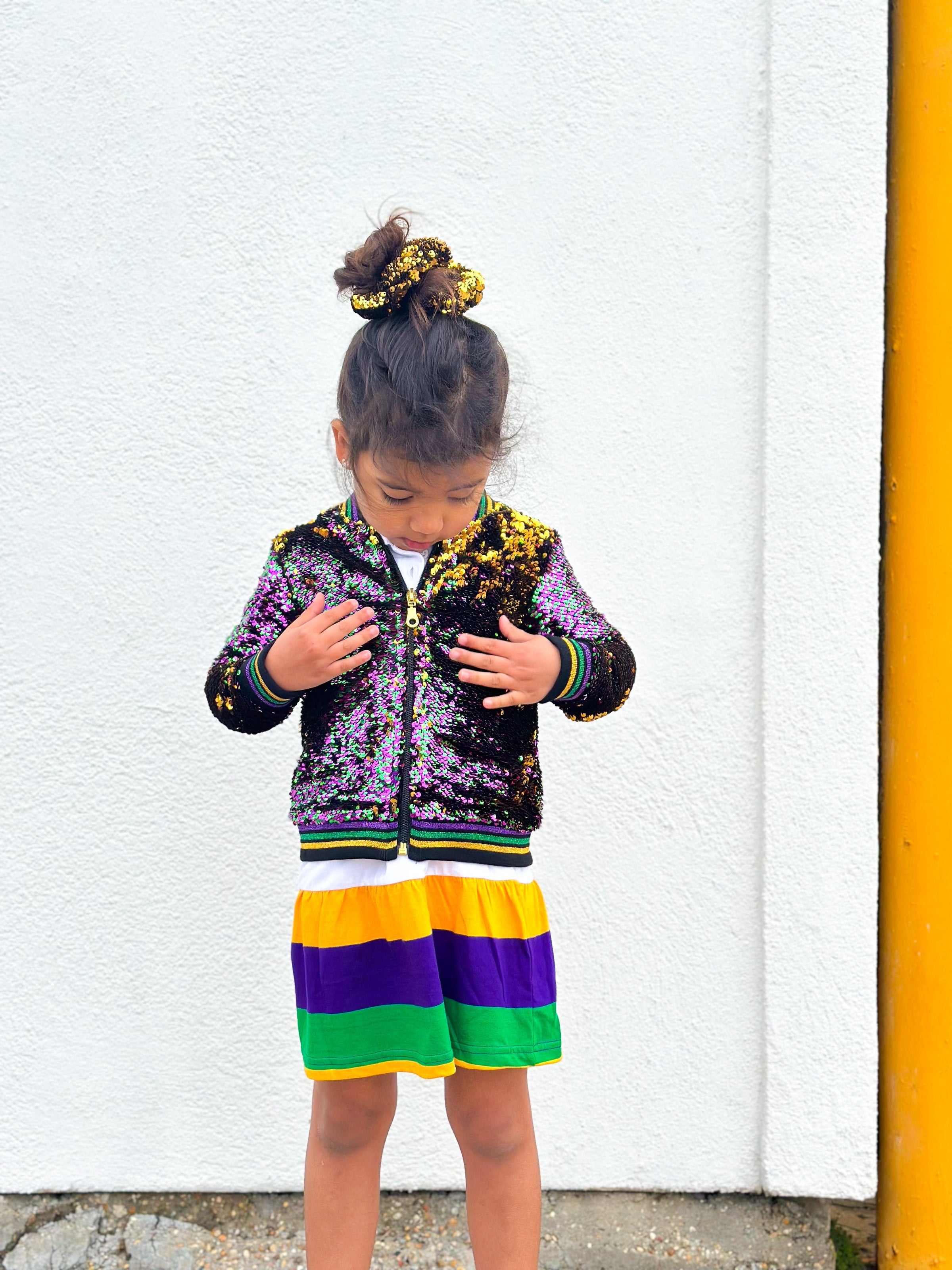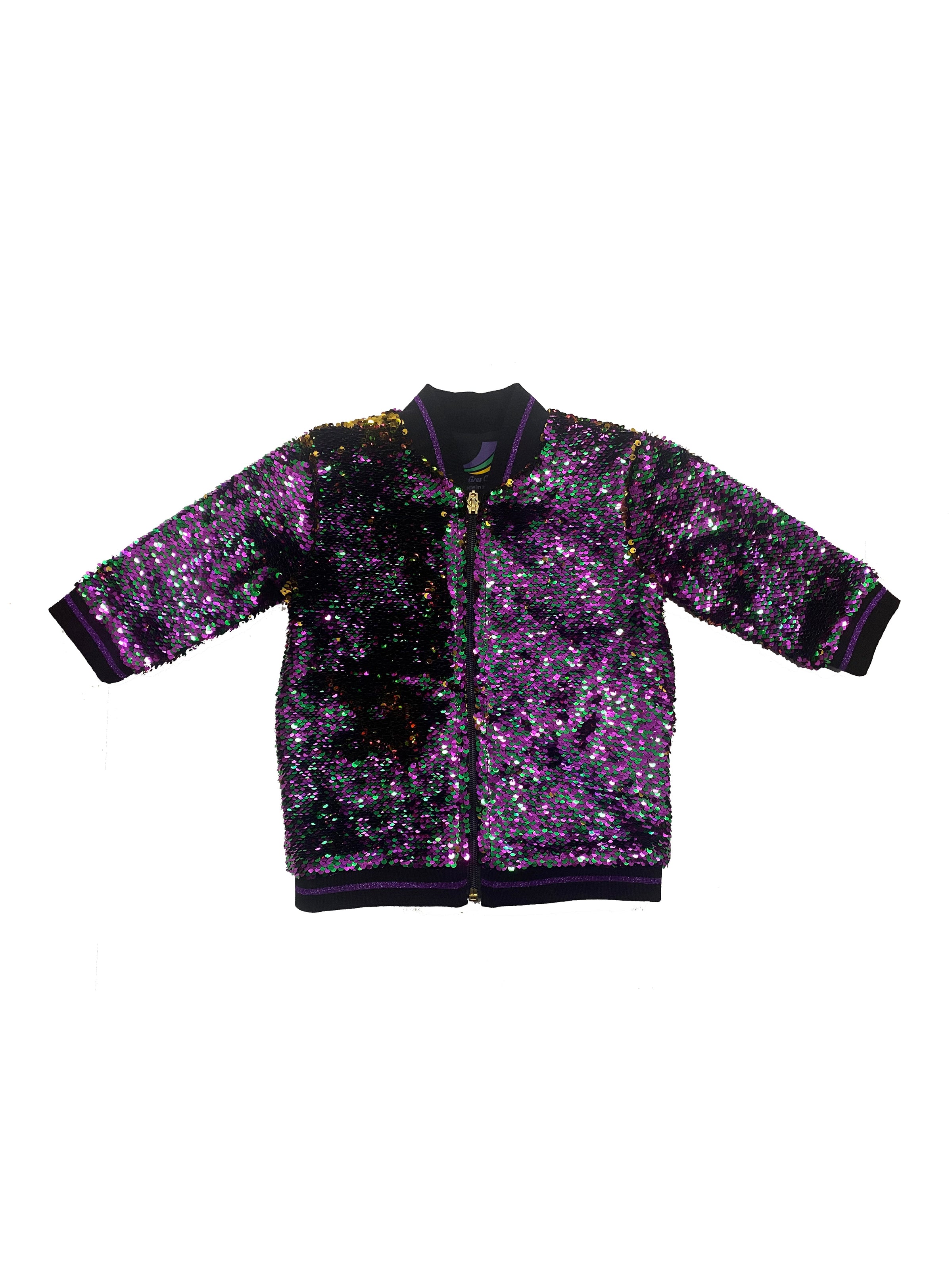 Dazzle the streets in true Carnival style with this sequin jacket for your little one! Featuring a vibrant purple, green, and gold color-way inspired by Mardi Gras, your child will stay warm while looking too cute! The perfect way to match your littles!