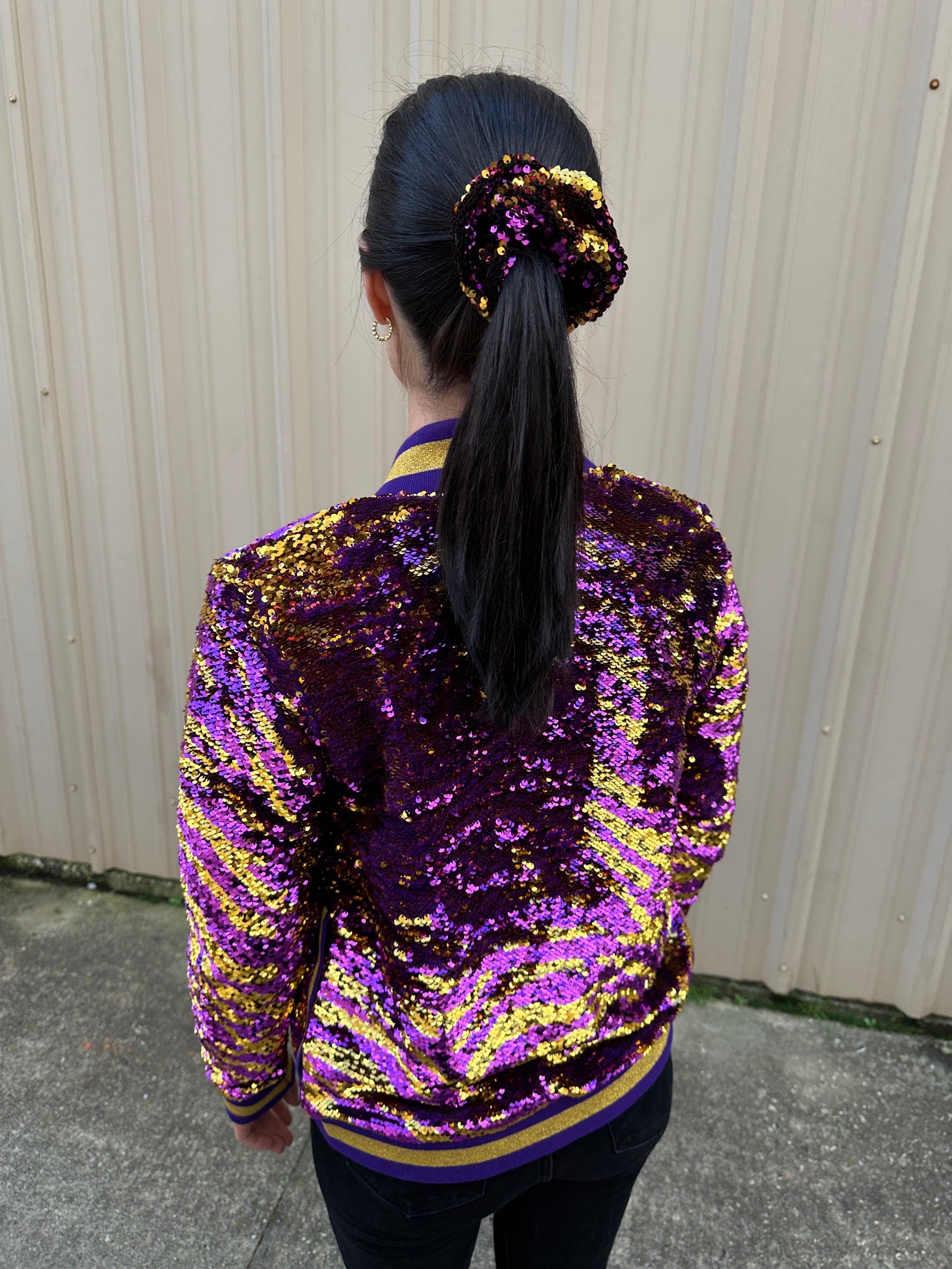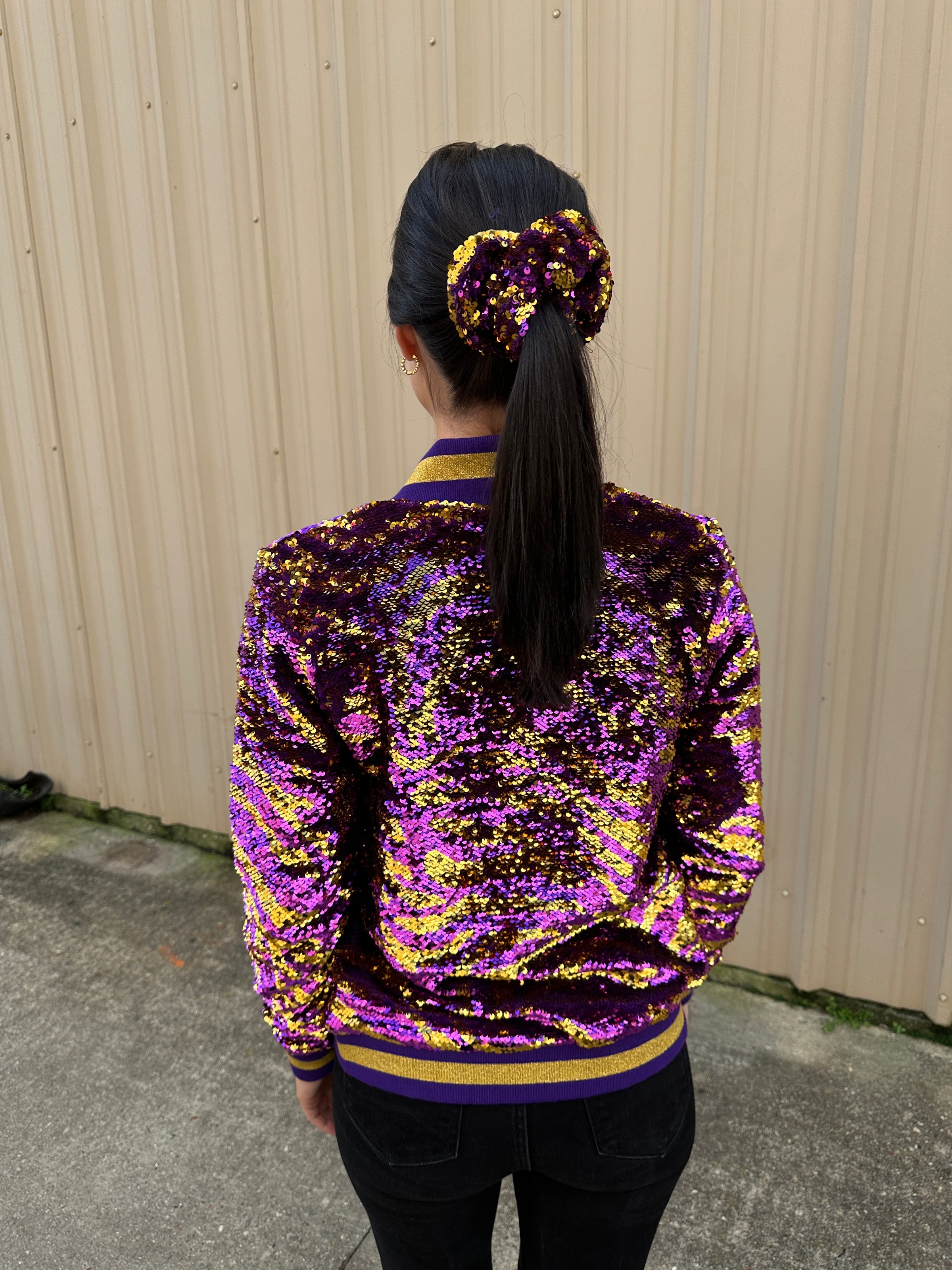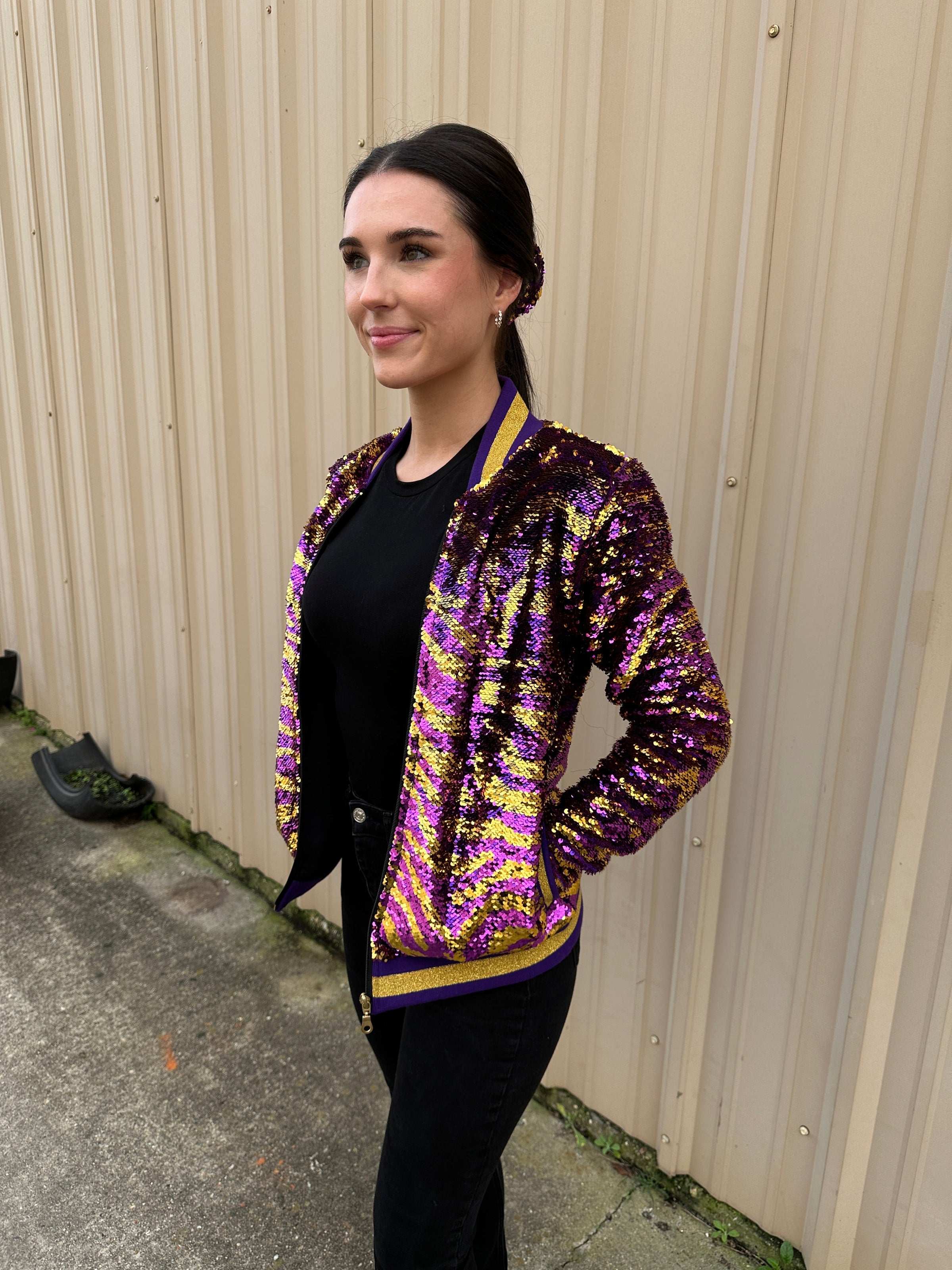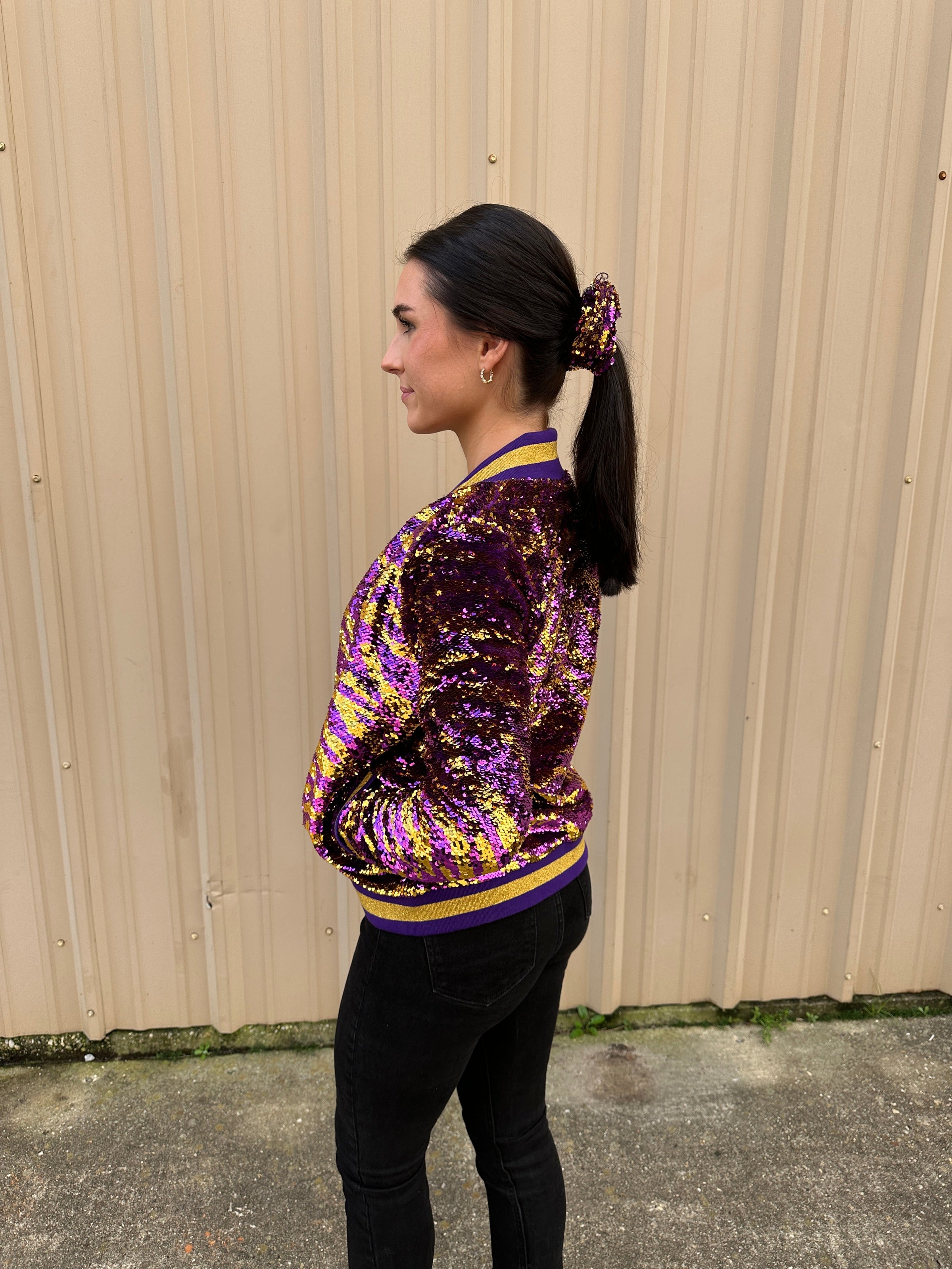Perfect for gamedays with this stylish long sleeved, reversible sequined jacket. This jacket features purple and gold sequins with tiger stripes!