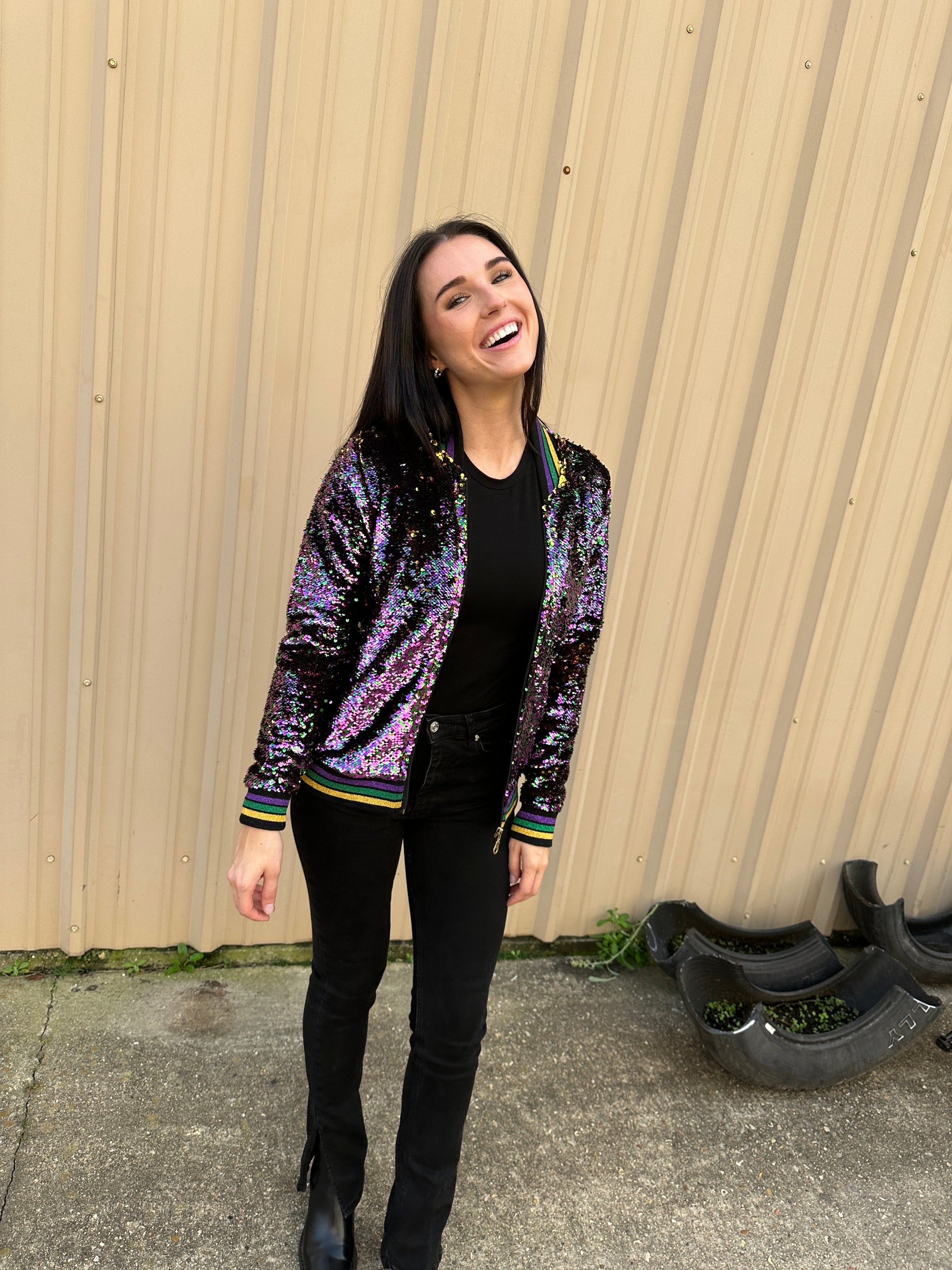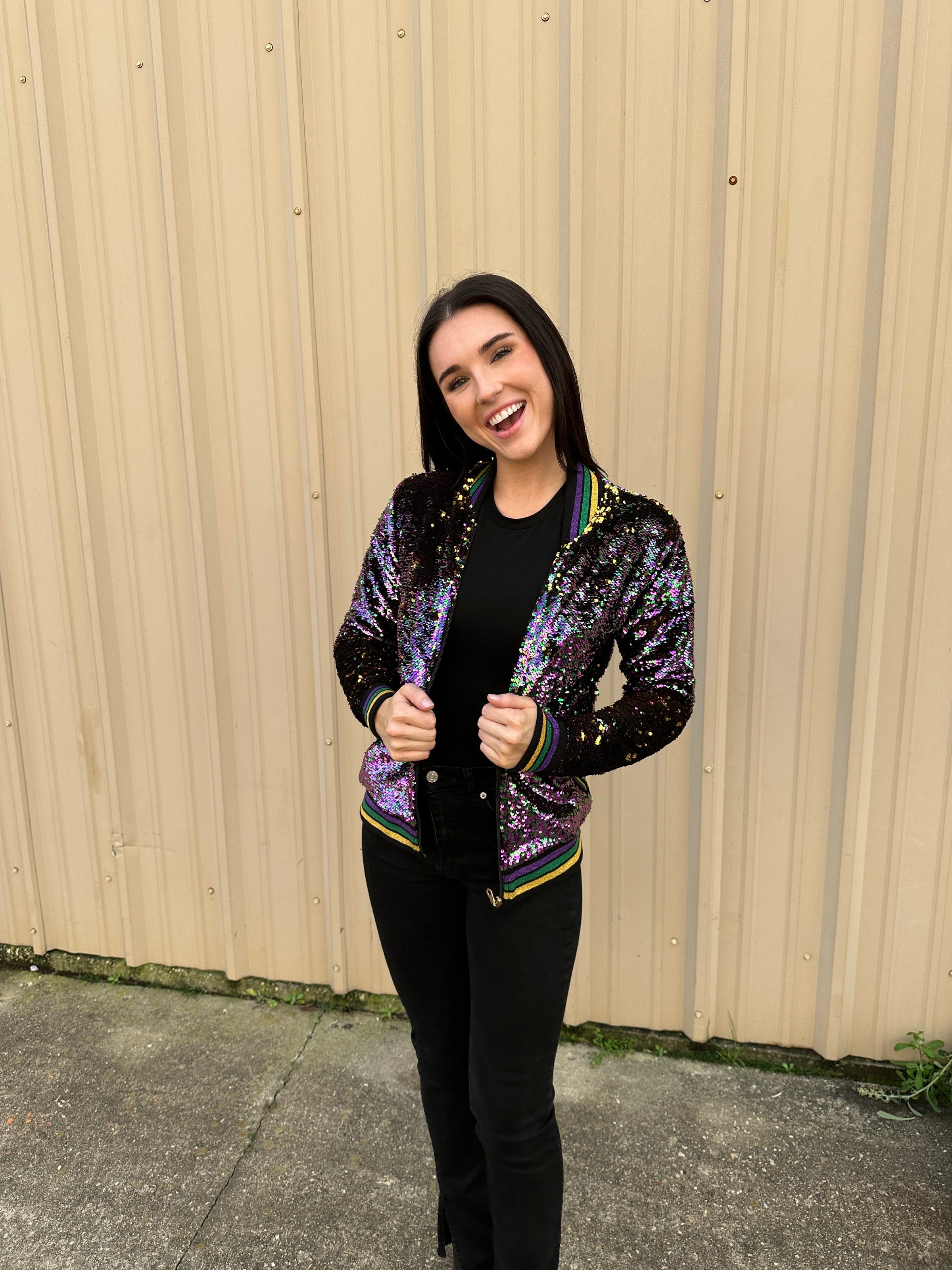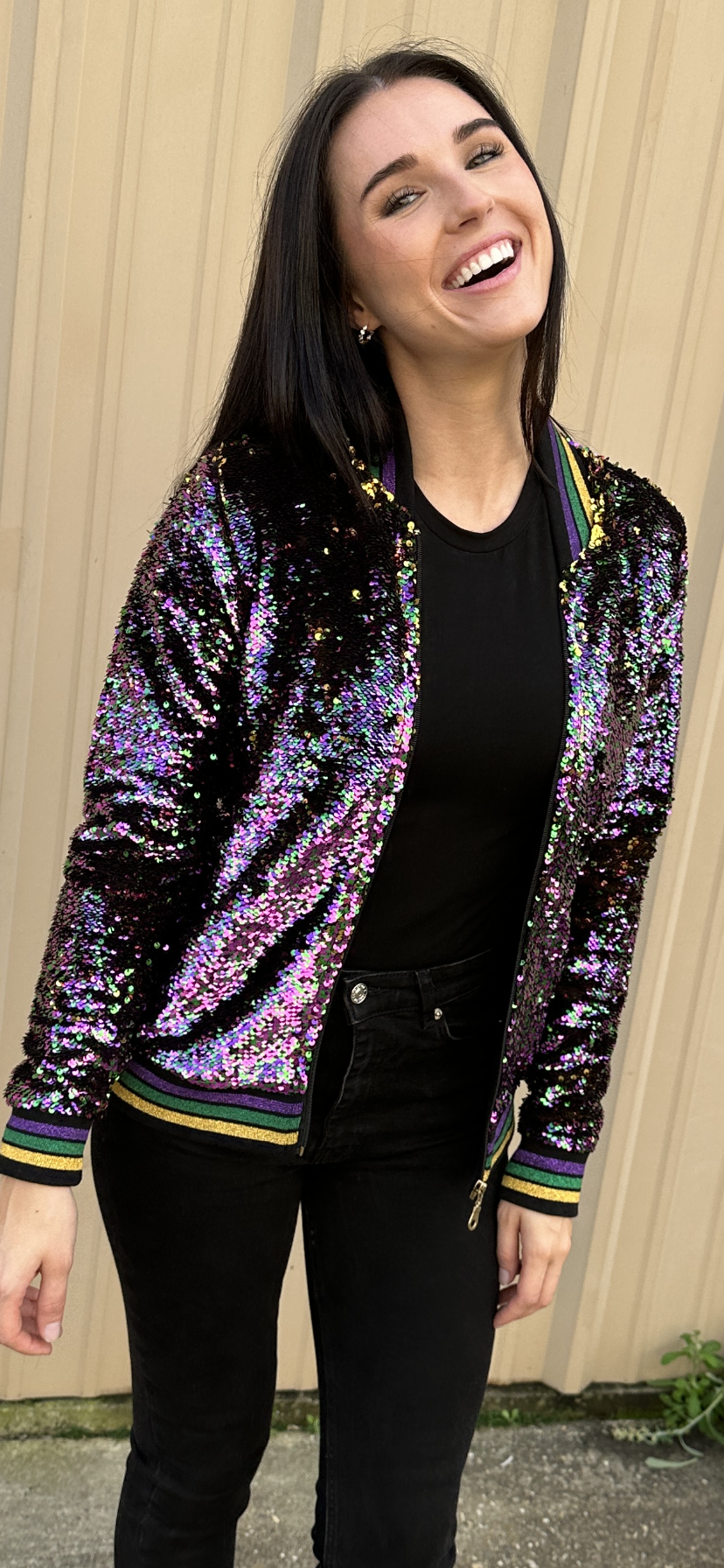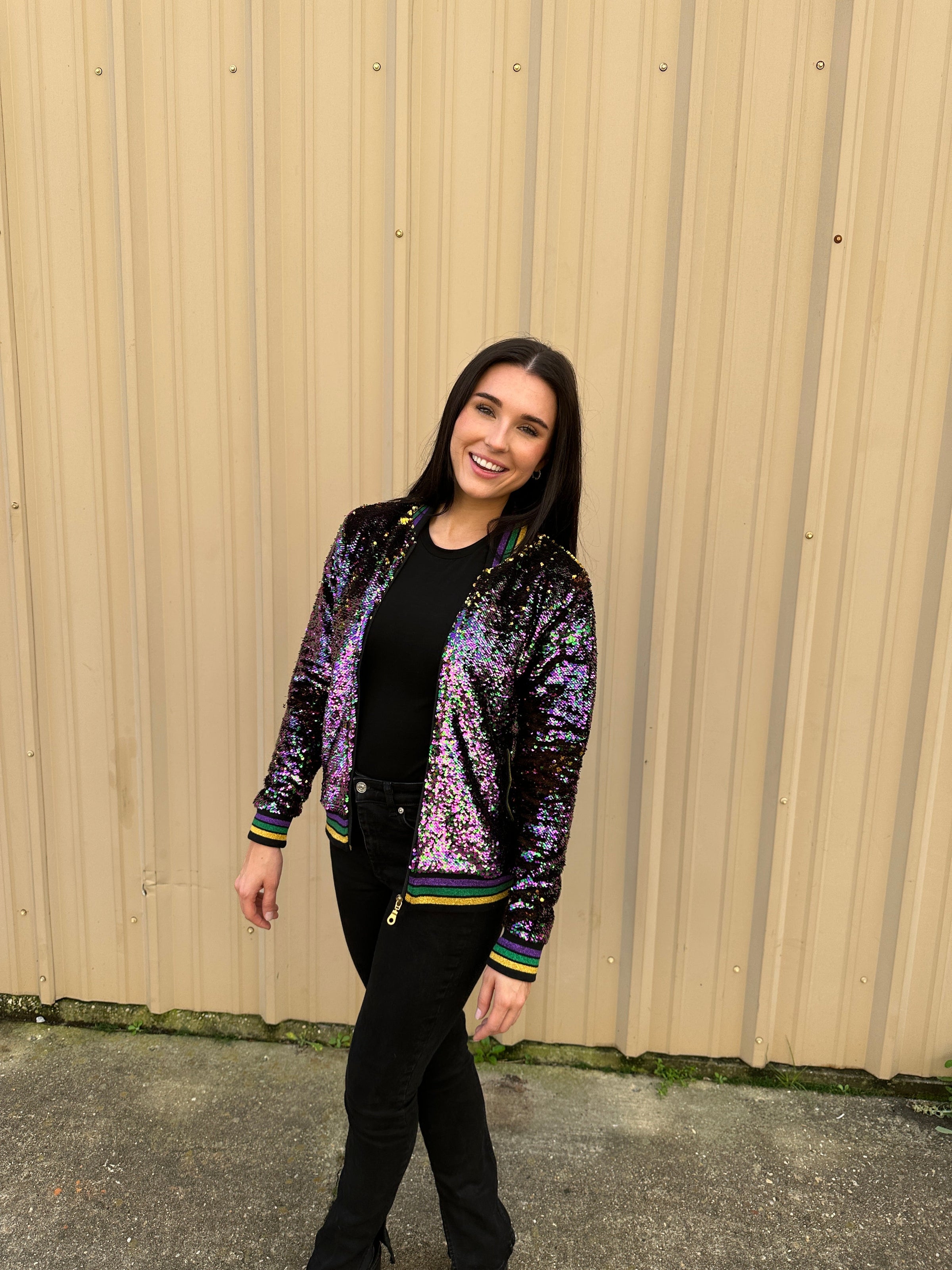 Celebrate Mardi Gras with this stylish long sleeved sequined bomber jacket. This jacket features purple green & gold sequins resembling a burst of confetti and a zip up design WITH pockets
