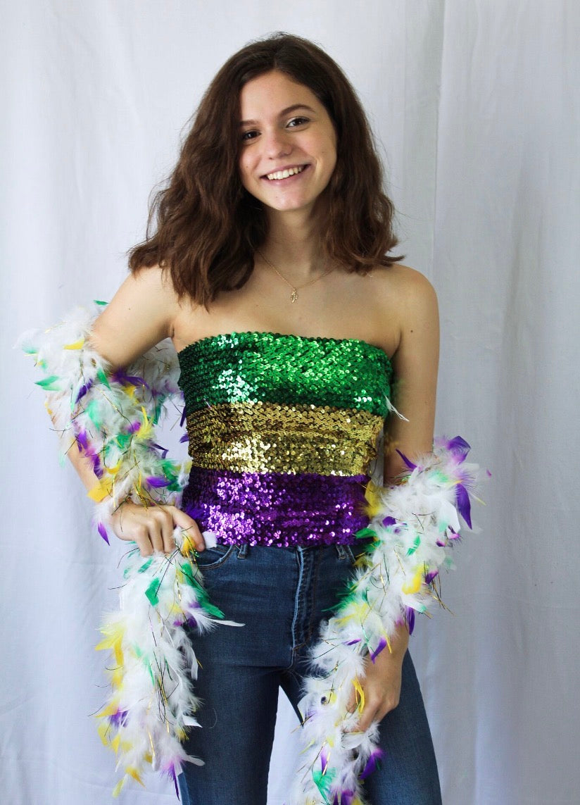 This Mardi Gras stretchable sequin tube top is a must have for your parading this season! Super stretchy you can also use it as a mini skirt. Looks fantastic as a tube top with a blazer and jeans or as a skirt with a long duster cardi!