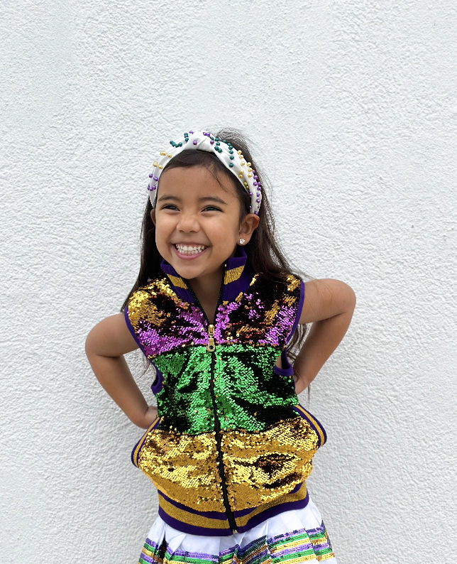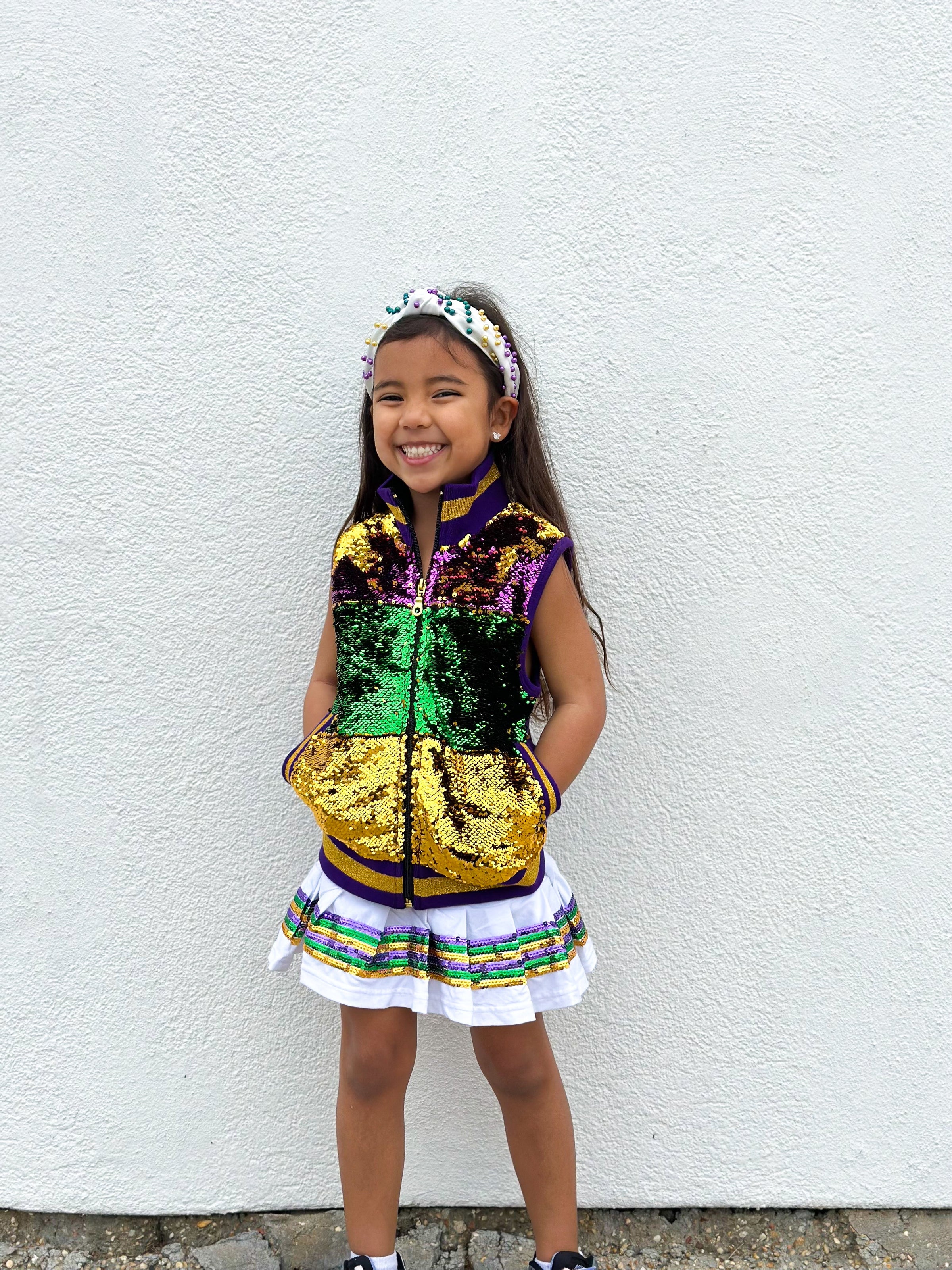 Put your Mardi Gras style on blast with this bright and bold sequin vest! Perfect for parades, festivals, and chill winter days, this color blocked stripe of purple, green, and gold will be you and your little's go-to for makin' a statement.
