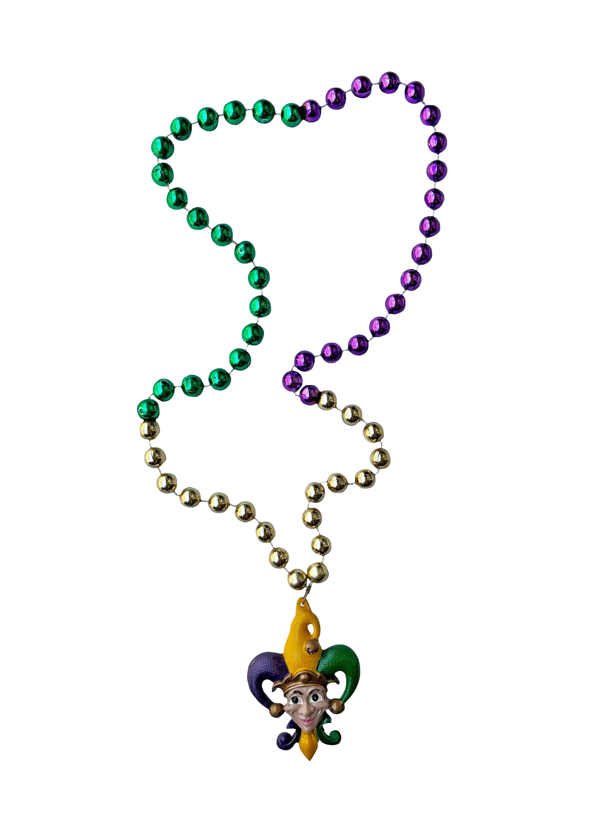 Dazzle the crowds with our Smiling Mardi Gras Jester specialty bead! This eye-catching parade treasure features a cheerful jester charm dangling from a strand of purple, green, and gold beads – the traditional colors of Mardi Gras revelry. Perfect for catching attention on the parade route or adding a touch of carnival spirit to your celebration.