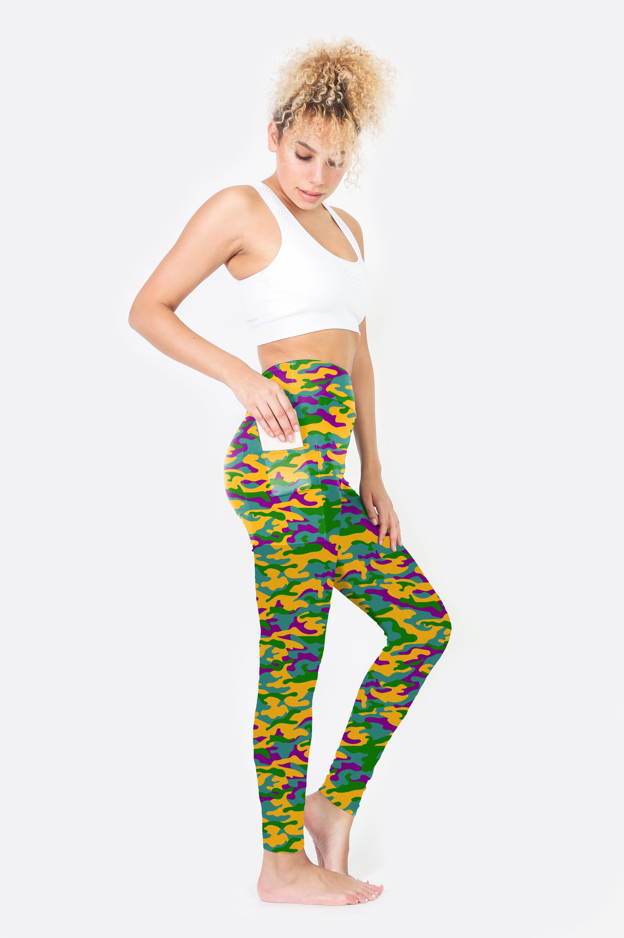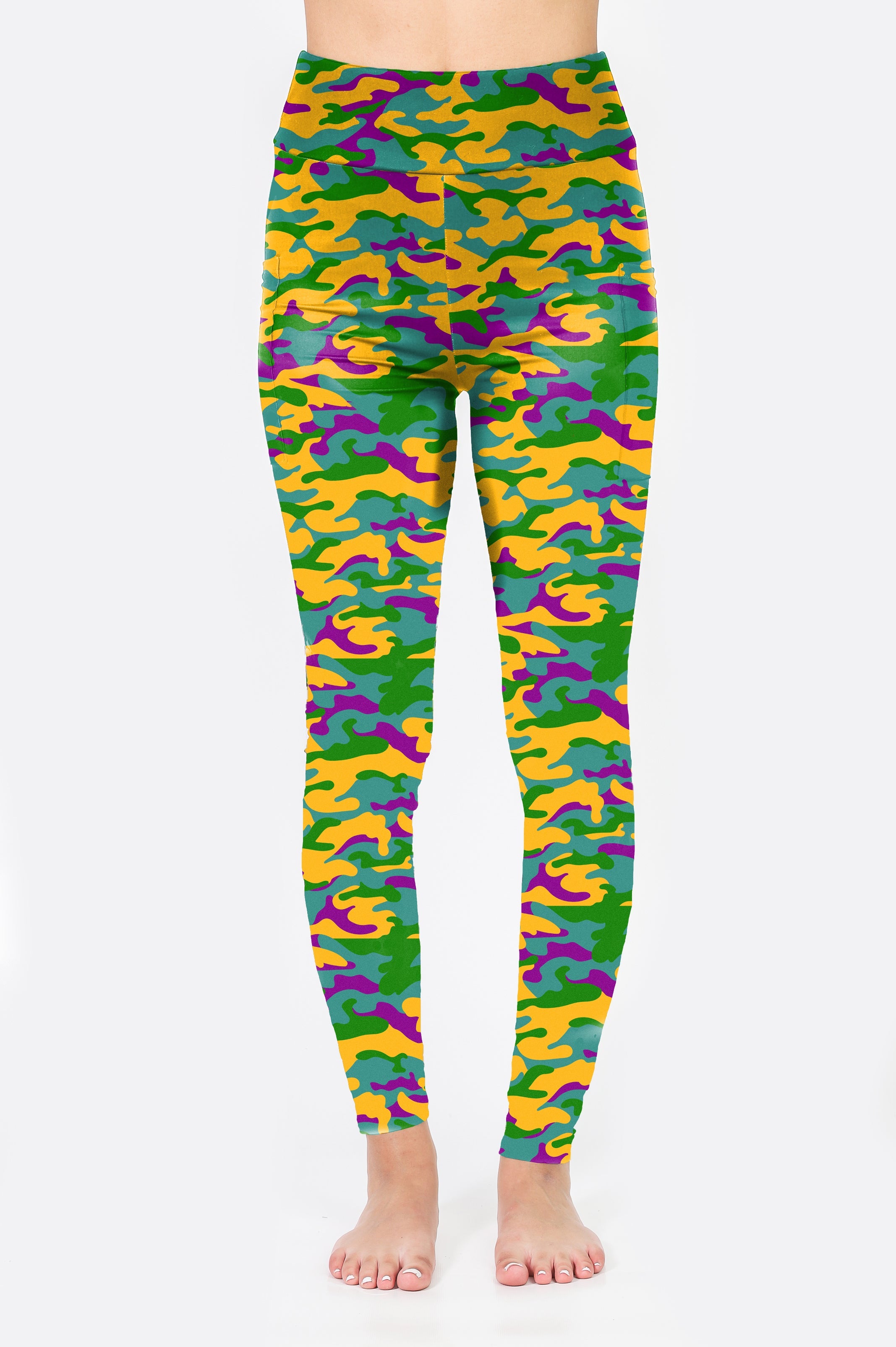 Go from your workout to parading! We are obsessed with this super cool, fun and colorful purple green and gold camouflage print spandex leggings! Each one is one of a kind with spandex, high waisted with a yoga band!