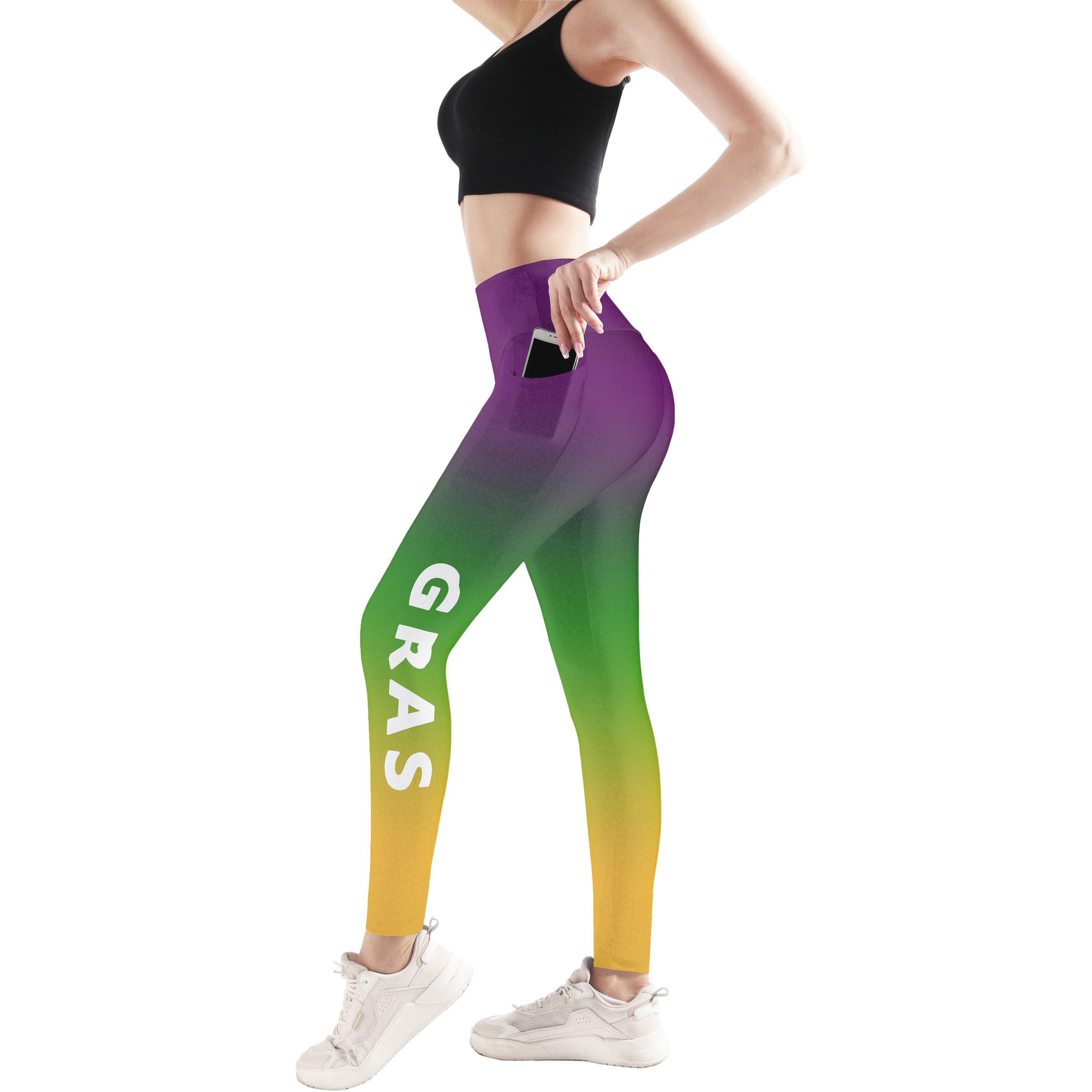 Go from your workout to parading! We are obsessed with this super cool, fun and colorful purple green and gold spandex leggings! Each one is one of a kind with spandex, high waisted with a yoga band!