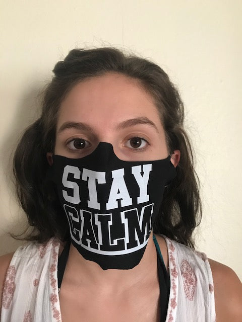 Mask Up in style! This black reusable face mask features "Stay Calm" in block print and ear loops. One size fits most.