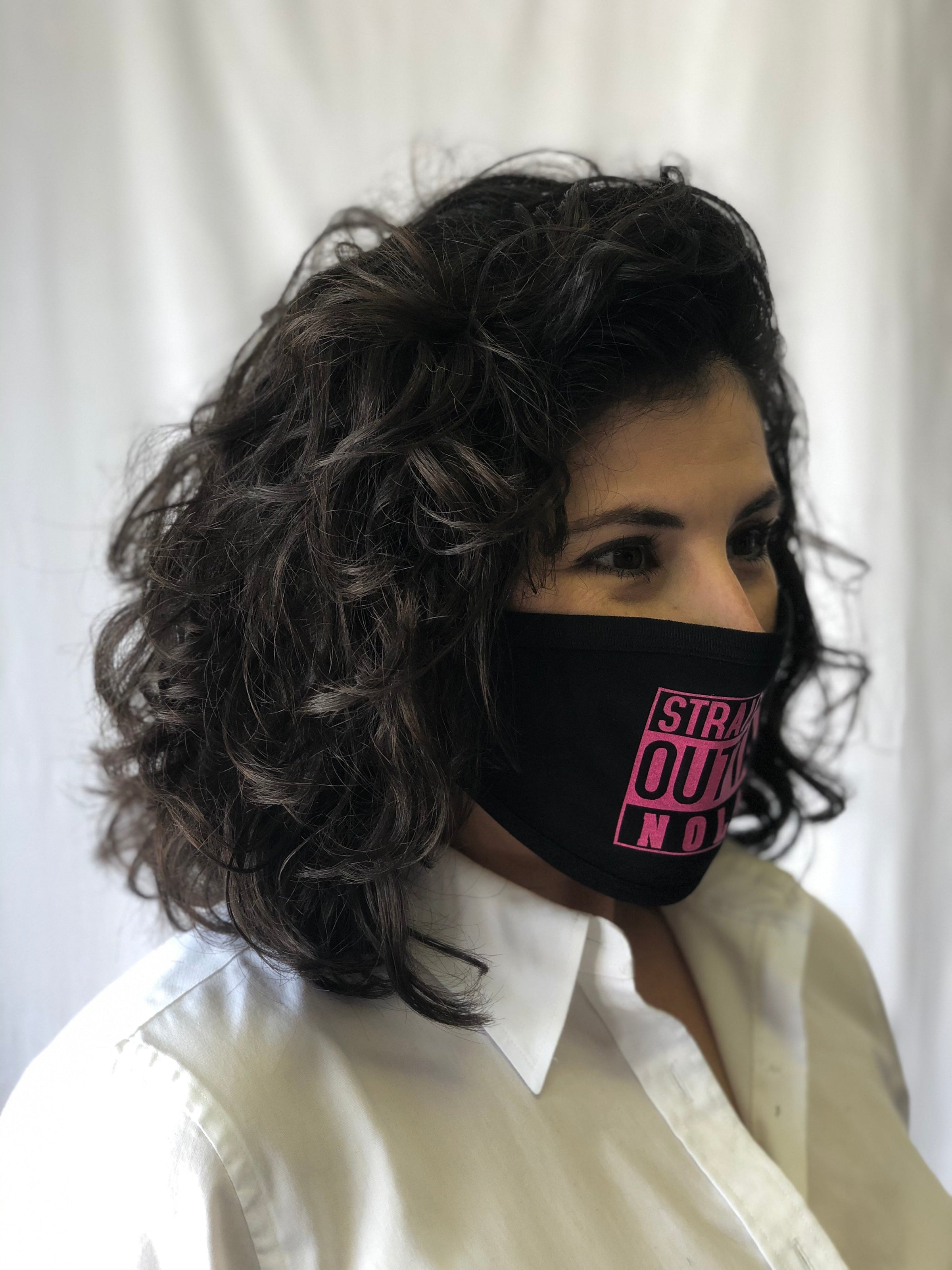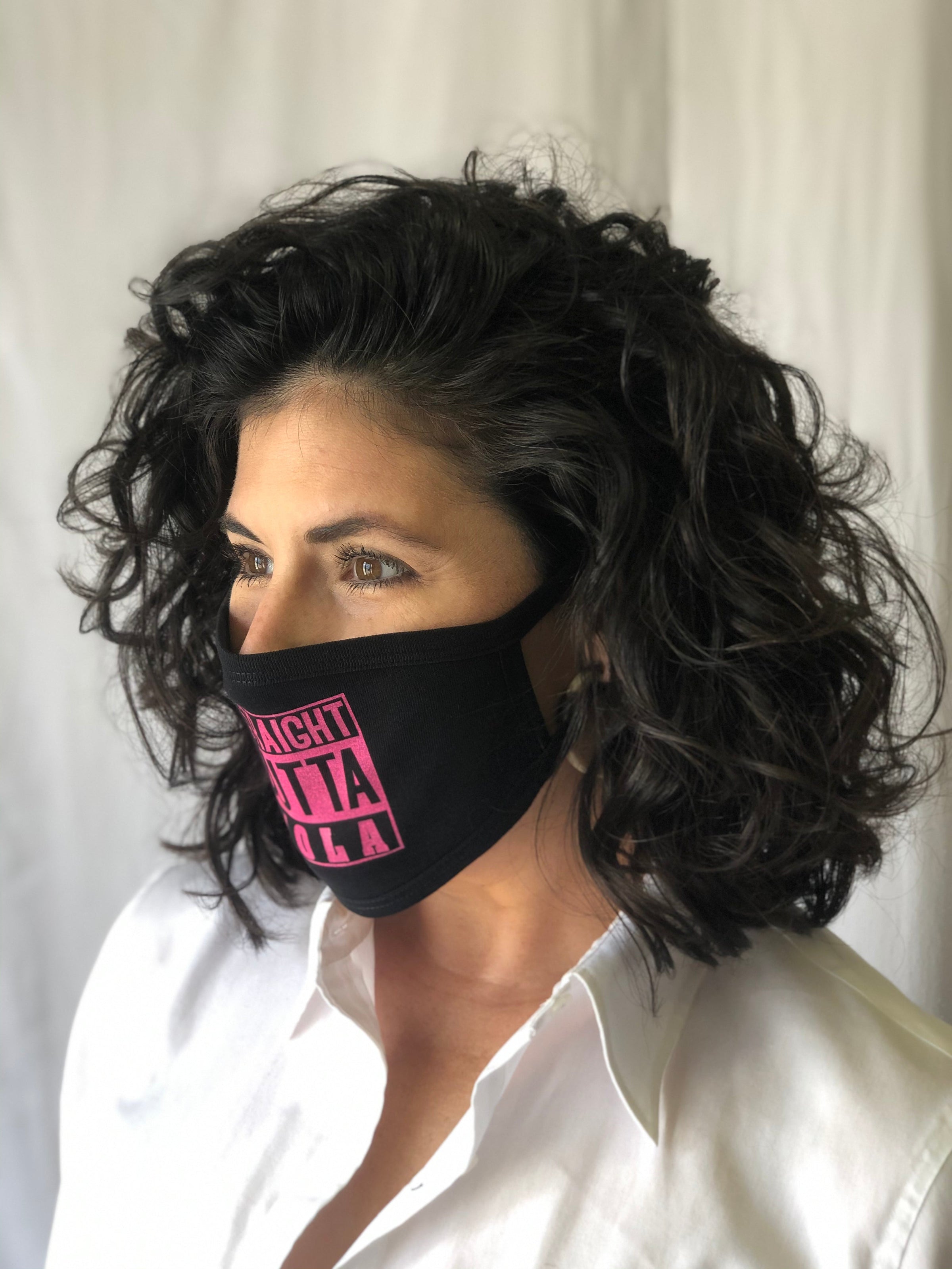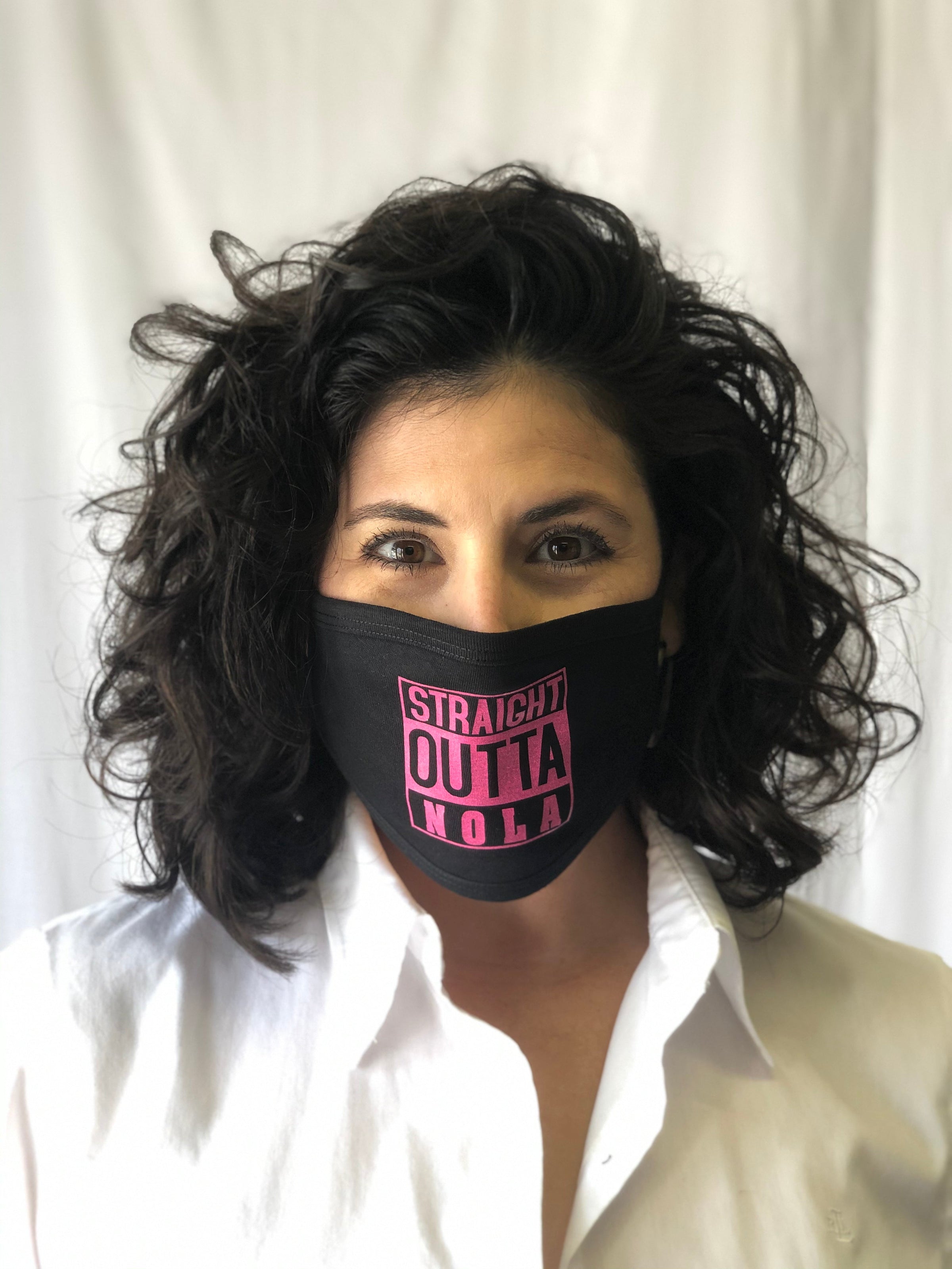Mask Up in style! This black reusable face mask features "Straight Outta NOLA" in pink and ear loops. One size fits most.