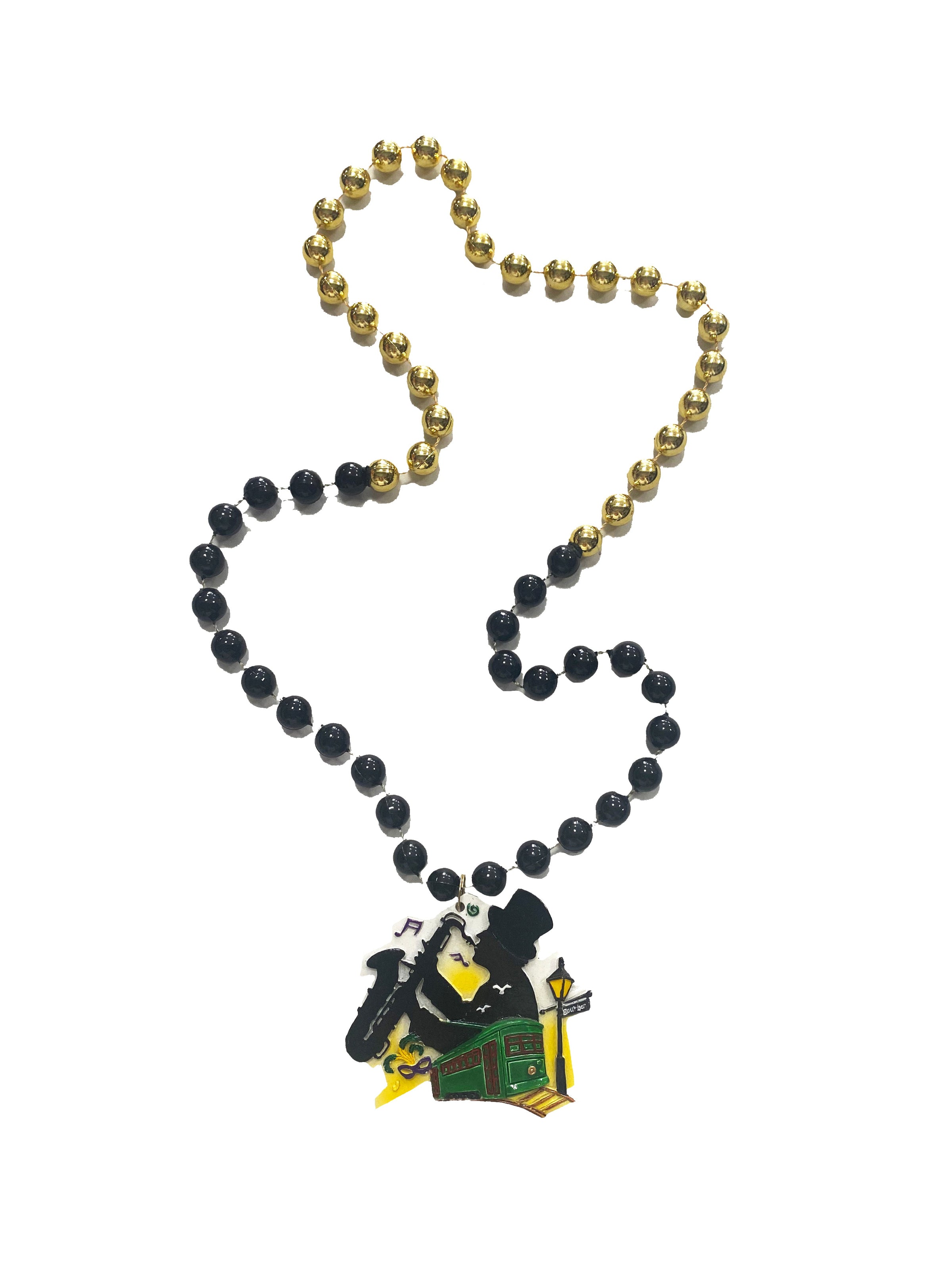 The iconic street musician done in silhouette t as he plays his saxophone. Also featured are the green street car and street lamp. This Medallion is approximately 3 1/2" wide x 2 1/2" high sitting at the end of a 42" long black and gold 12mm beaded necklace.