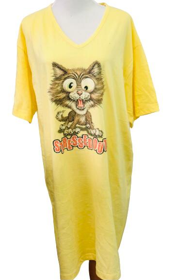 This comfy nightshirt features a super stressed kitty and "Stressed Out" printed across the chest