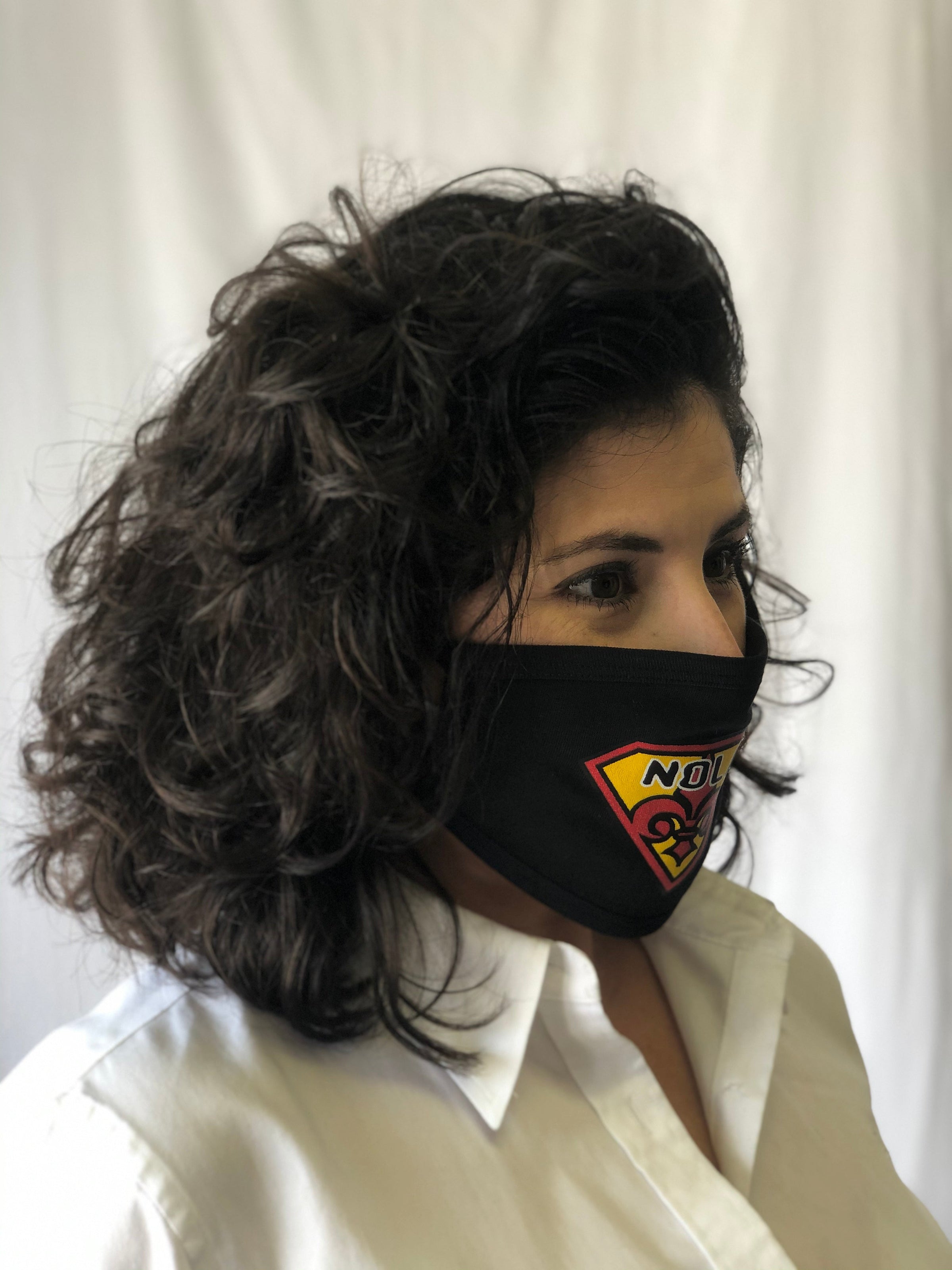 Mask Up in style! This black reusable face mask features a red and yellow super emblem, with NOLA and a fleur de lis in the center, and ear loops. One size fits most.