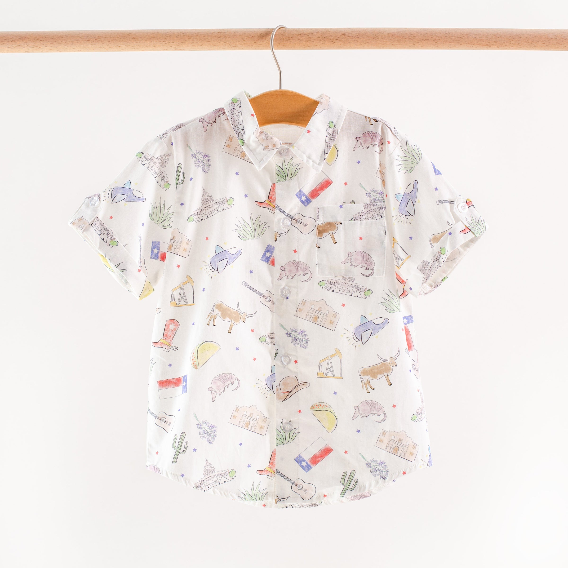 Bring a little Lone Star pride to your child’s wardrobe with the Texas Kids Organic Cotton Boys’ Collared Shirt—a playful celebration of everything Texas! Featuring a whimsical print of cowboy hats, longhorns, boots, tacos, guitars, armadillos, and more, this festive button-down is perfect for game days, school events, family celebrations, and everyday adventures.