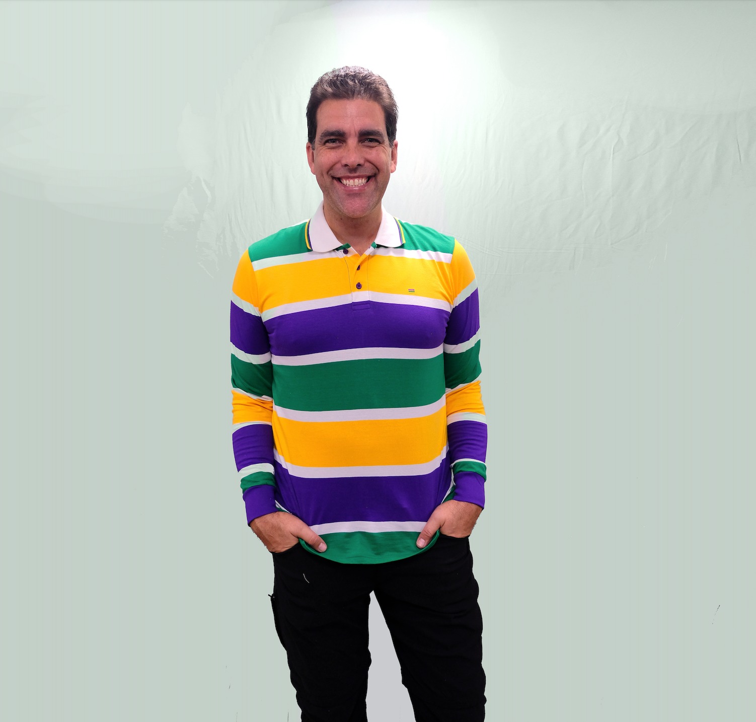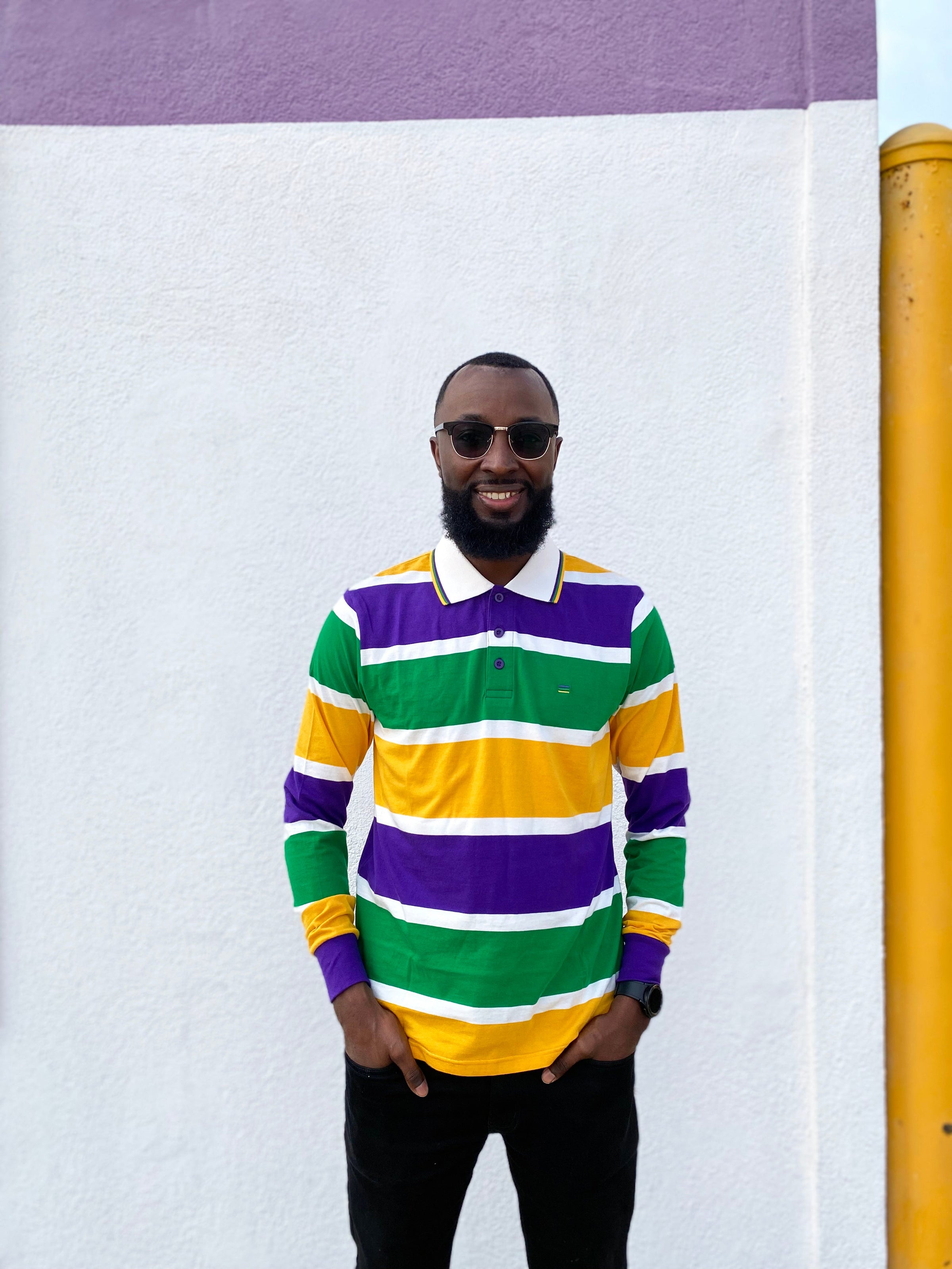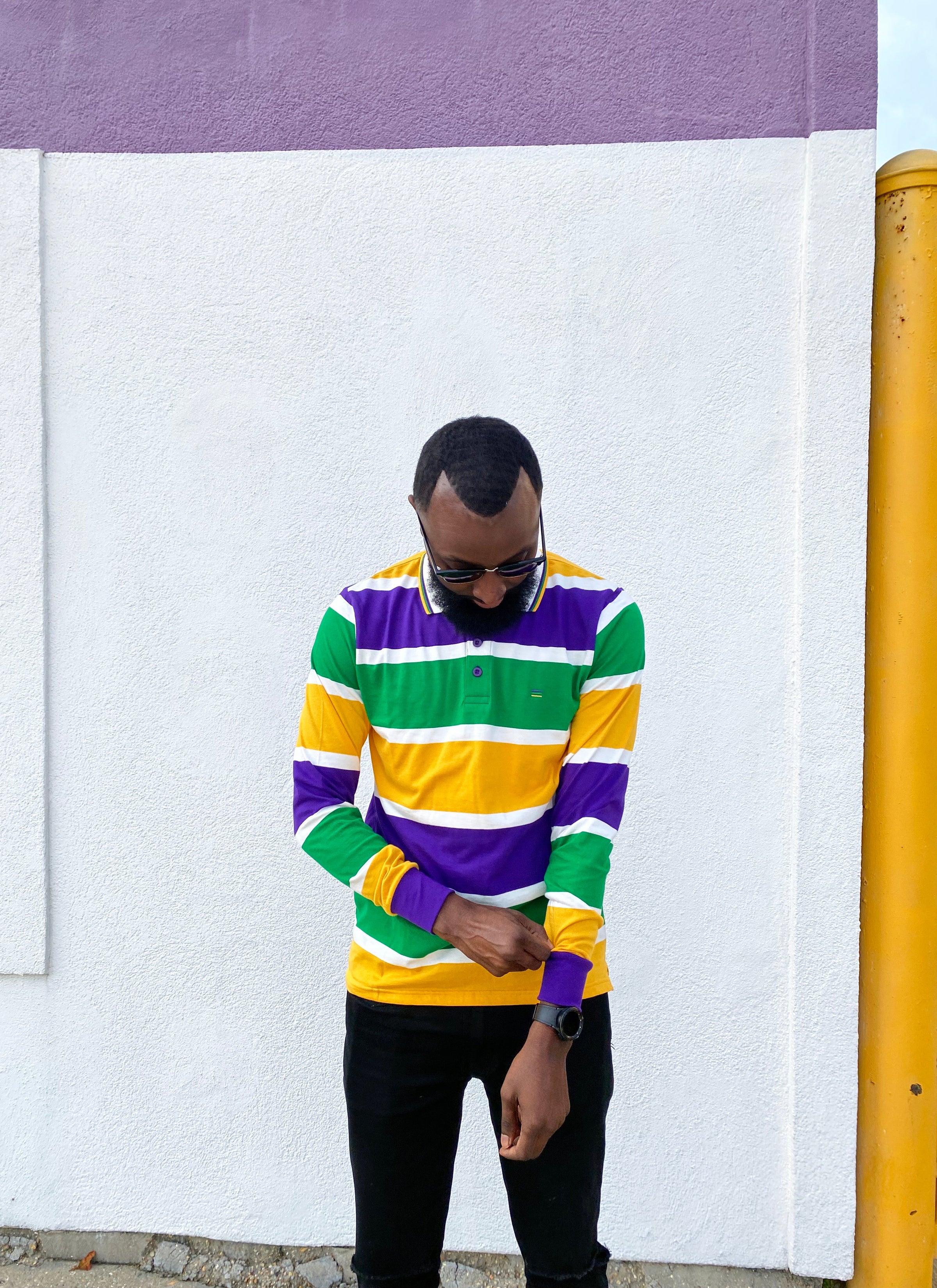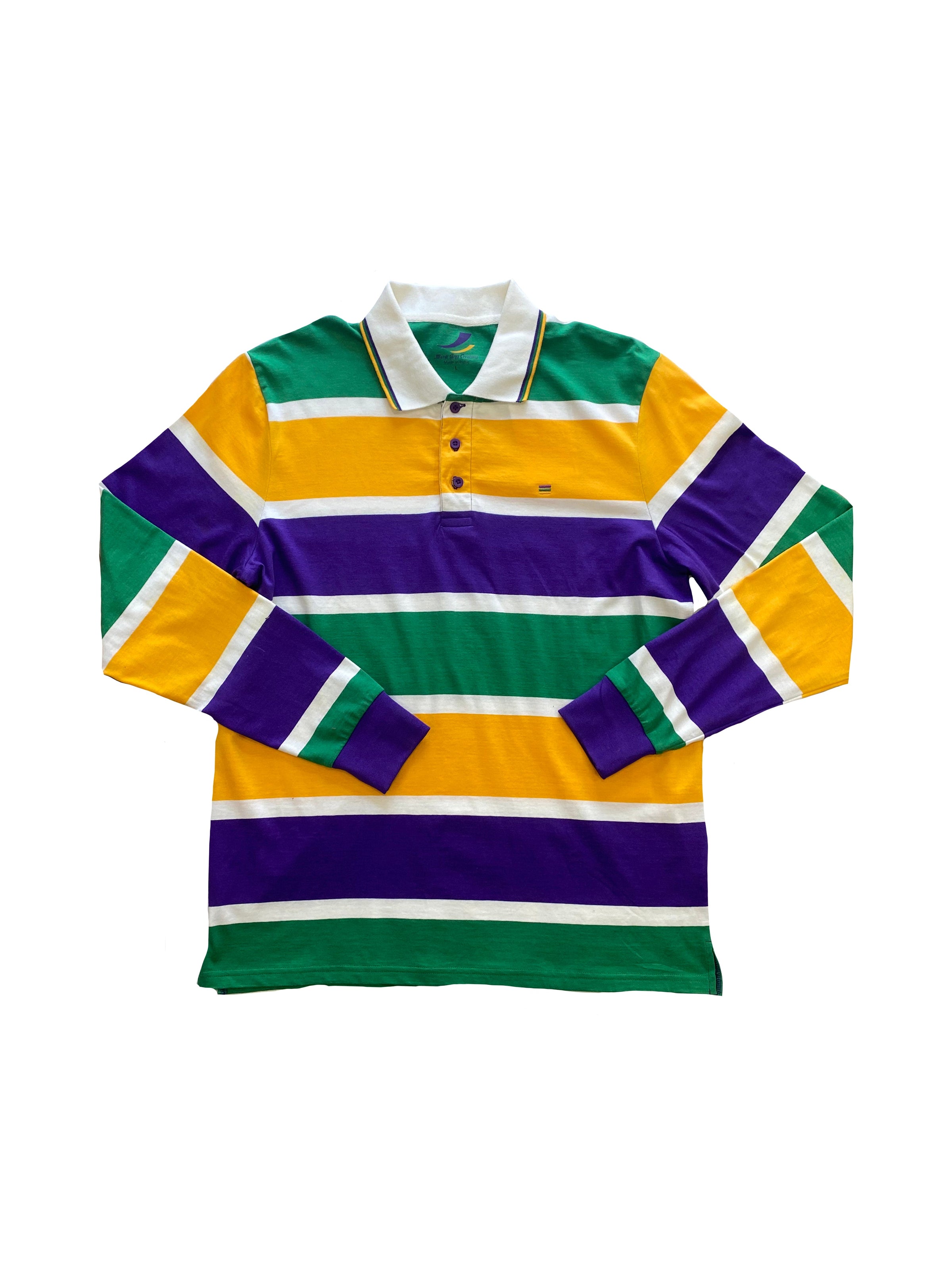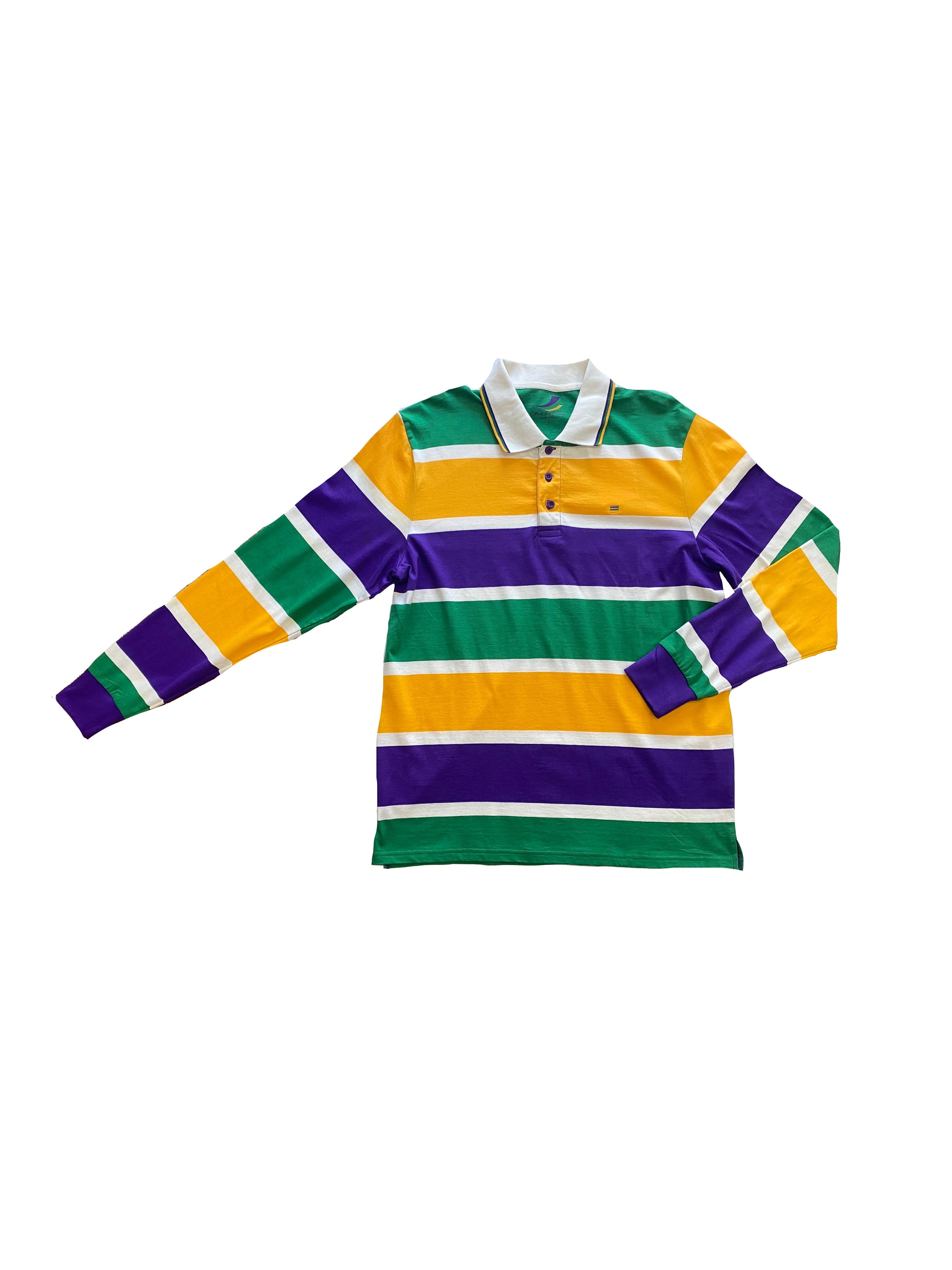 Make a splash with this Thick Stripe Rugby Adult Long Sleeve, perfect for expressing your unique style and festive look. Made with purple, green, and gold stripes and featuring a polo-style collar, this shirt is sure to be a hit at any event. Enjoy its fun and inviting design with the whole krewe!