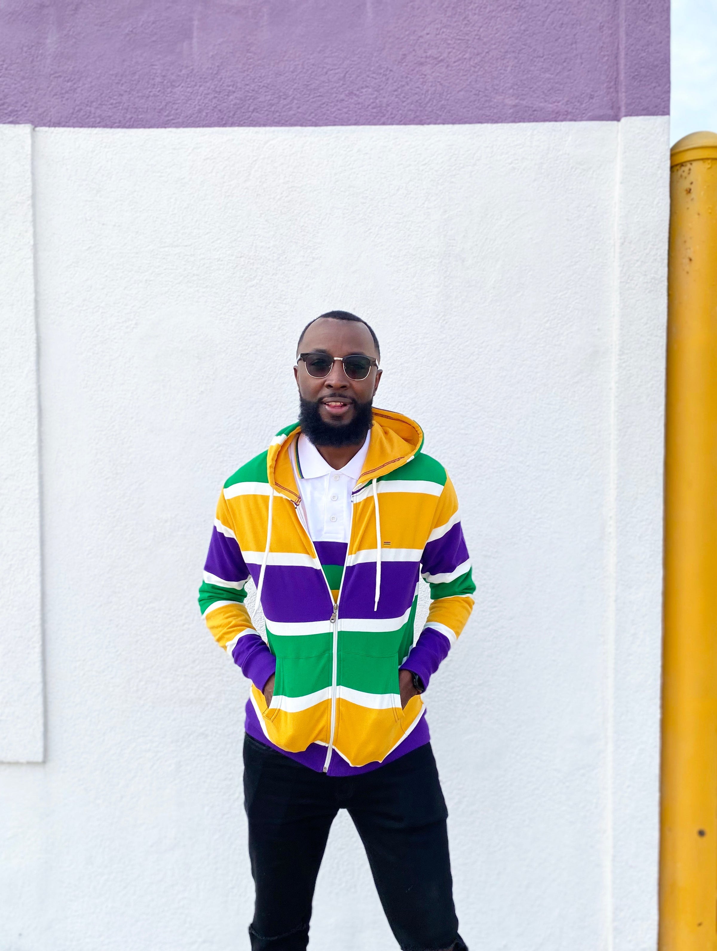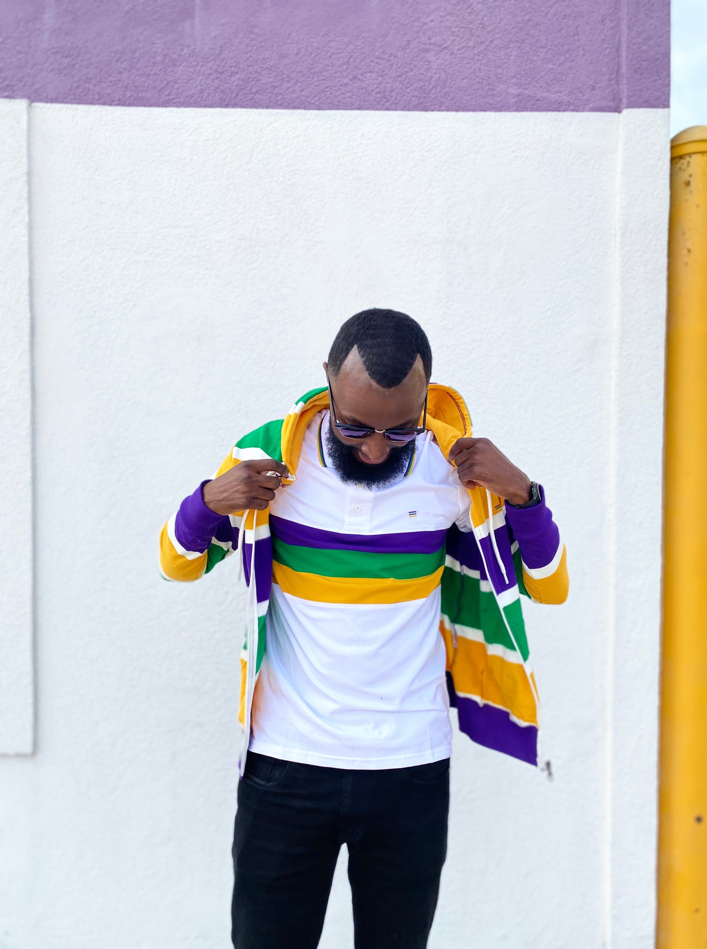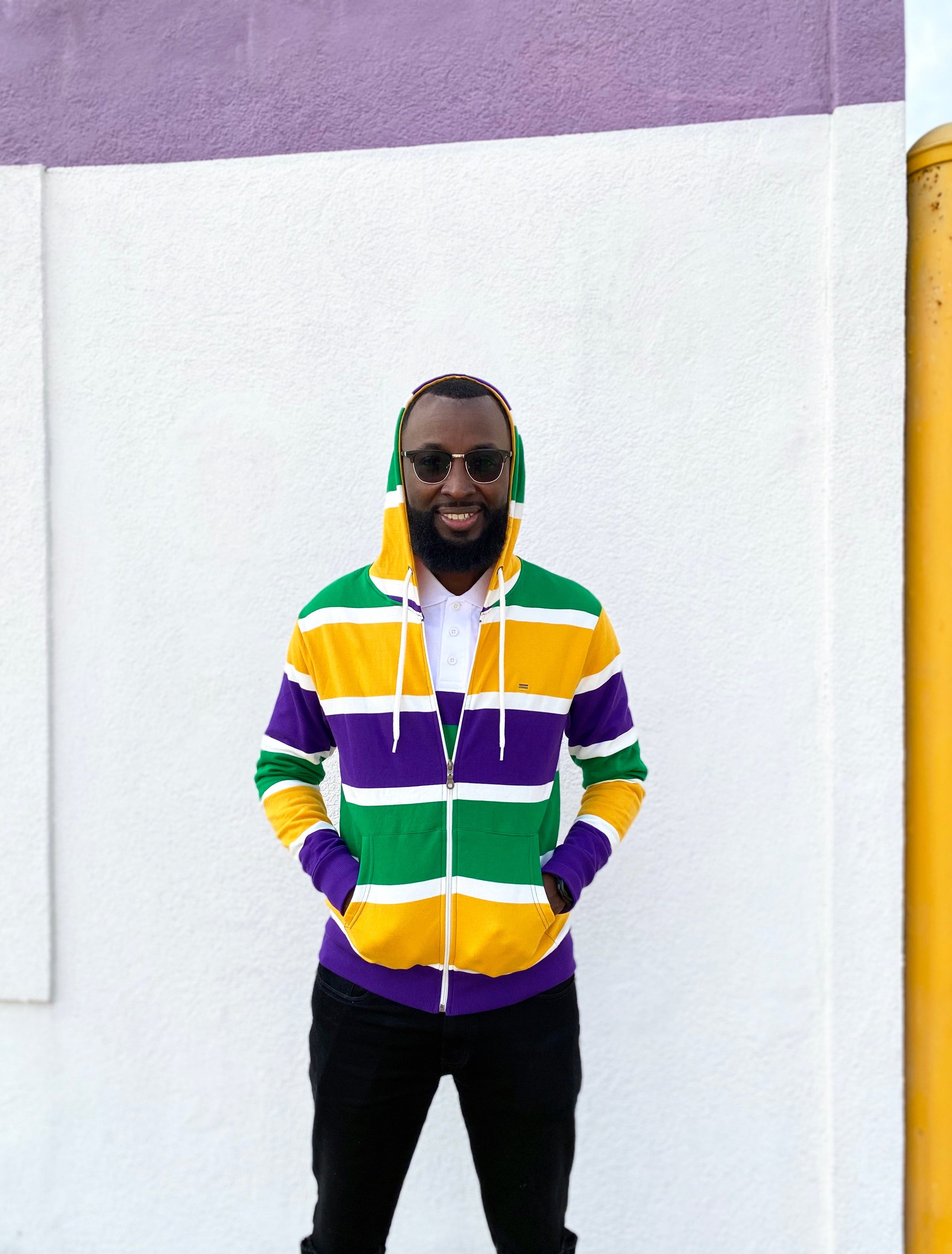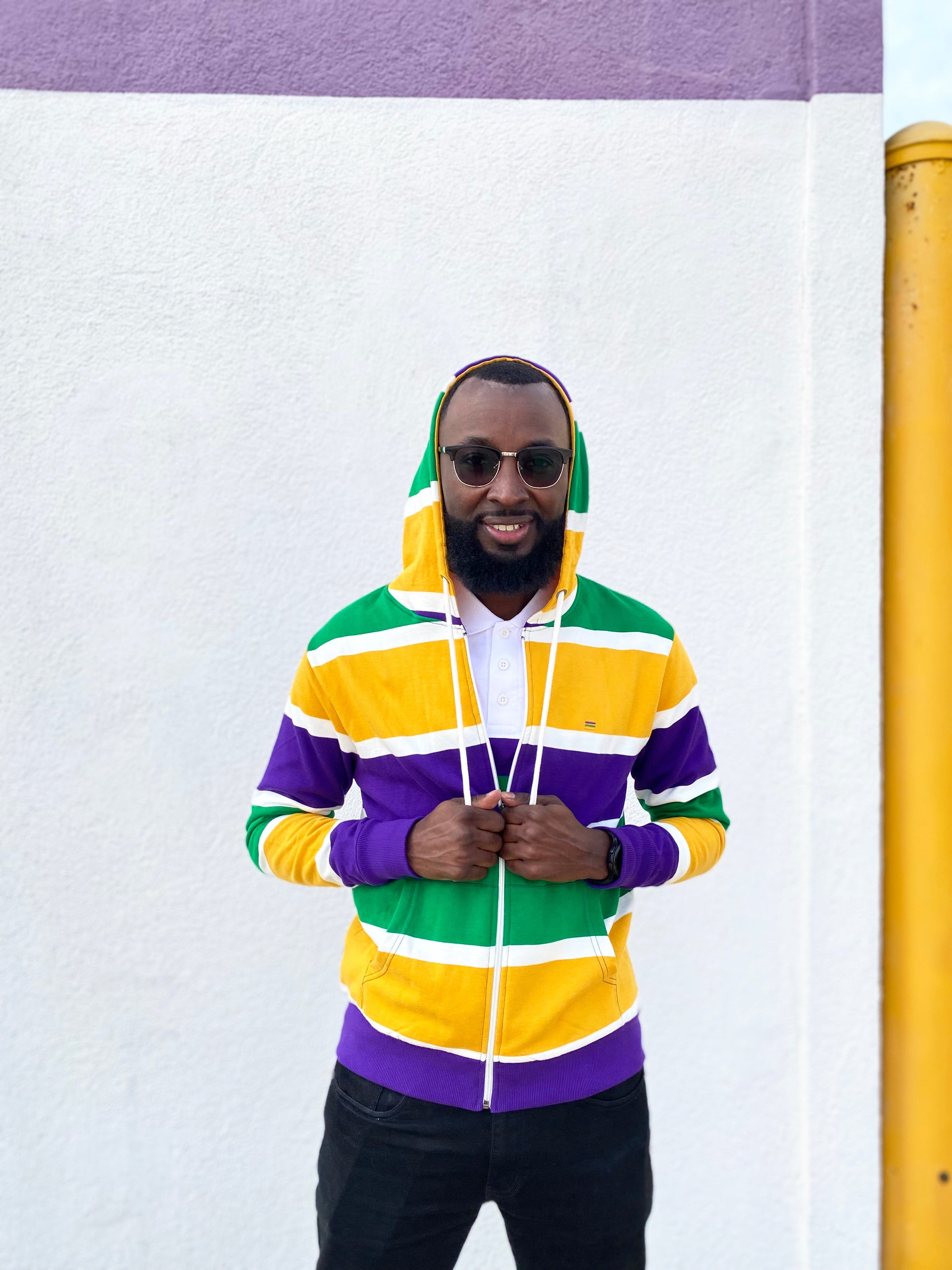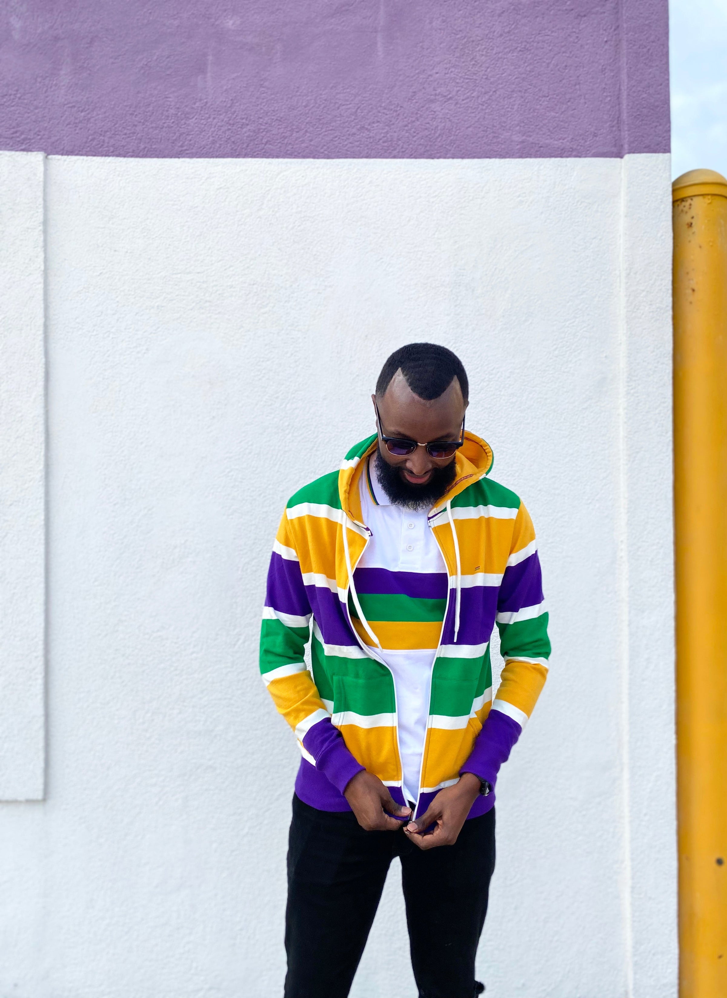 Stay cozy and make a statement with this Thick Stripe Rugby Adult Pullover Hoodie! Featuring purple, green, and gold - perfect for Mardi Gras - you'll be ready to battle cold winter weather AND match your krewe! Get your hoodie and let the good times roll!