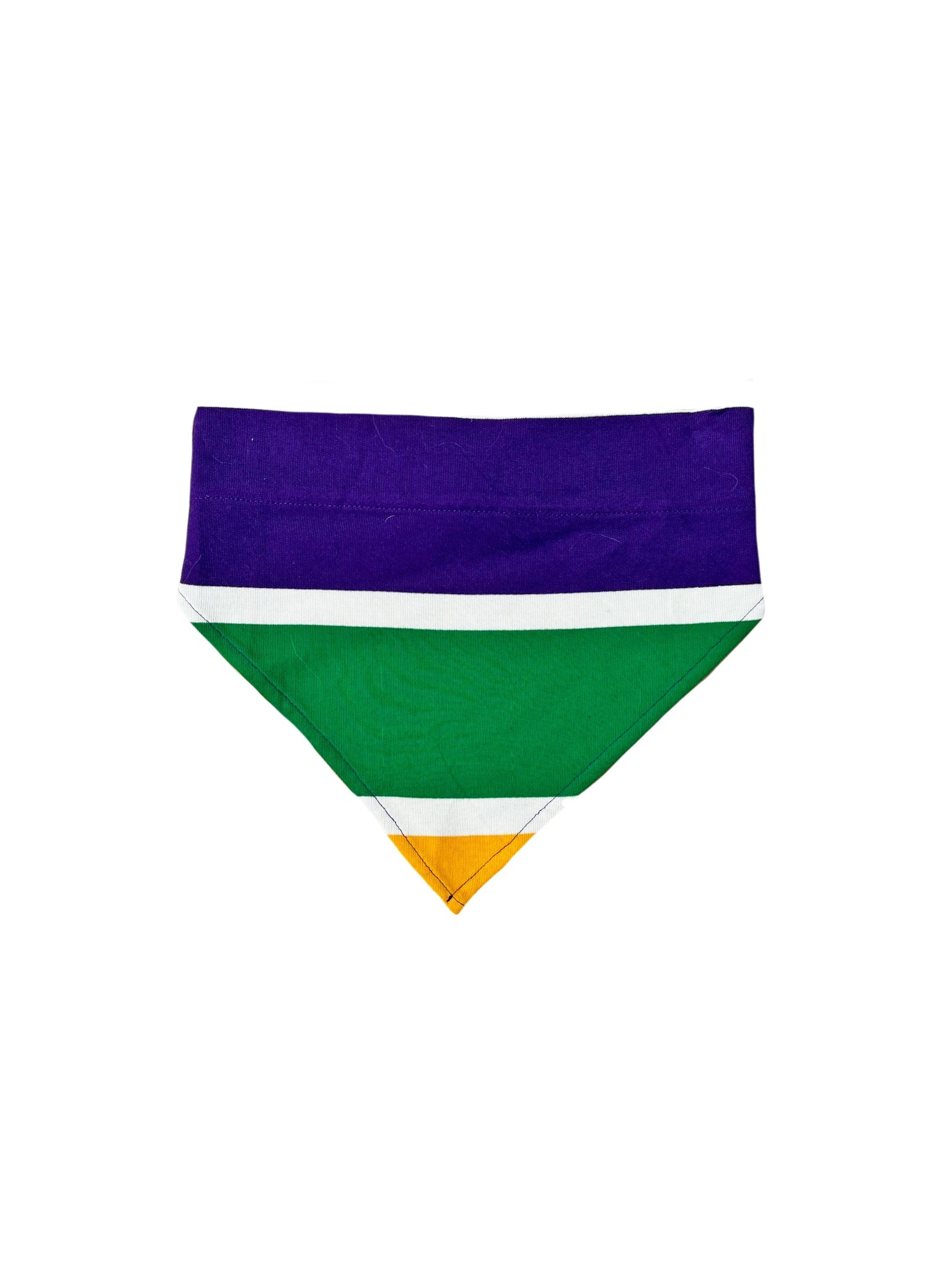 Get ready to pawty with your pup in style with our Thick Stripe Rugby Pet Scarf! Featuring purple, green, and gold stripes, this scarf can snap closed or slide onto your furry friend's collar. Perfect for Mardi Gras, your pup will be the center of attention and the talk of the town.