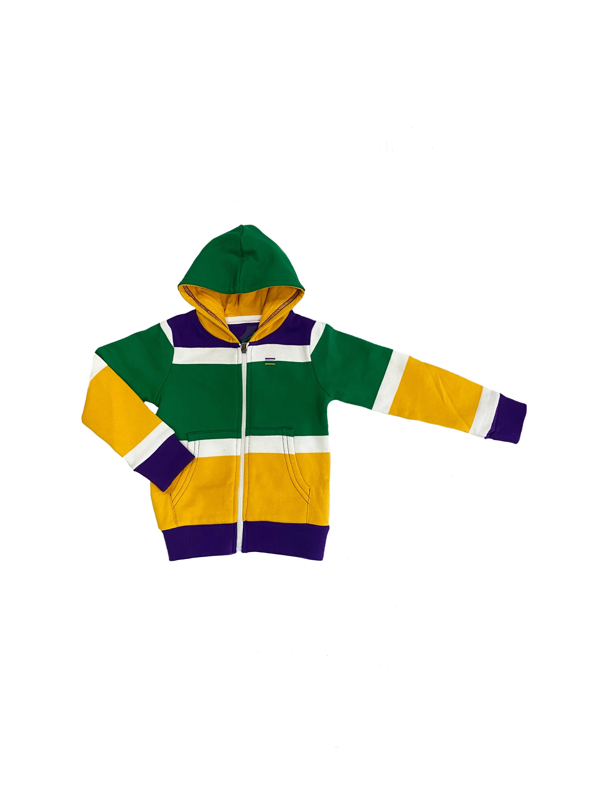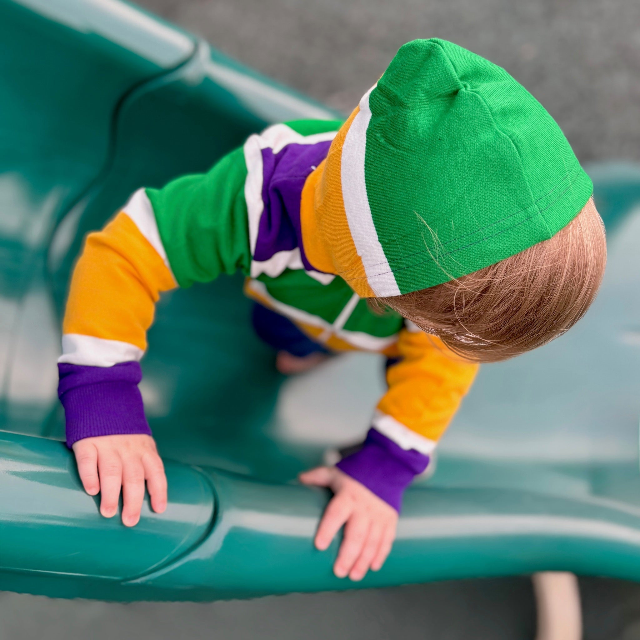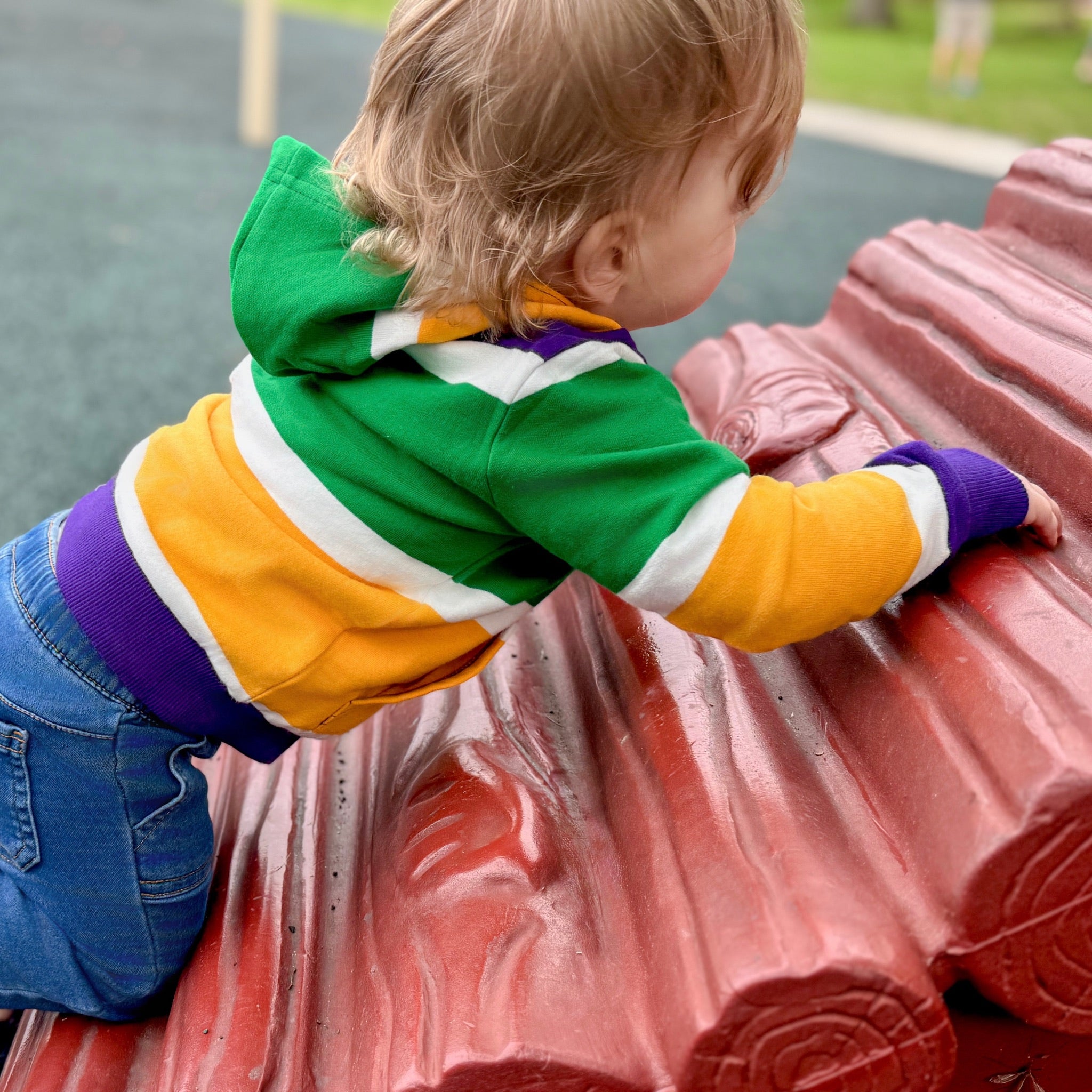 Gather 'round, because this Thick Stripe Rugby Toddler Pullover Hoodie is fit for a festive celebration! Perfect for a little one to keep up with the krewe, the purple green and gold stripes are like having a Mardi Gras parade right on your back! Now that's something to cheer about!