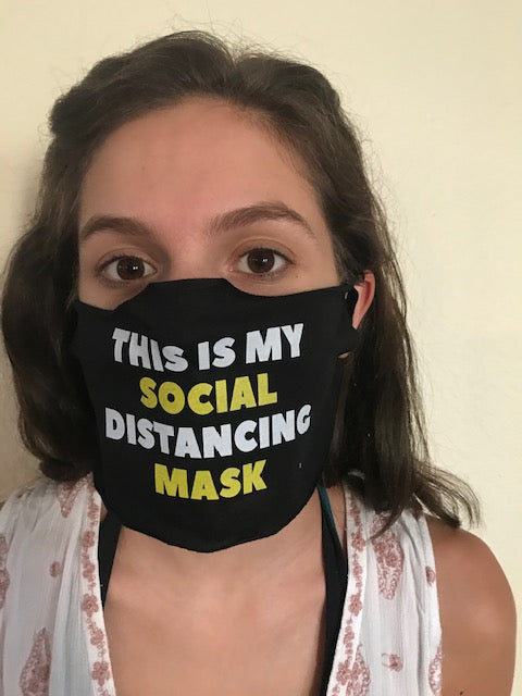 Mask Up in style! This black reusable face mask reads "This is my social distancing face mask" in block letters. One size fits most.