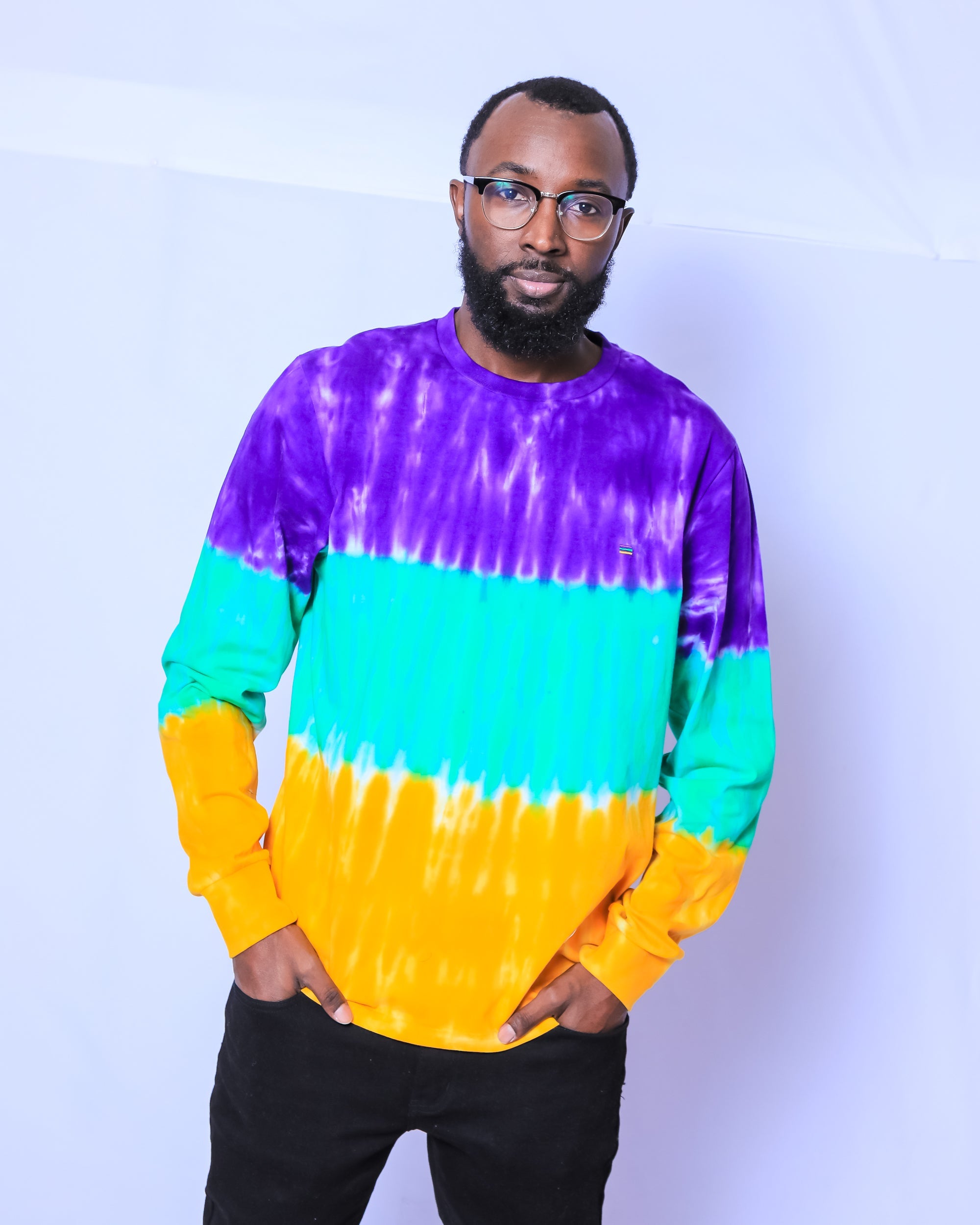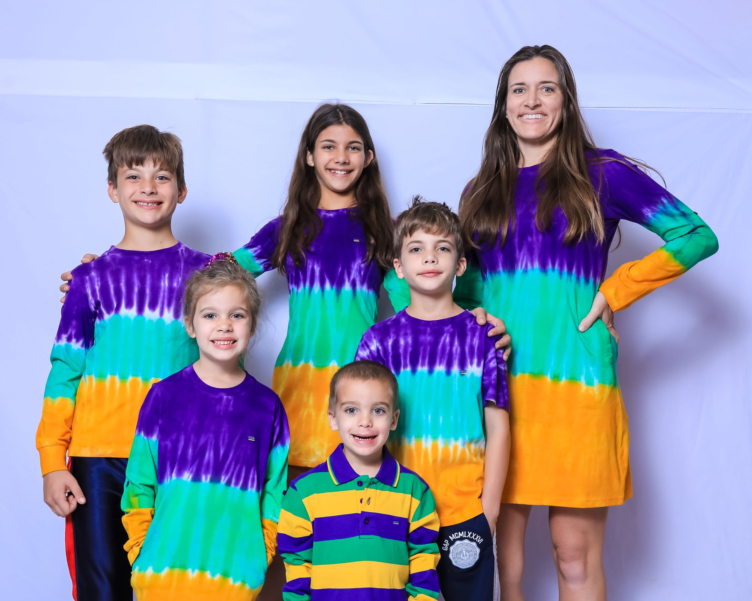 Celebrate Mardi Gras with this stylish tie dye long sleeved Mardi Gras shirt. This shirt features purple, green and gold tie dye striped print.