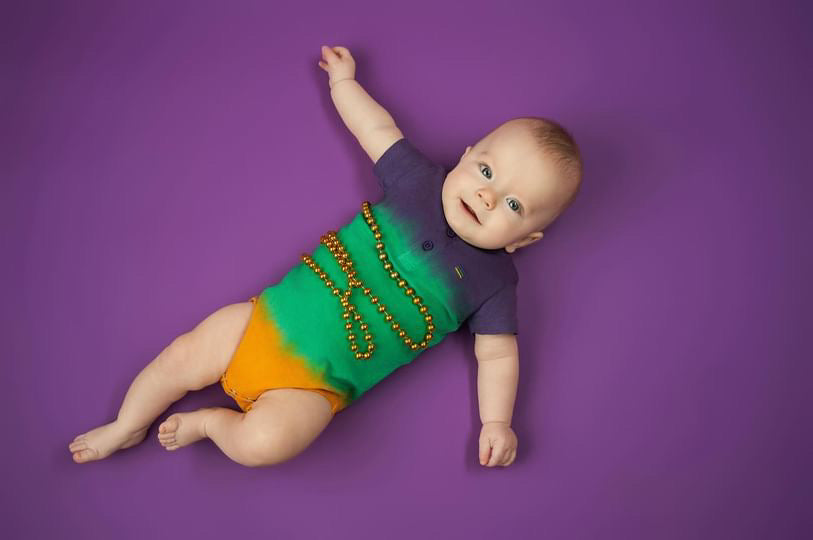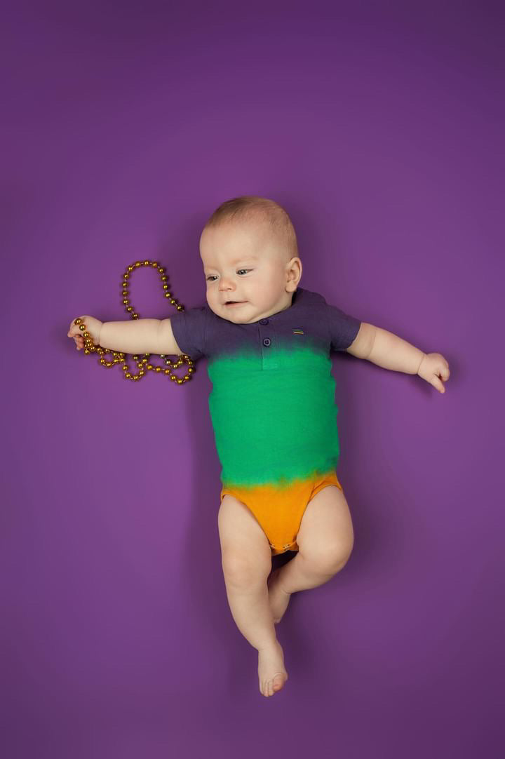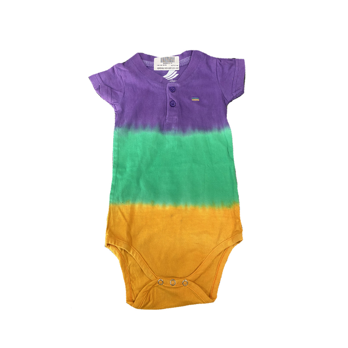 Celebrate Mardi Gras with this infants stylish purple green & gold tie dye stripe short sleeve onesie. This onesie features a purple, green and gold stripe tie dye print and snap button flap