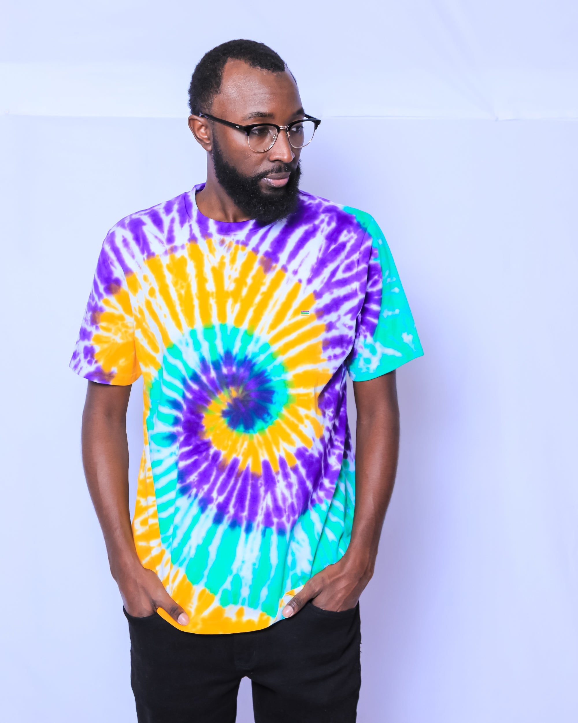 Celebrate Mardi Gras with this stylish tie dye short sleeved Mardi Gras shirt. This shirt features purple, green and gold tie dye swirl print.