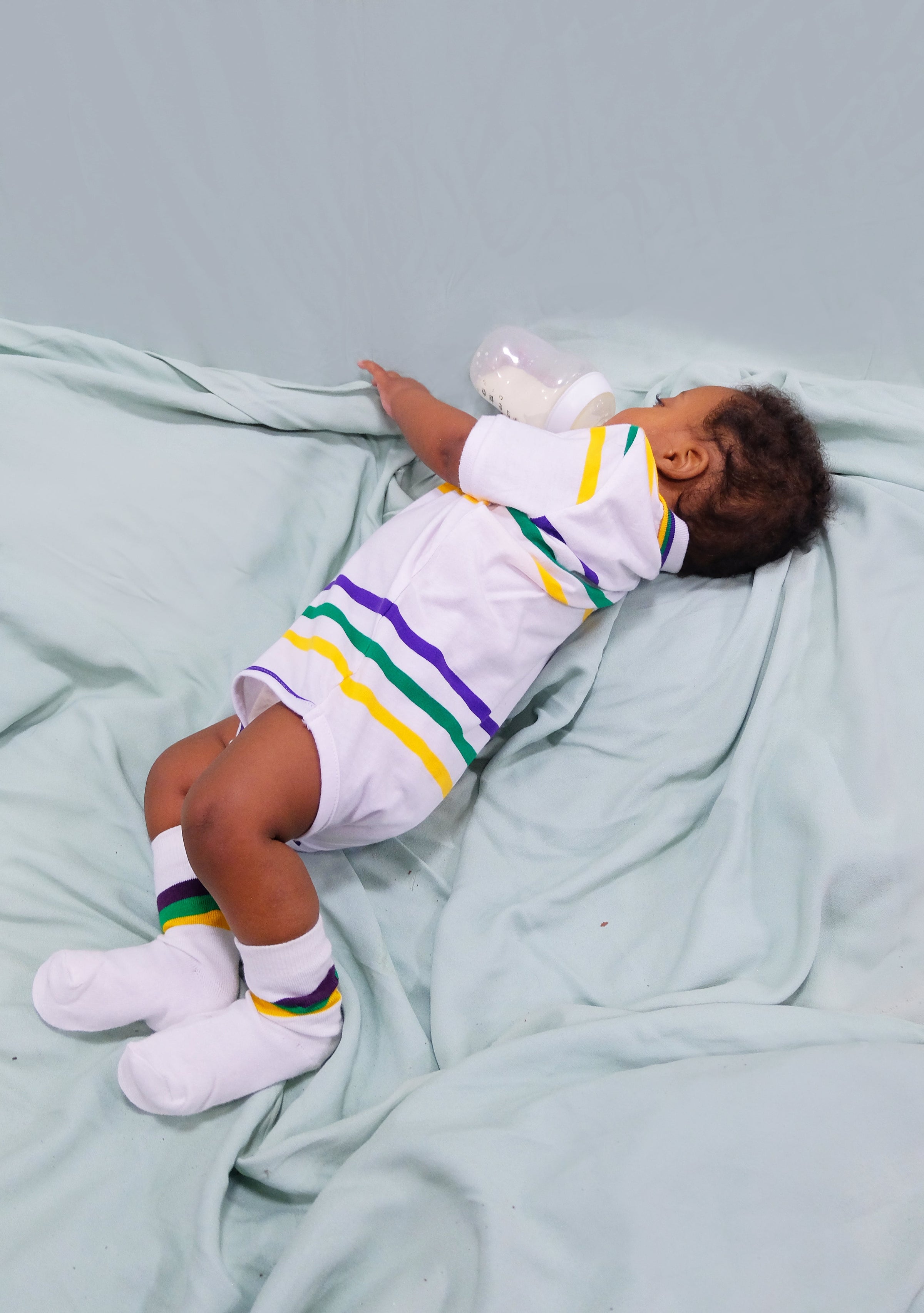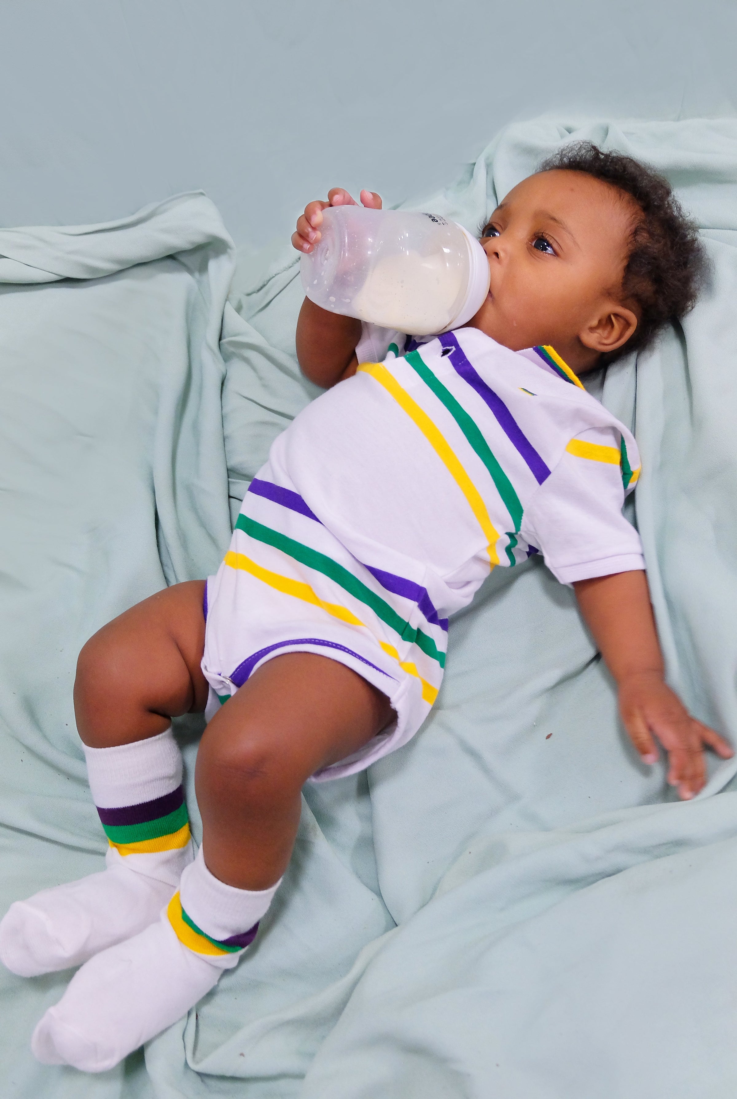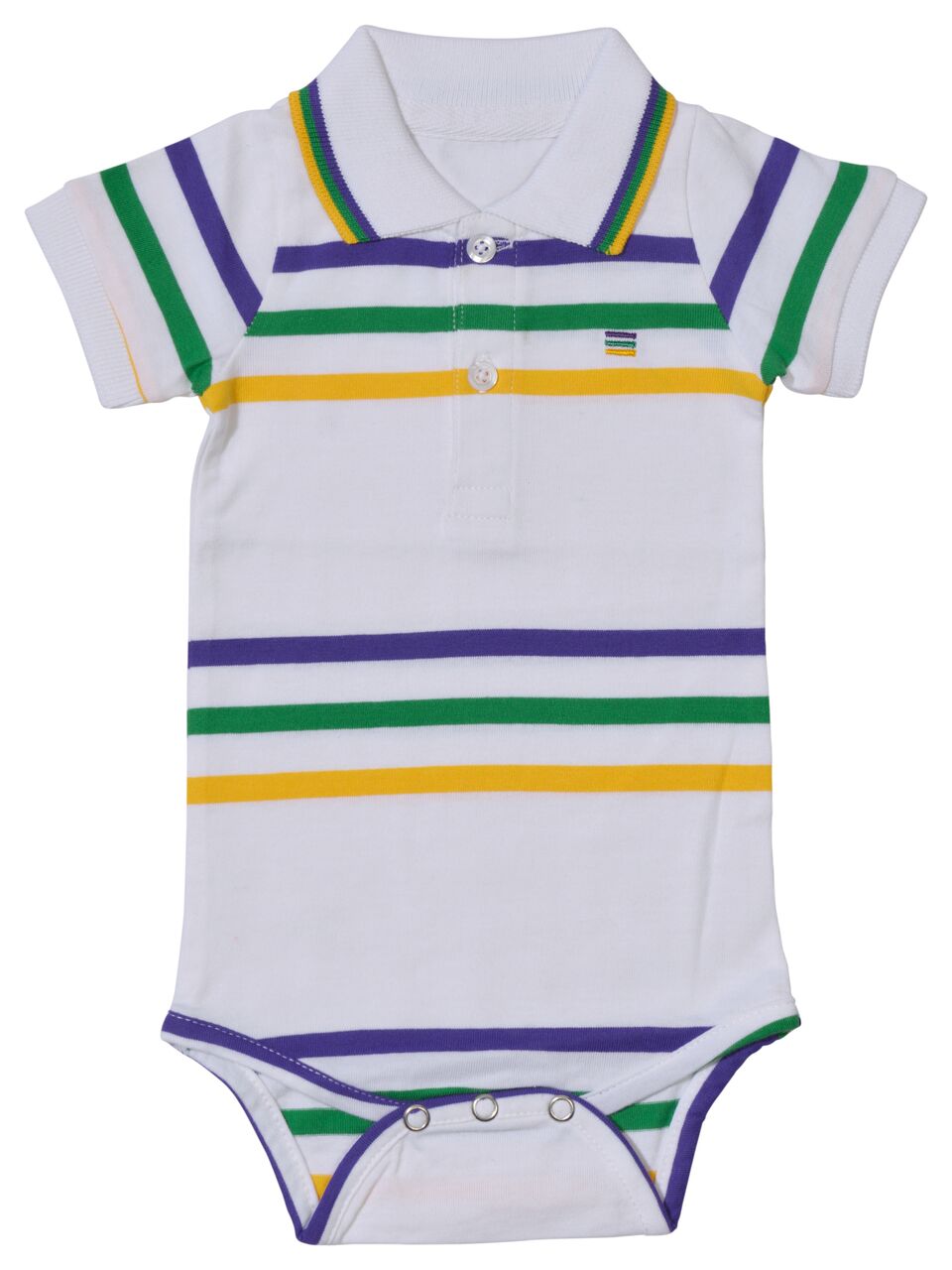 Celebrate Mardi Gras with this stylish white short sleeved onesie with purple, green and gold small infinity stripes. This onesie features thin purple, green and gold solid stripes. Small lines of purple, green and gold are around the edge of the collar. Three snaps are at the bottom.