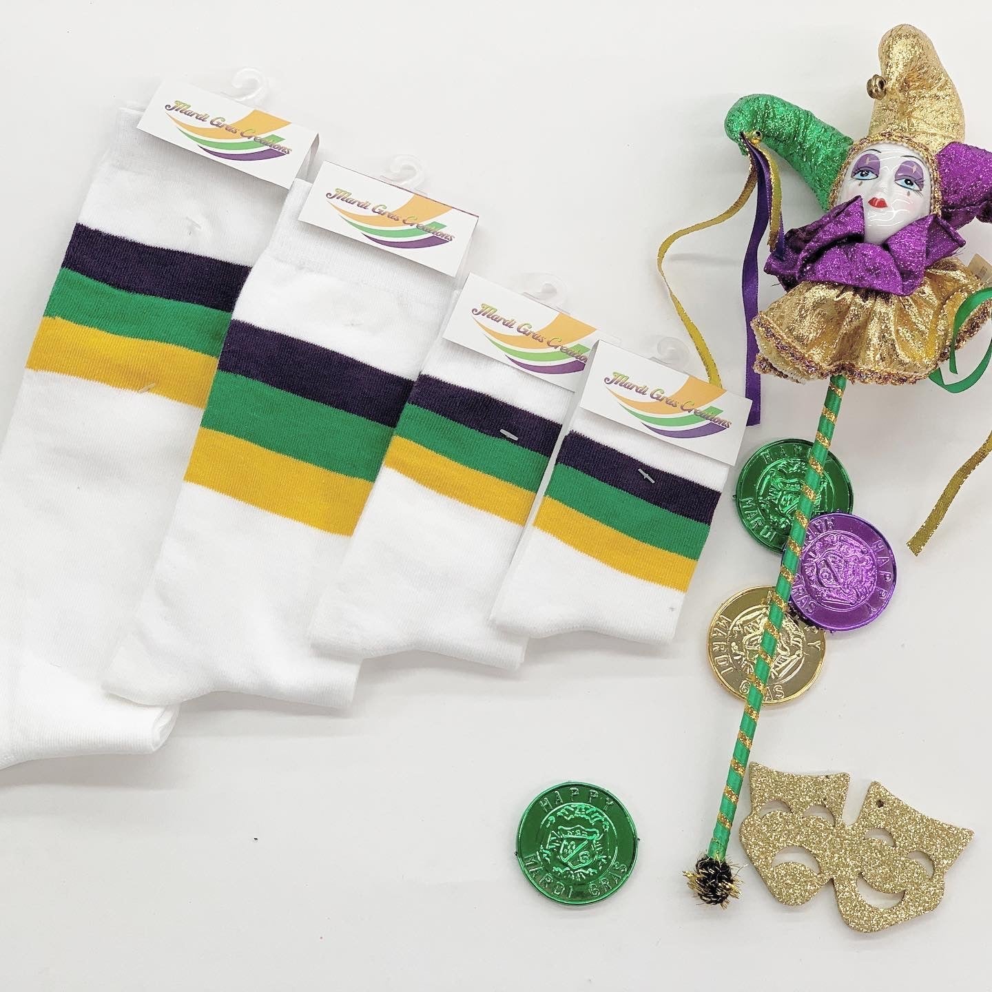 Rock out with your socks out! These white and purple, green and gold stripe socks are fun for any outfit and especially during Mardi Gras!