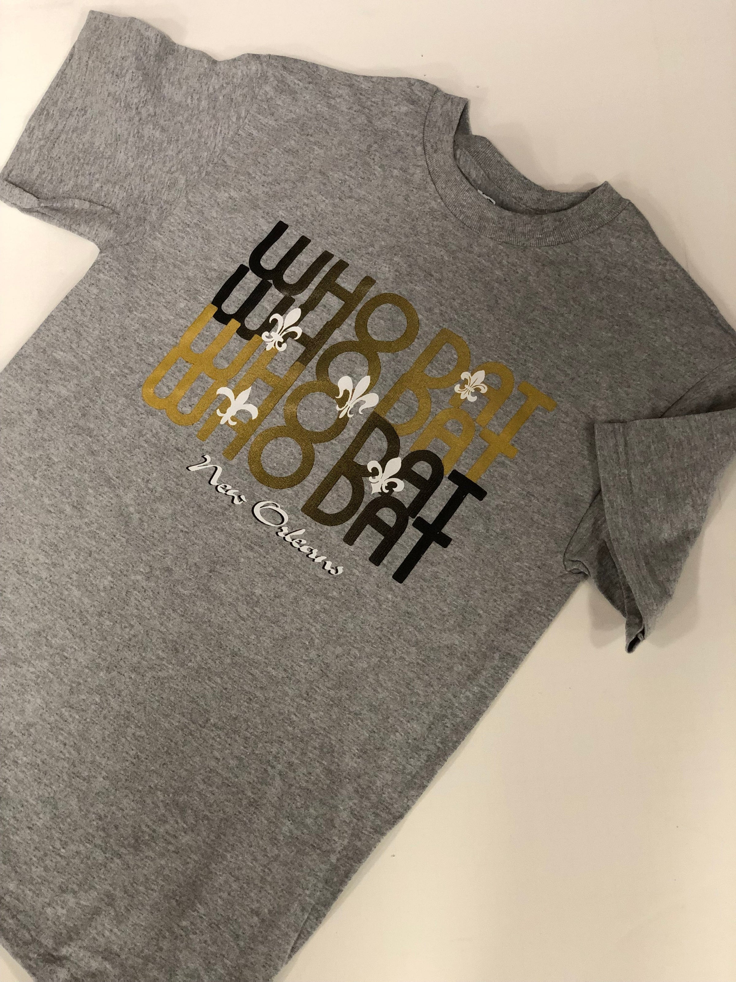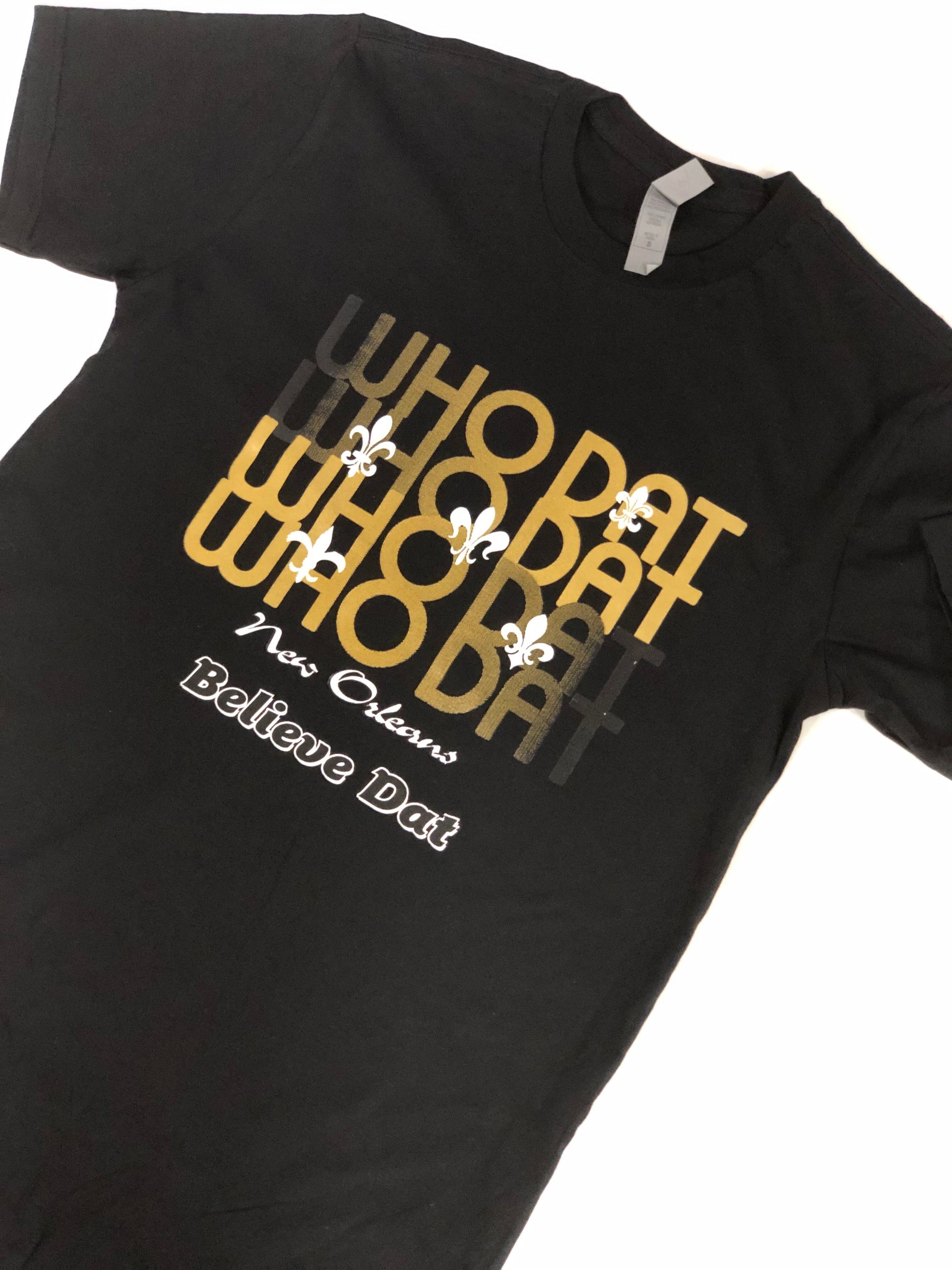 Who Dat in ombre black and gold wordings with white Fleur De Lis and Believe Dat New Orleans