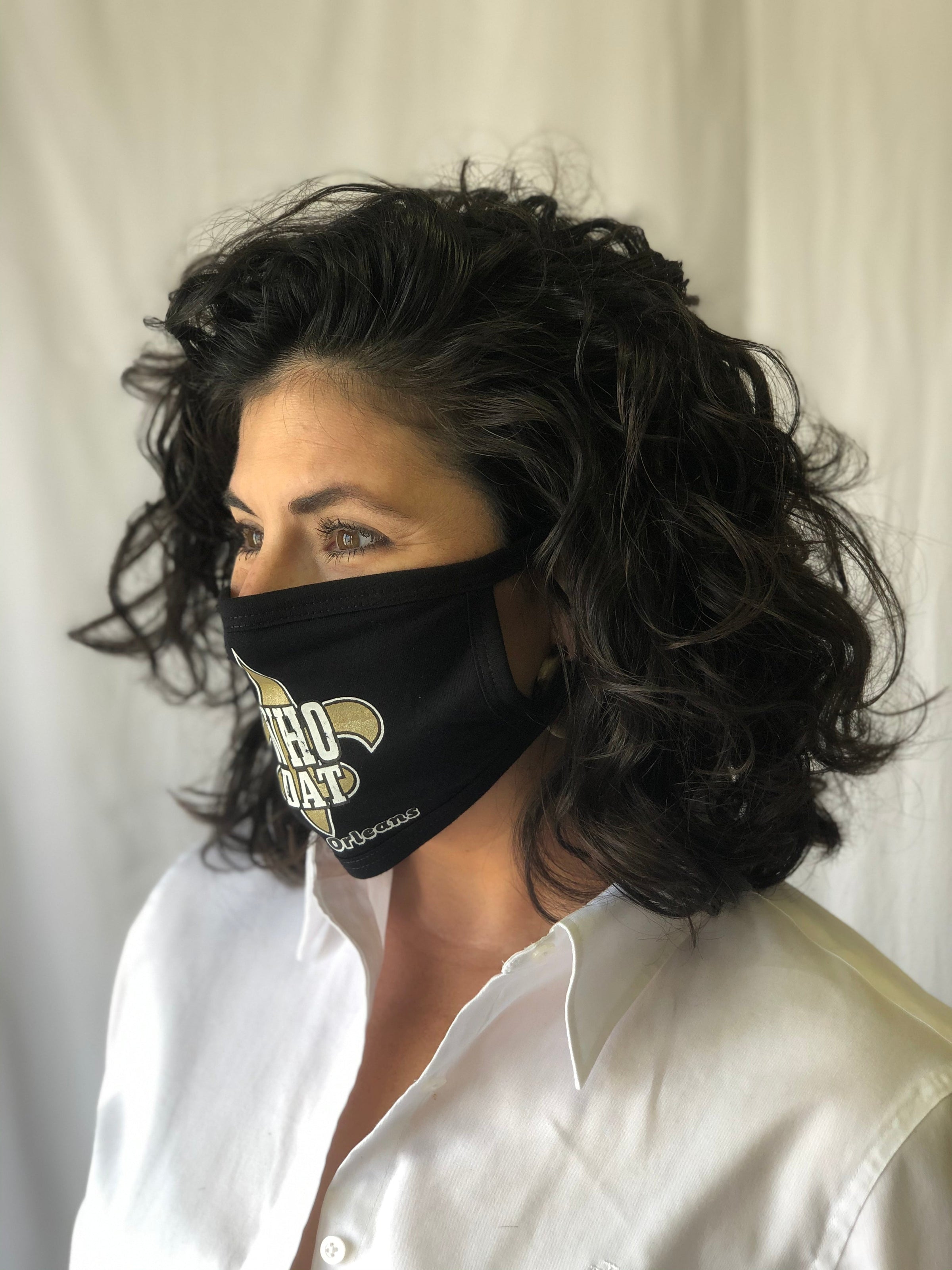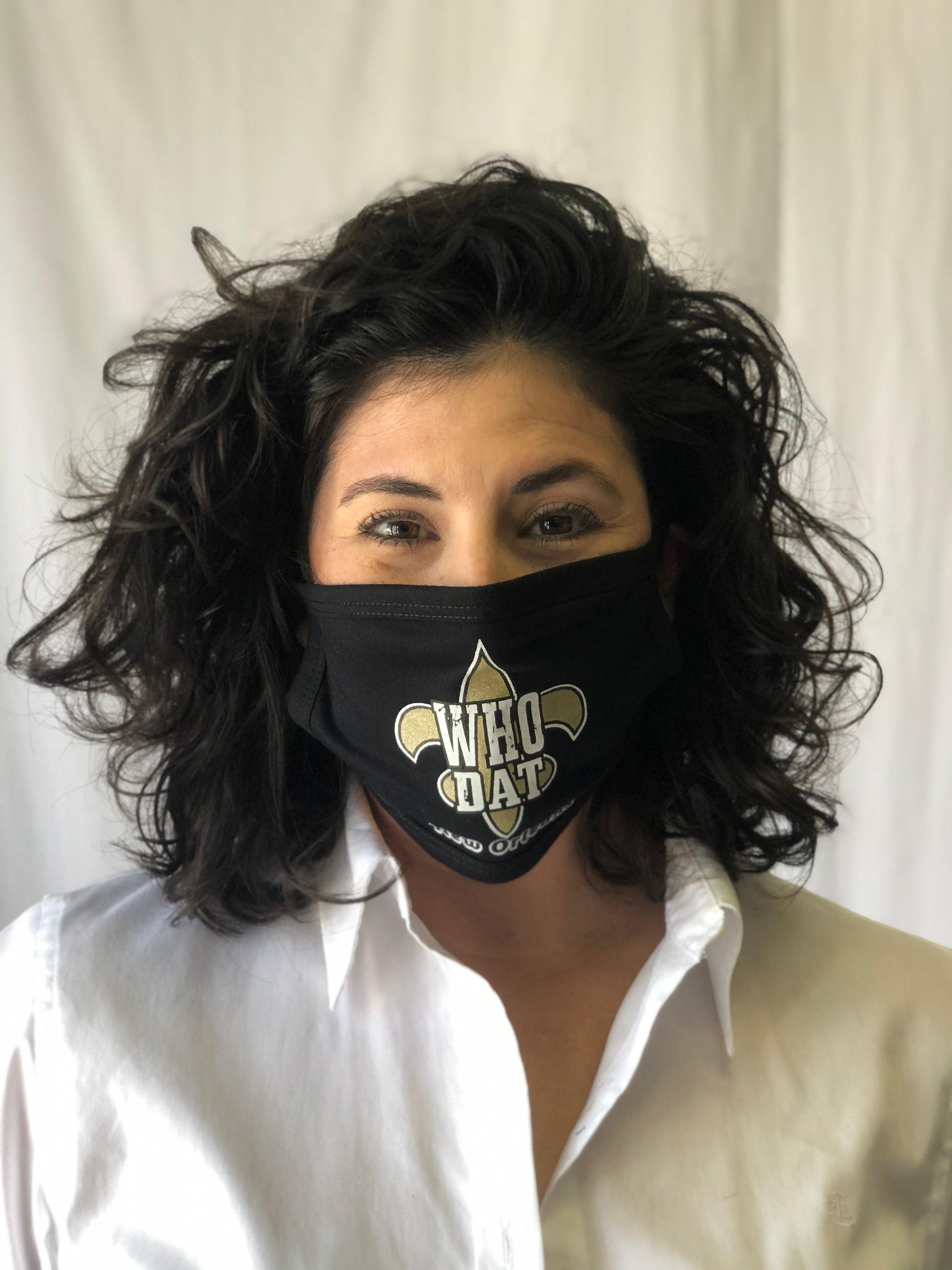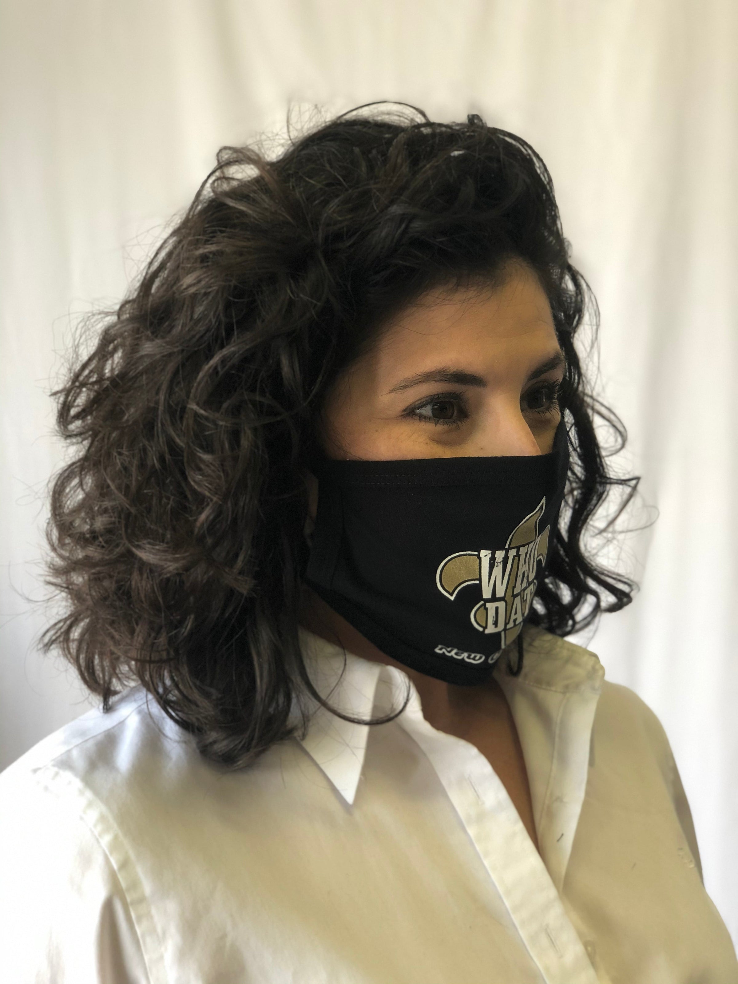 Mask Up in style! This black reusable face mask features a gold fleur de lis and reads "Who Dat". One size fits most.