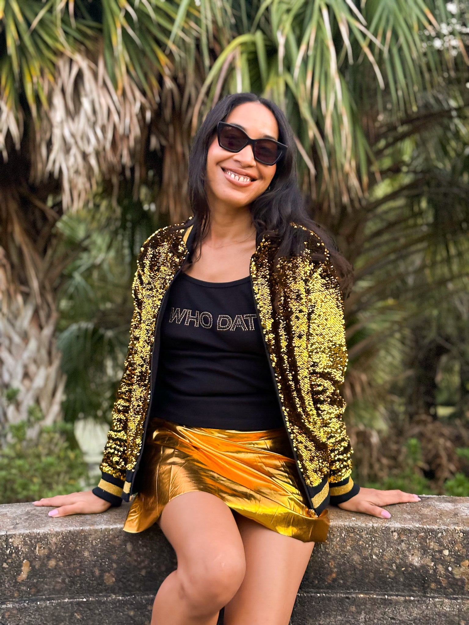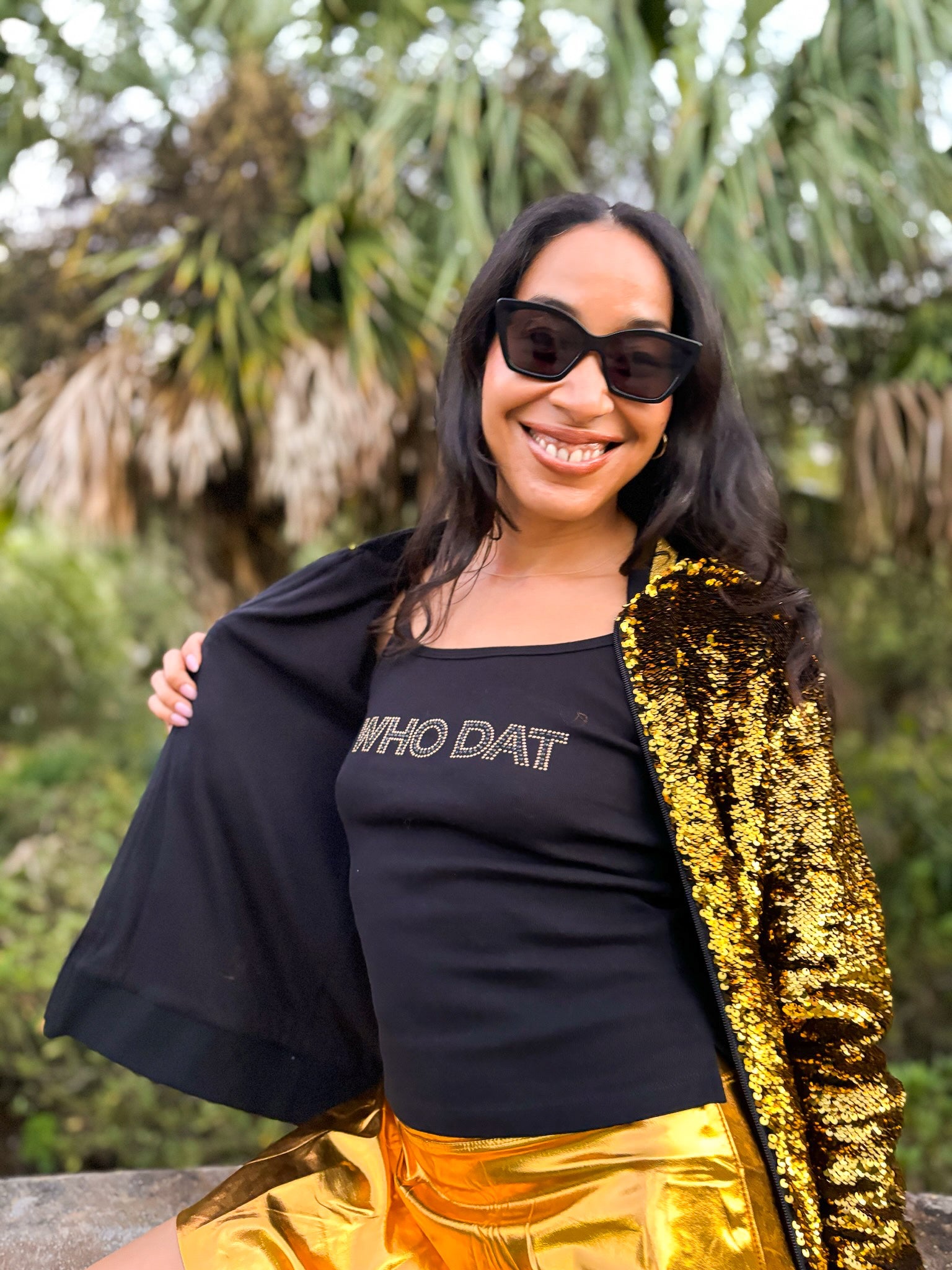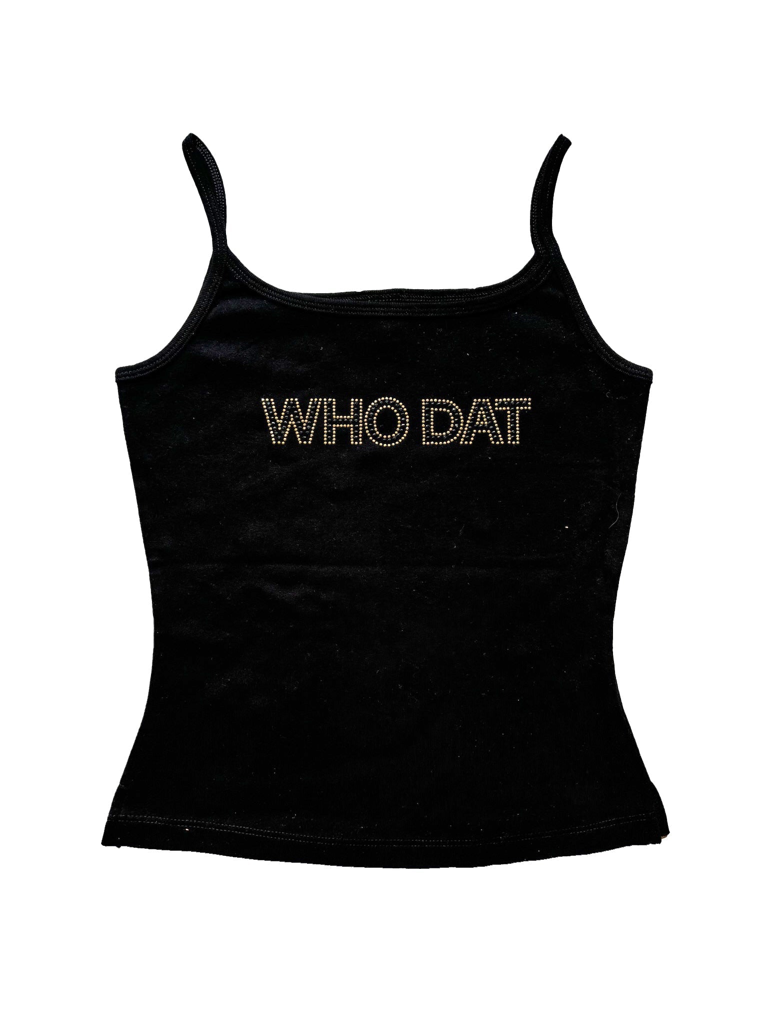 Get ready to cheer on your team in style with our playful and quirky Who Dat Rhinestone Camisole Tank! Perfect for game day, this tank proudly displays your love for the Saints and football with a touch of black and gold bling. Join the fun and show off your team spirit!