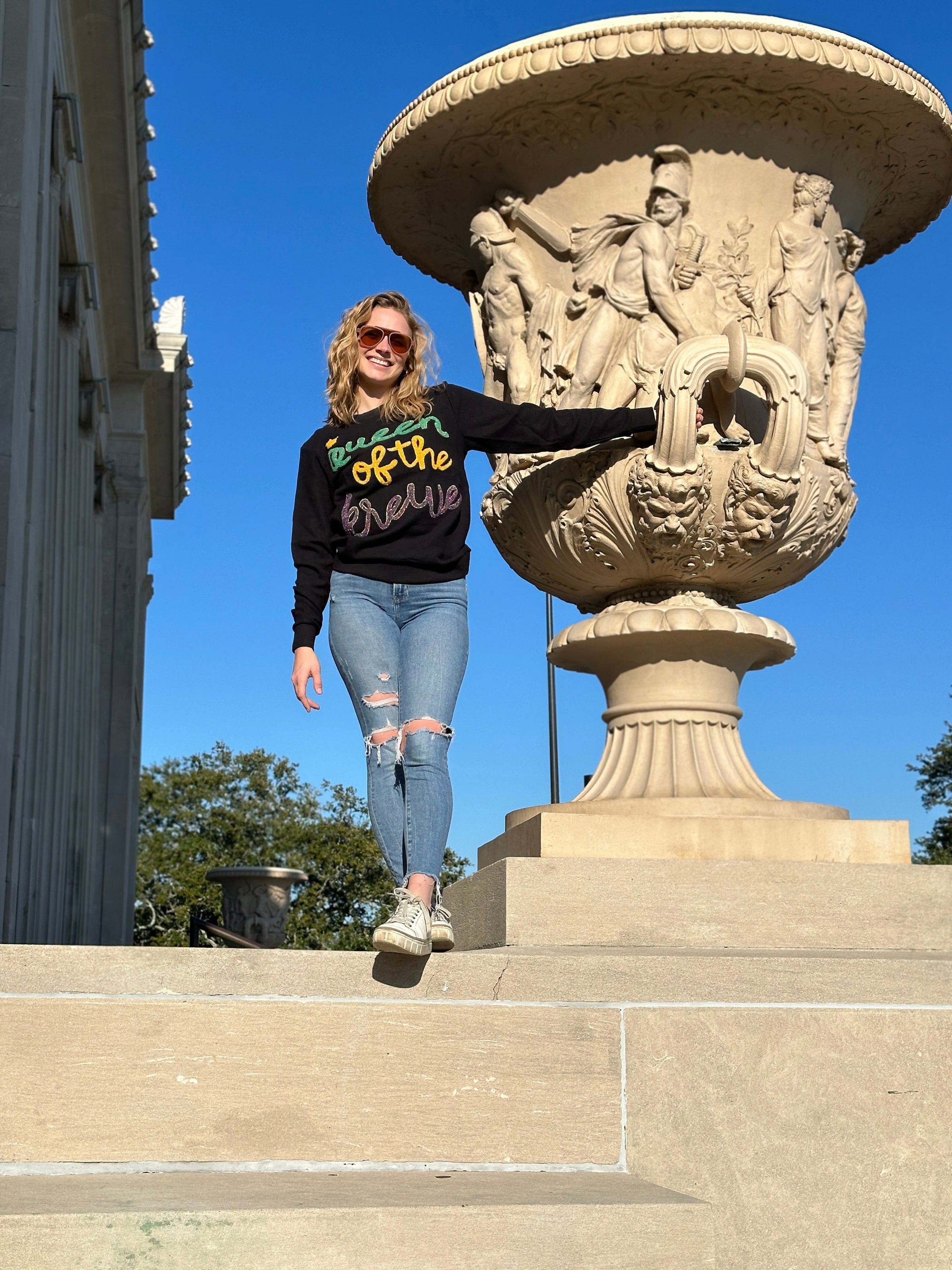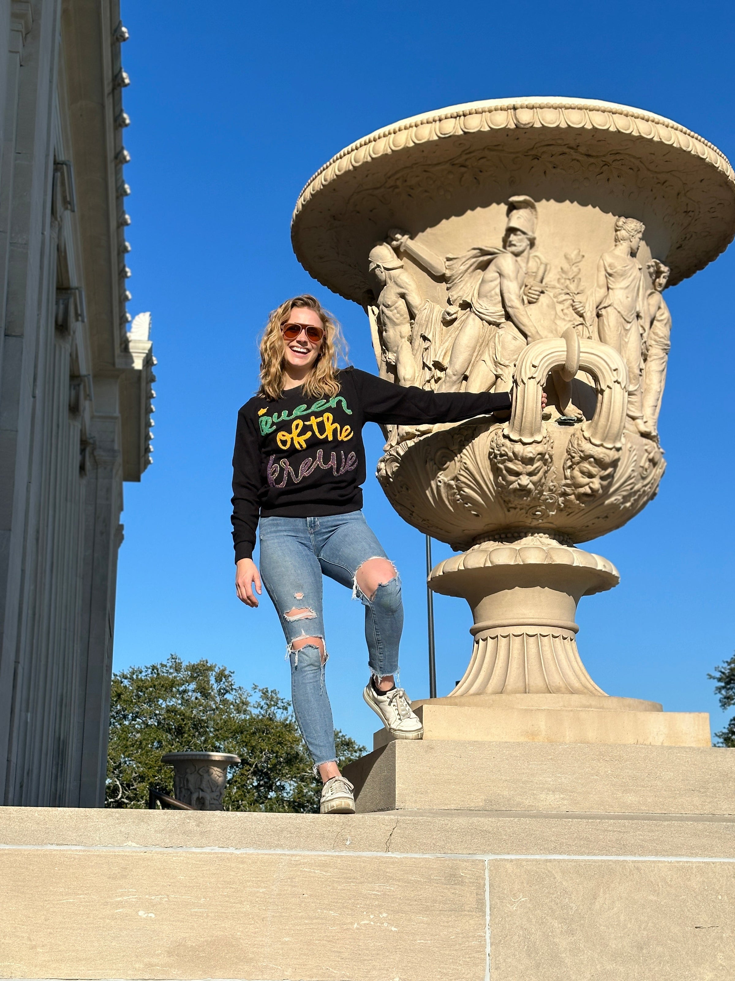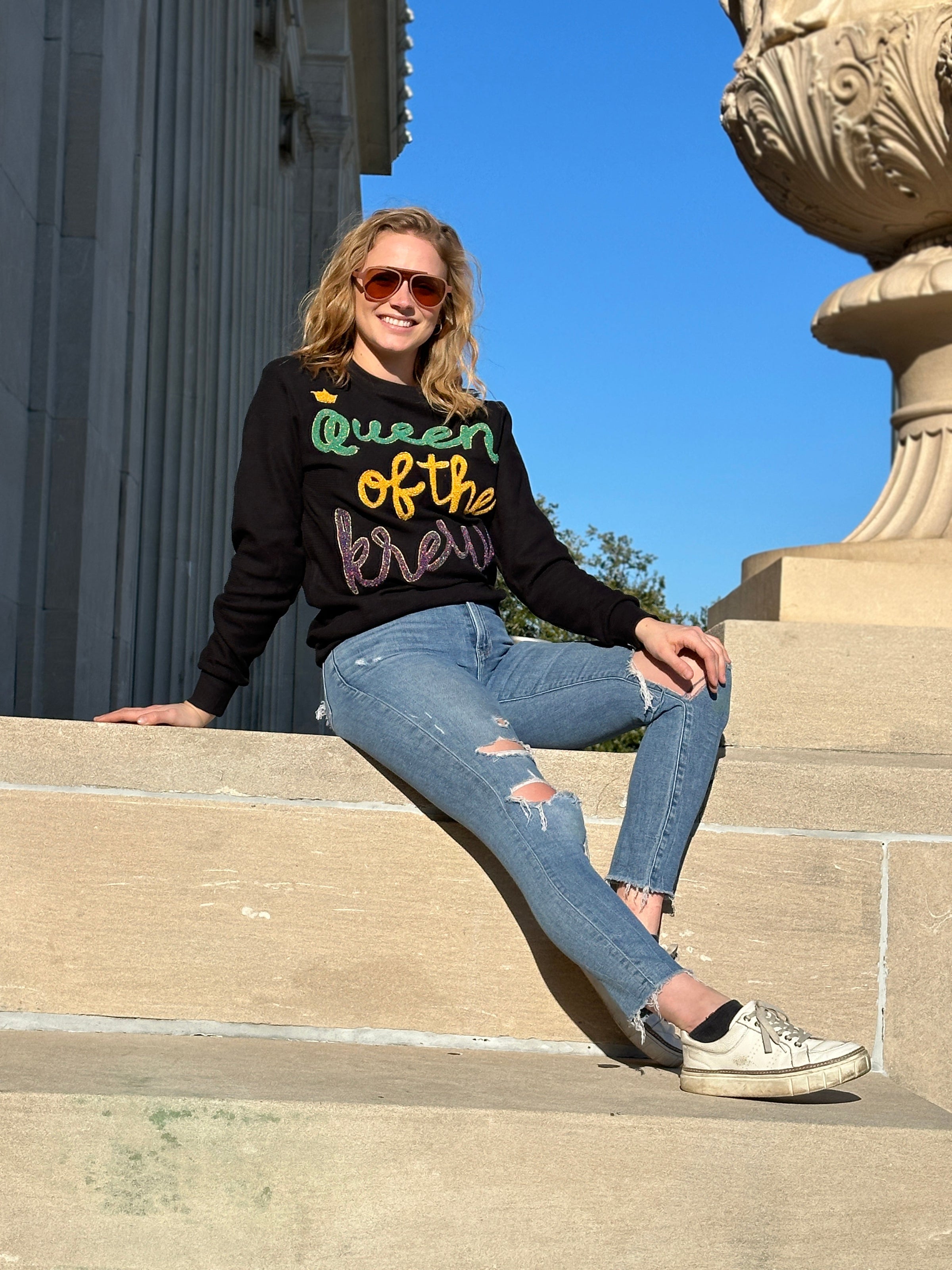 This ASP Adult QUEEN OF THE KREWE Pullover is the perfect symbol of the Mardi Gras festivities. It is crafted with attention to detail, featuring a chain stitched font in purple, green and gold and relaxed fit for added comfort this cold Mardi Gras season.