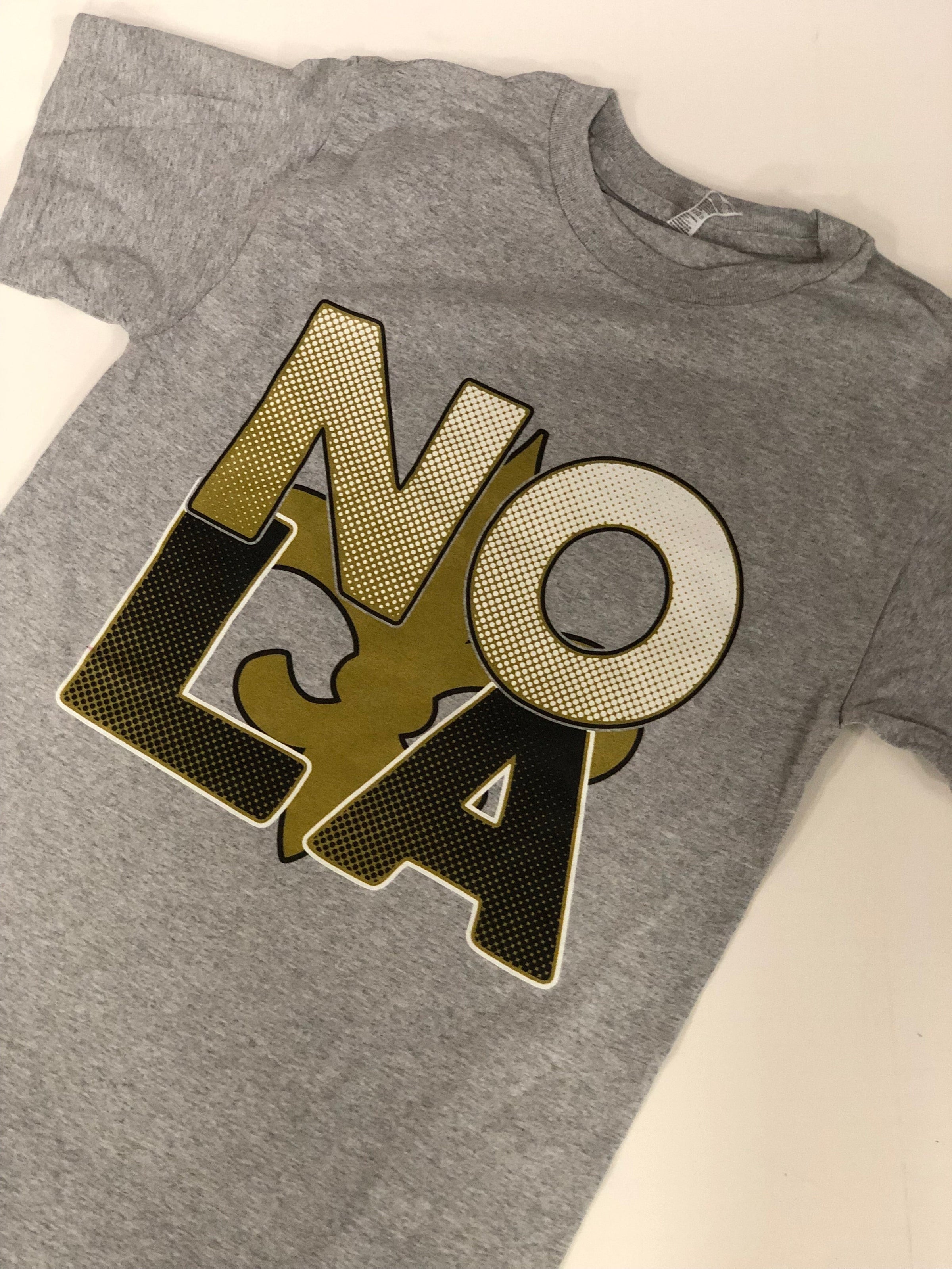 NOLA in a shaded/ombre look in black and gold with a gold Fluer De Lis in the background. New style that's a sure win for the Saints/NOLA fan!